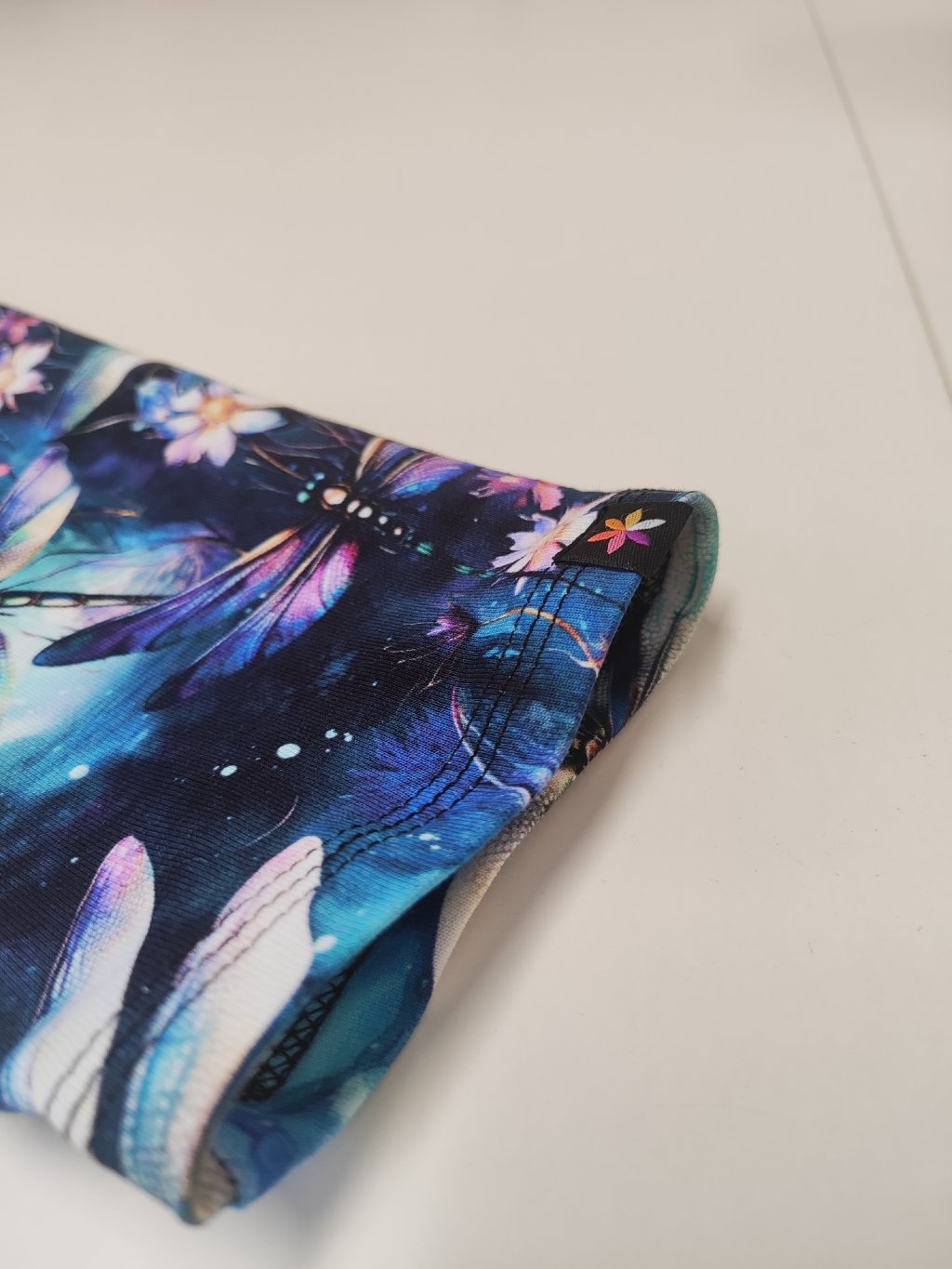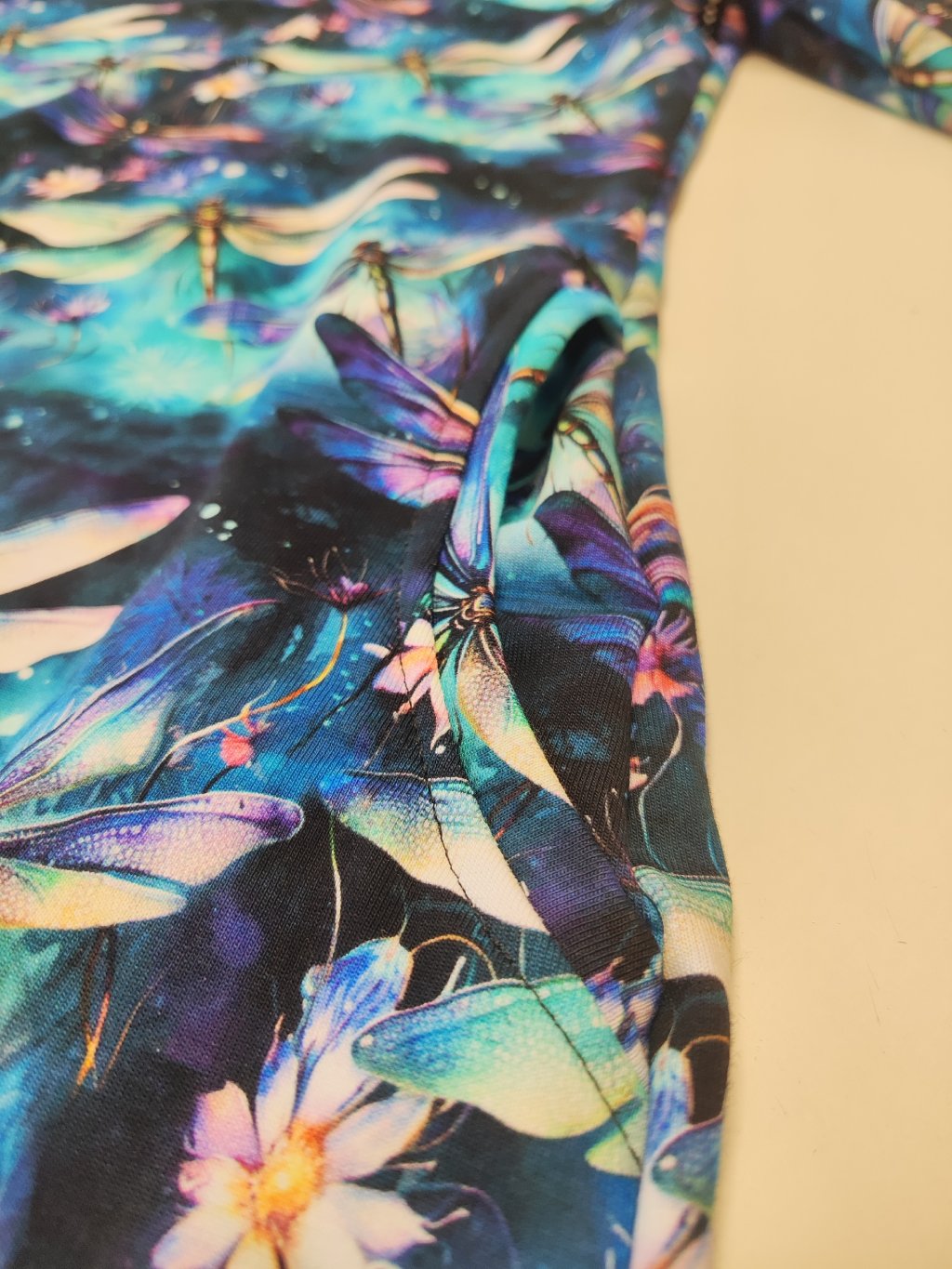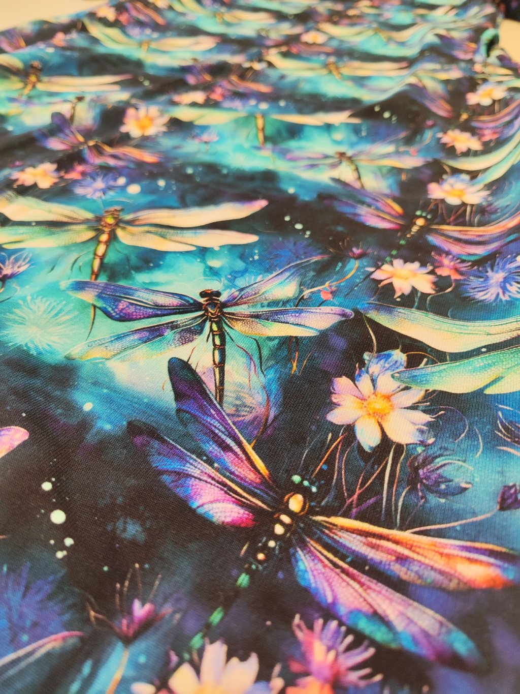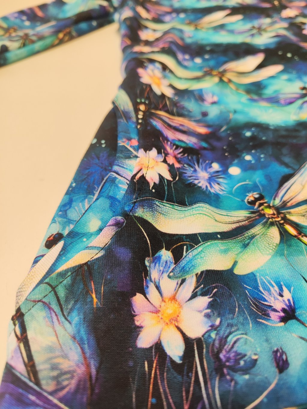 Materiál je výplňový materiál ( mikinovina, nebo tzv. Teplakovina) se vzorem vážek v modrých odstínech.