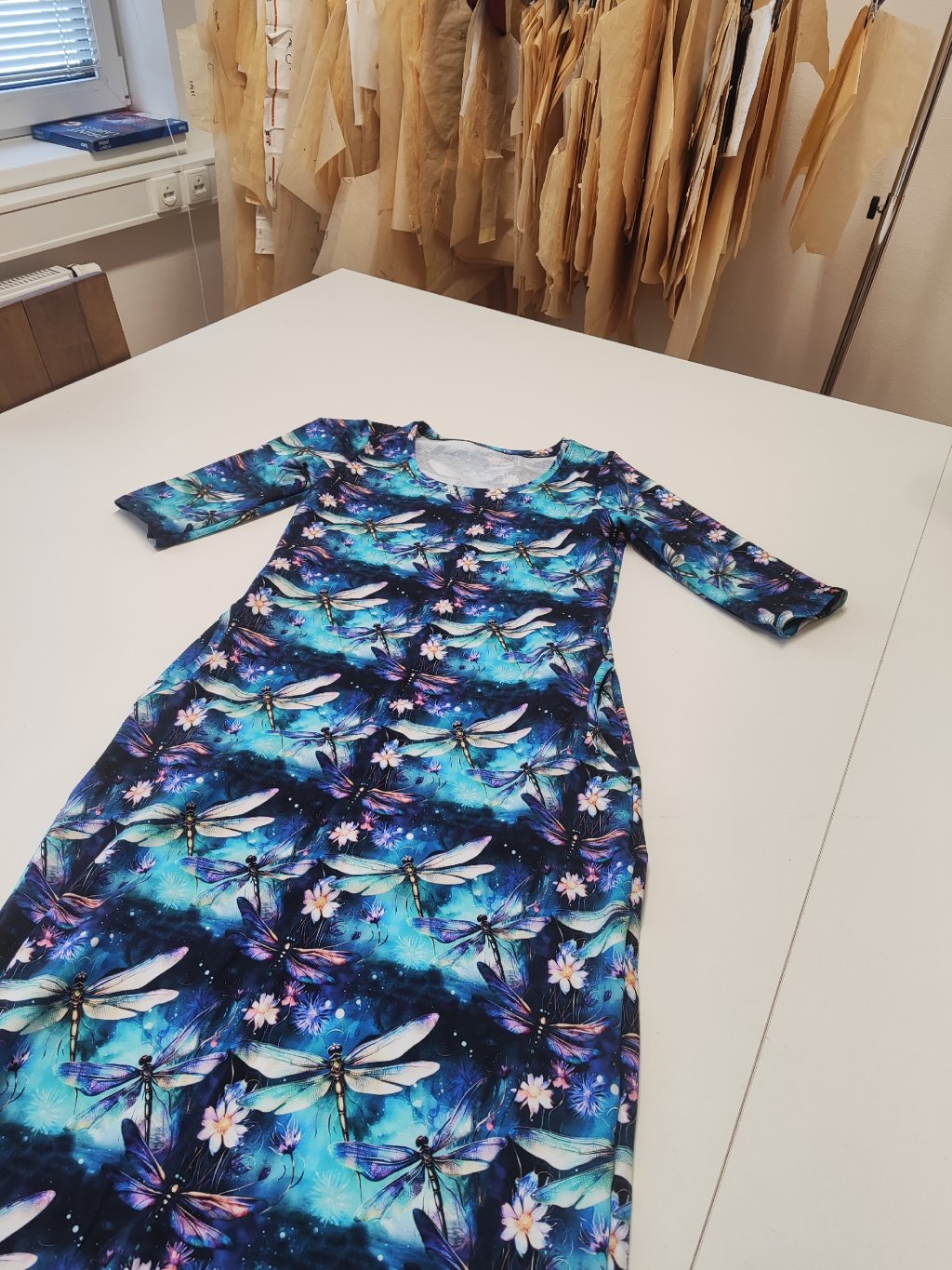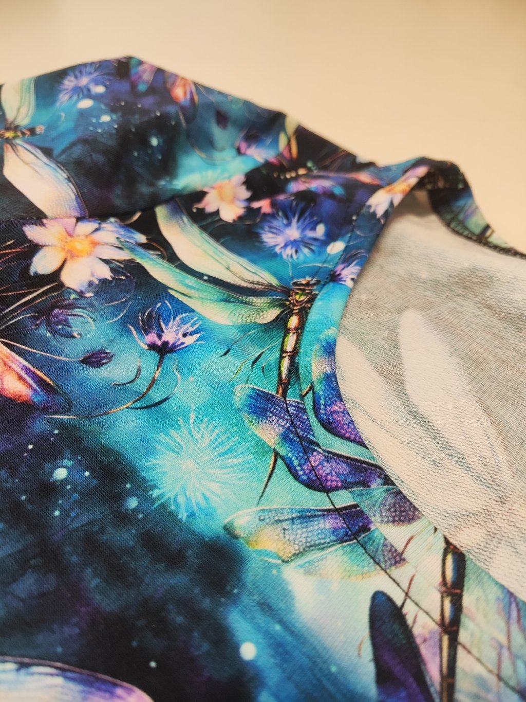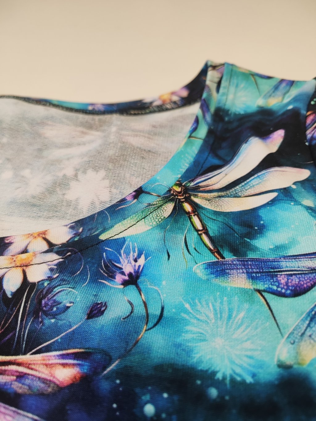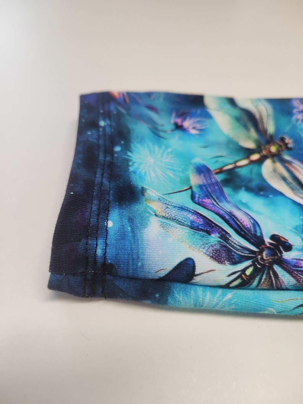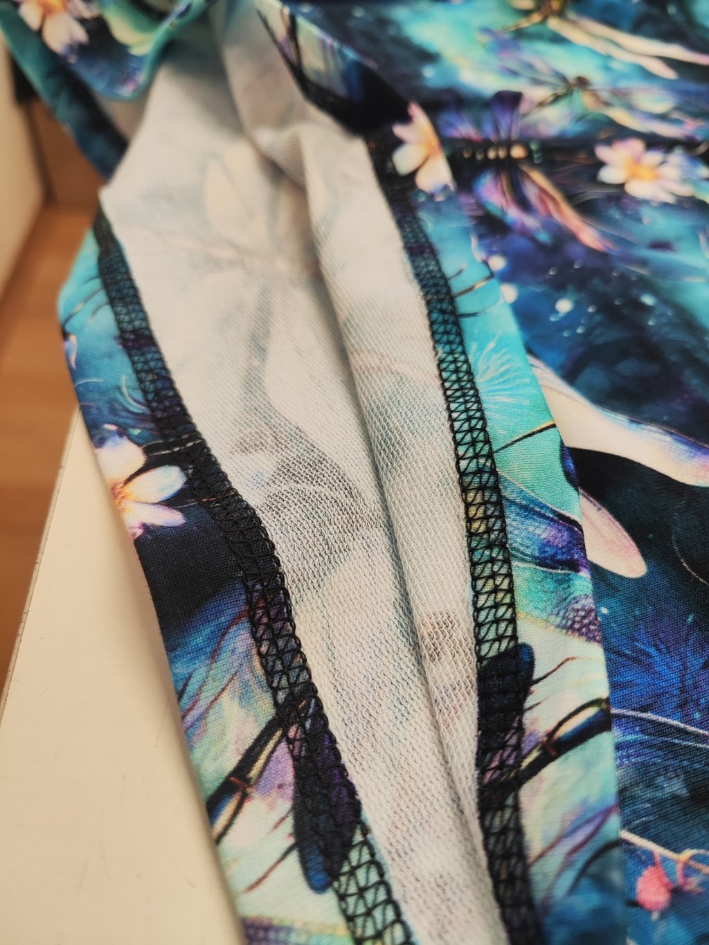 Materiál je výplňový materiál ( mikinovina, nebo tzv. Teplakovina) se vzorem vážek v modrých odstínech.