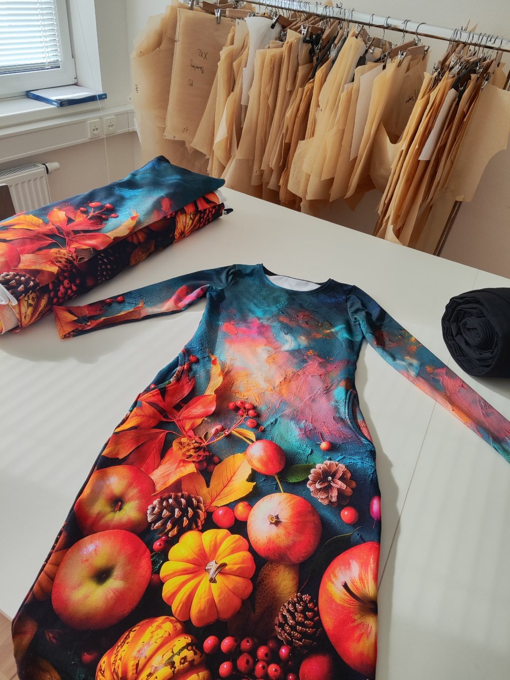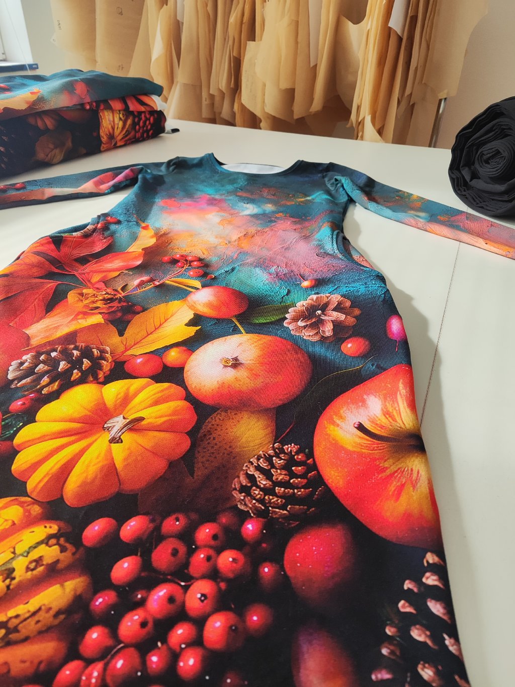 Materiál je výplňový materiál ( mikinovina, nebo tzv. Teplakovina) se vzorem jablek a podzimních plodů.