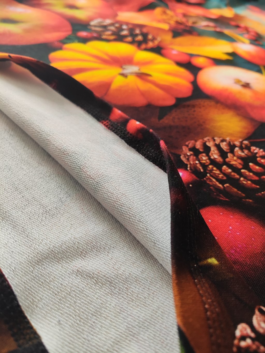 Materiál je výplňový materiál ( mikinovina, nebo tzv. Teplakovina) se vzorem jablek a podzimních plodů.