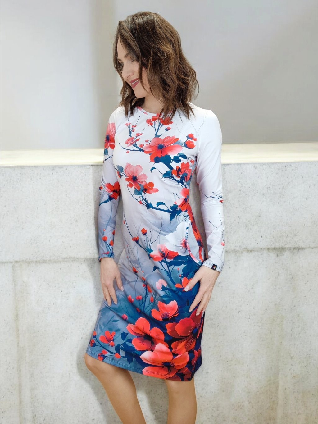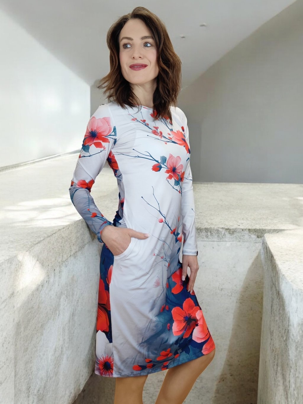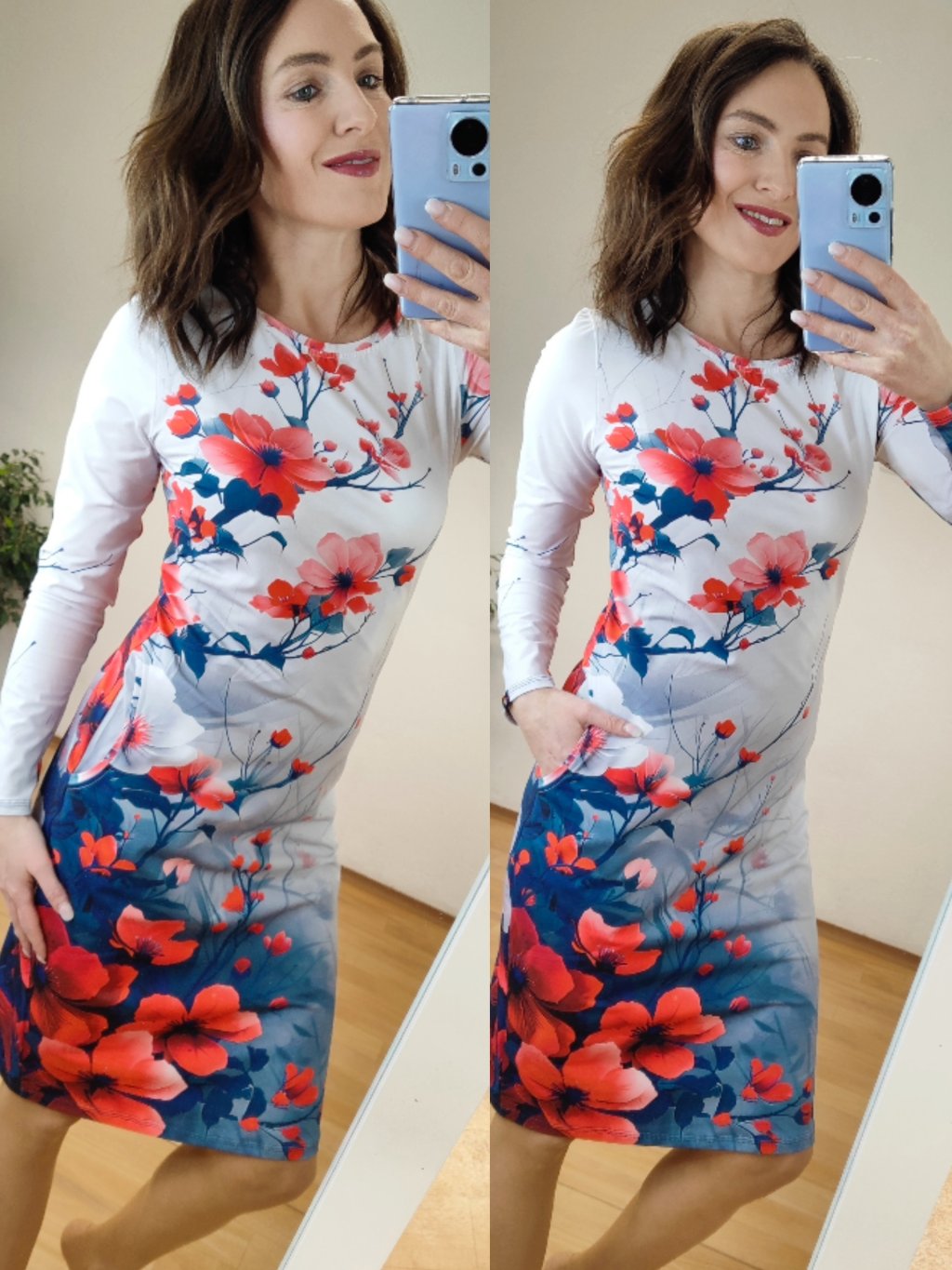 Šaty mají střih, který tvaruje siluetu, ale zůstává pohodlný i při celodenním nošení. Délku šatů si můžete zvolit podle sebe — až do 105 cm, stejně jako délku a typ rukávu. Praktické kapsy dodávají modelu uvolněnost i funkčnost. Všechny varianty jsou šité s důrazem na kvalitu, detail a preciznost – jak je u naší lokální značky ŠatySukně samozřejmostí.