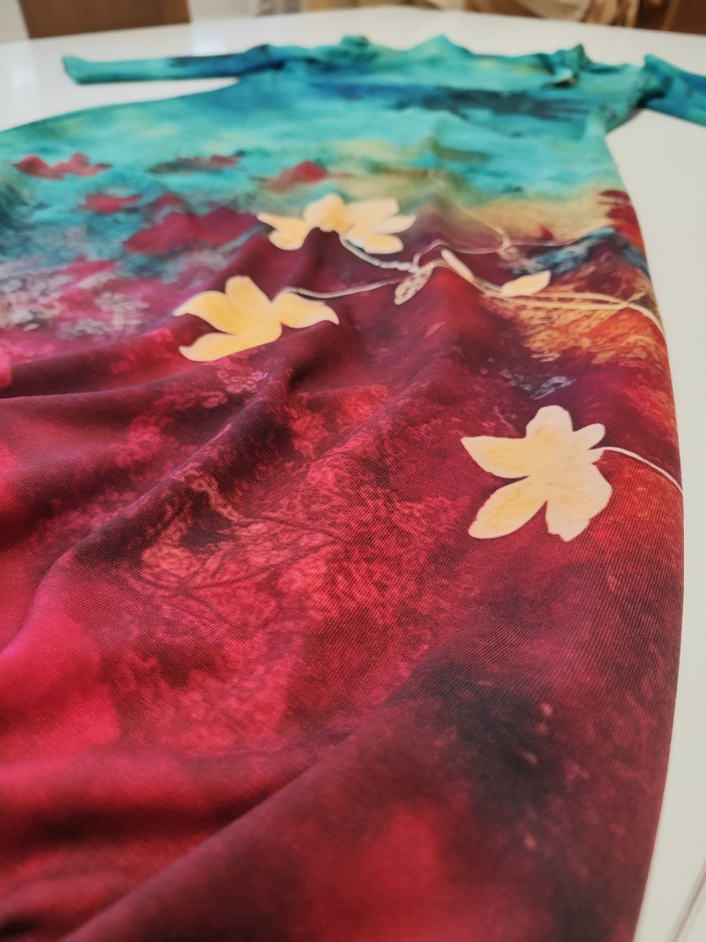 Barva šatů připomíná tajemný podzimní les ponořený do smaragdových tónů. Syté odstíny zelené přecházejí do teplých červených a vínových akcentů, jako by na látce tančily listy v posledních paprscích slunce. Jemné světlejší motivy květů působí jako záblesky světla, které šatům dodávají kouzelnou hloubku.