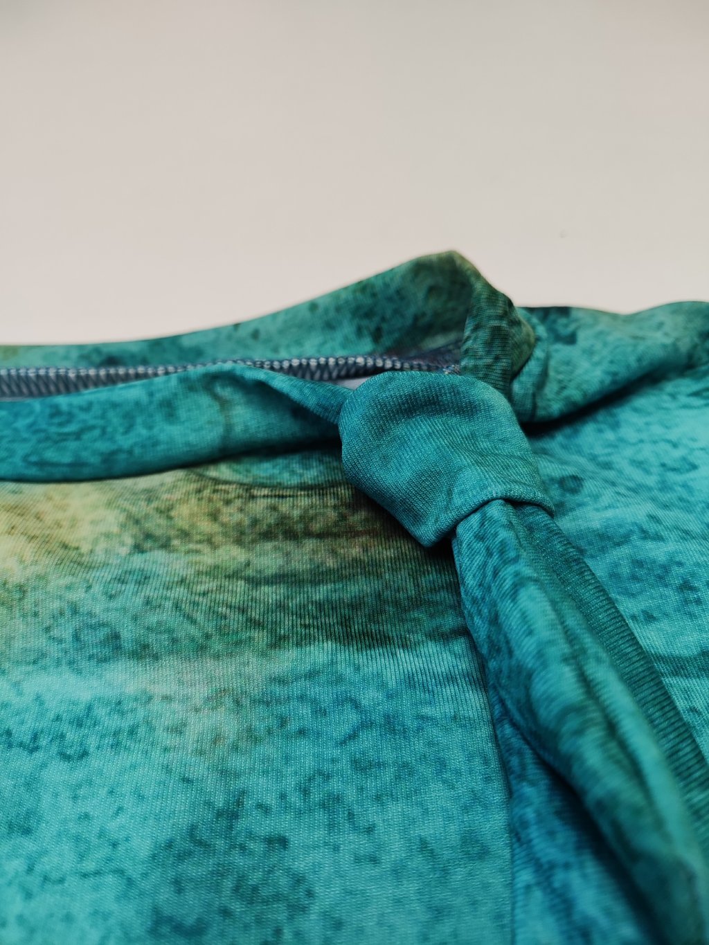 Šaty jsou ušité v mírně balónkovém střihu, který jemně kopíruje linii těla a v oblasti sukně se lehce rozšiřuje. Přes trup jsou přiléhavé, takže krásně modelují postavu. Rukávy jsou 3/4 s možností úpravy na dlouhé, v ramenou mají decentní řasení, které dodává šatům ženskost a lehkost. U krku je ozdobná mašle, která dotváří elegantní vzhled.