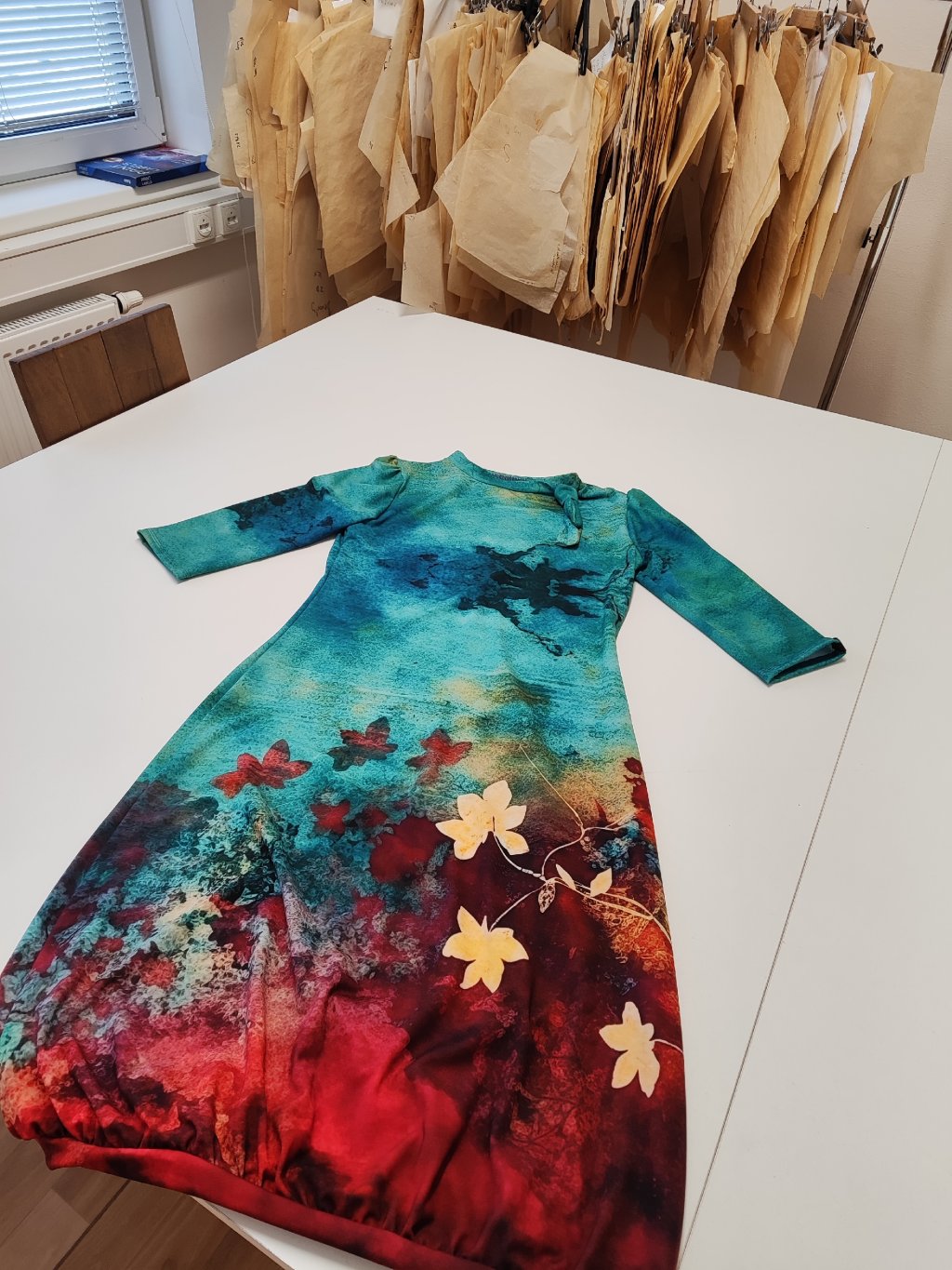 Materiál je polyester - středně silný, nemačkavý, stálobarevný. Šaty ideální na cesty, do kufru. Víc o materiálu v odstavci O polyesteru s respektem k přírodě.