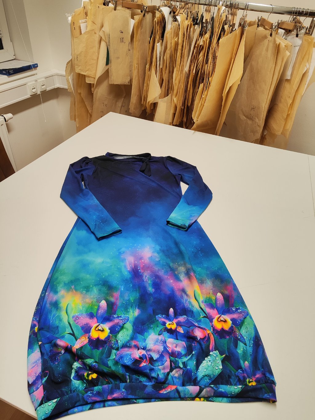 Materiál je polyester - středně silný, nemačkavý, stálobarevný. Šaty ideální na cesty, do kufru. Víc o materiálu v odstavci O polyesteru s respektem k přírodě.
