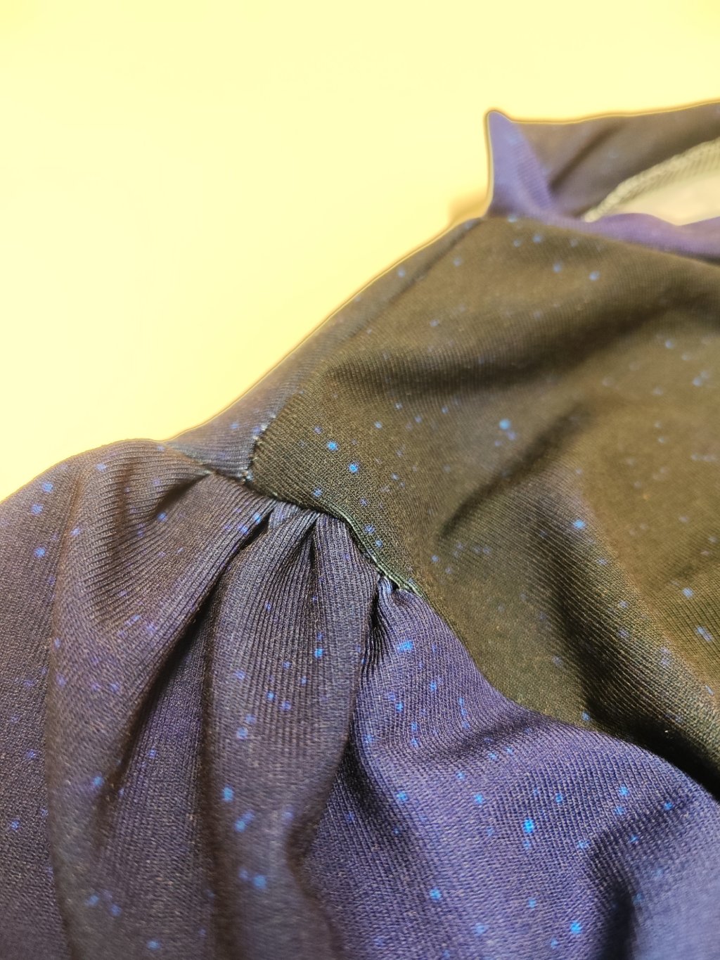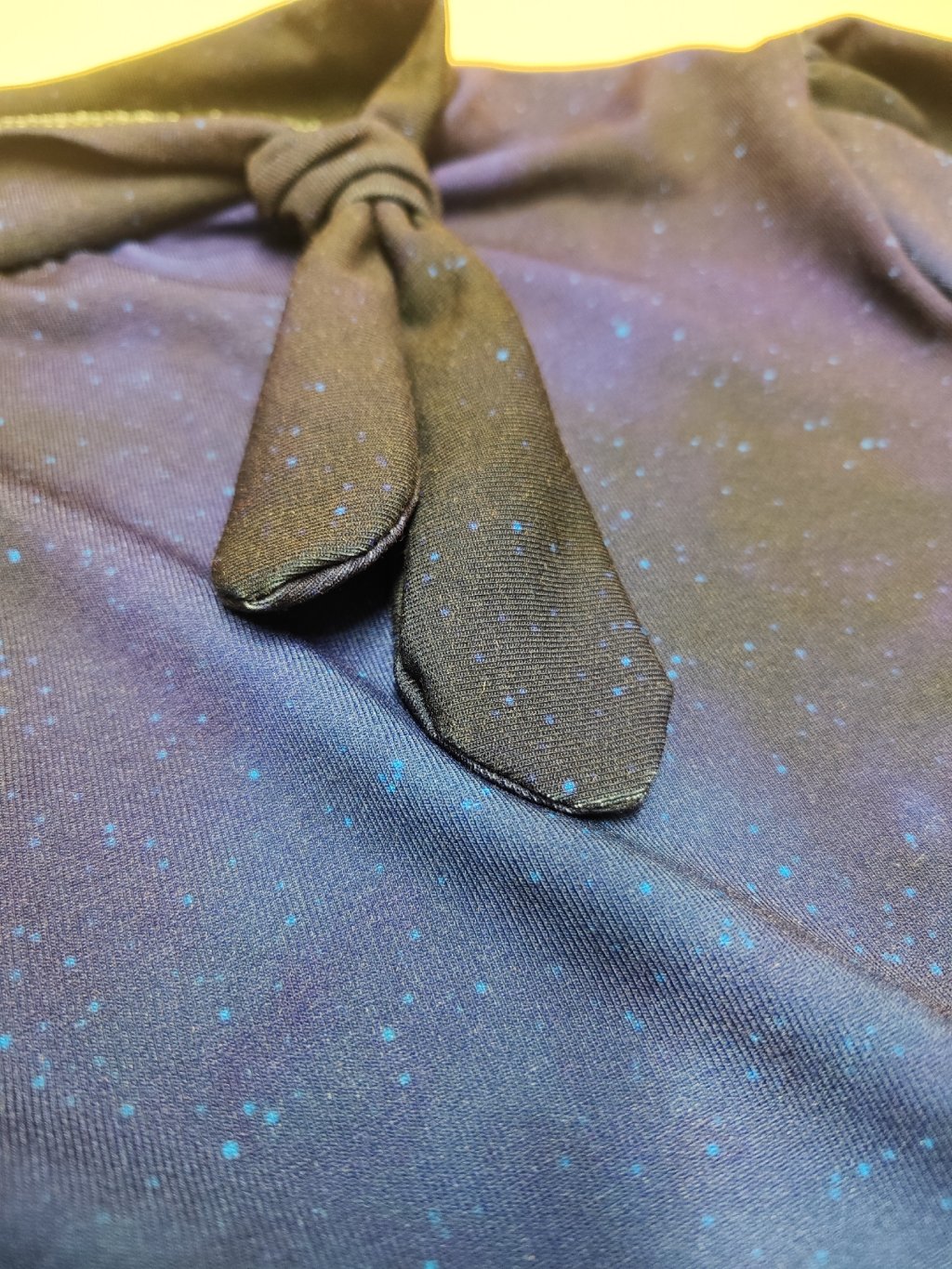 Šaty jsou ušité v mírně balónkovém střihu, který jemně kopíruje linii těla a v oblasti sukně se lehce rozšiřuje. Přes trup jsou přiléhavé, takže krásně modelují postavu. Rukávy jsou dlouhé, s možností úpravy na 3/4, v ramenou mají decentní řasení, které dodává šatům ženskost a lehkost. U krku je ozdobná mašle, která dotváří elegantní vzhled.