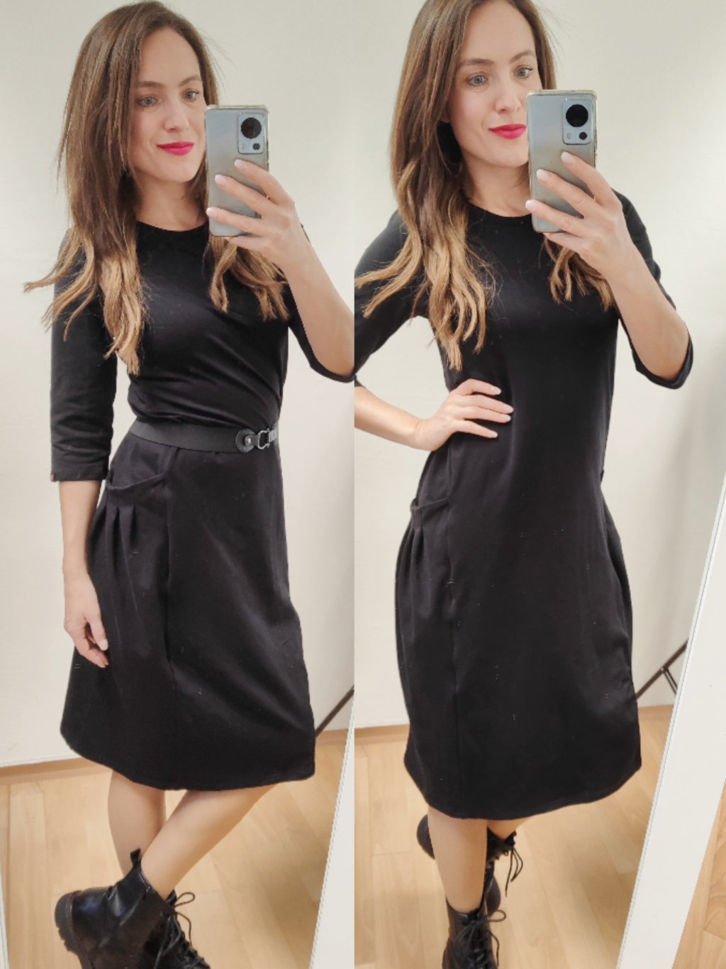 Šaty mají pohodlný polopřiléhavý střih, který krásně kopíruje postavu, ale zároveň poskytuje volnost pohybu. Kapsy v bocích jsou hluboké a doplněné rafinovaným řasením, což je detail, který zaujme i potěší. V horní části je jemný kulatý výstřih, který lichotí dekoltu. Rukávy lze mít 3/4 délky (standardně) nebo dle přání dlouhé – a délku šatů přizpůsobíme vašim preferencím.
