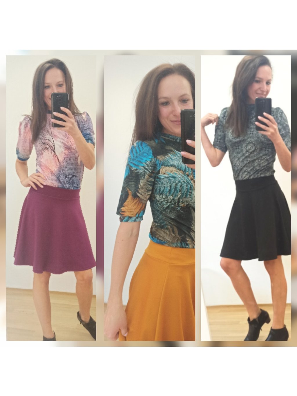 V pase mají šaty ozdobný lem a našitou půlkolovou suknici. Šaty jsou tzv. 2v1. Vypadají jako sukně a tričko, ale jedná se