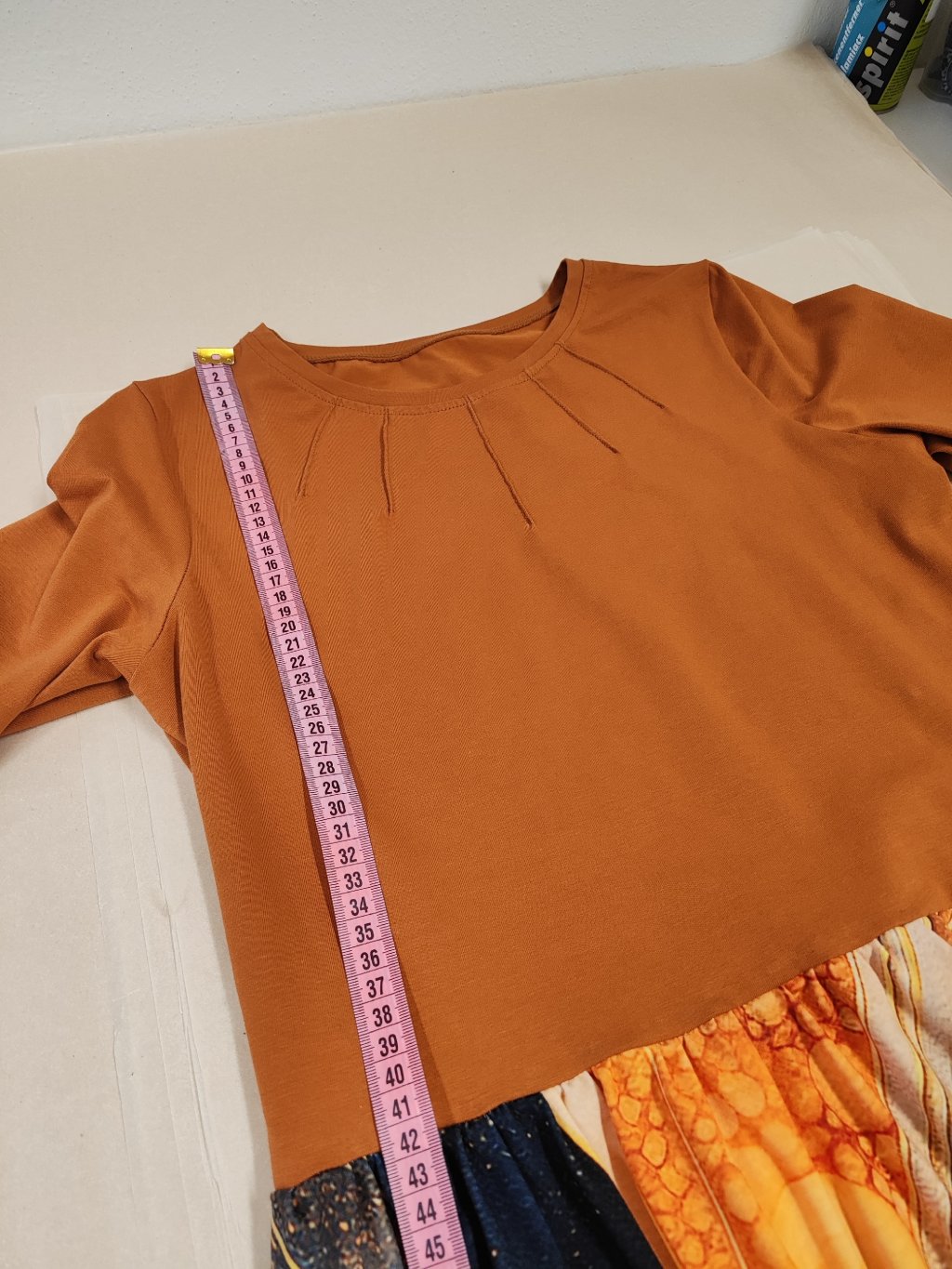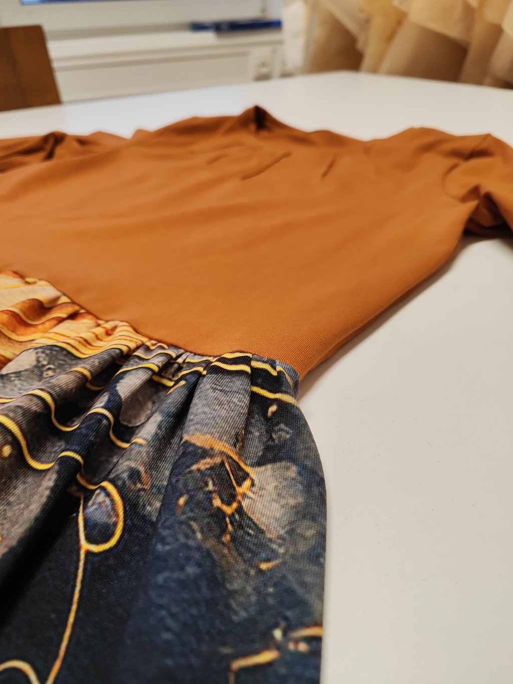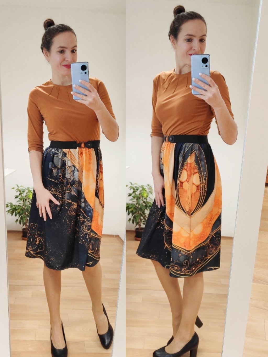 Šaty mají přiléhavý skořicový živůtek s 3/4 rukávy a nařasenou sukní do pasu. U výstřihu je zdobení sámky.