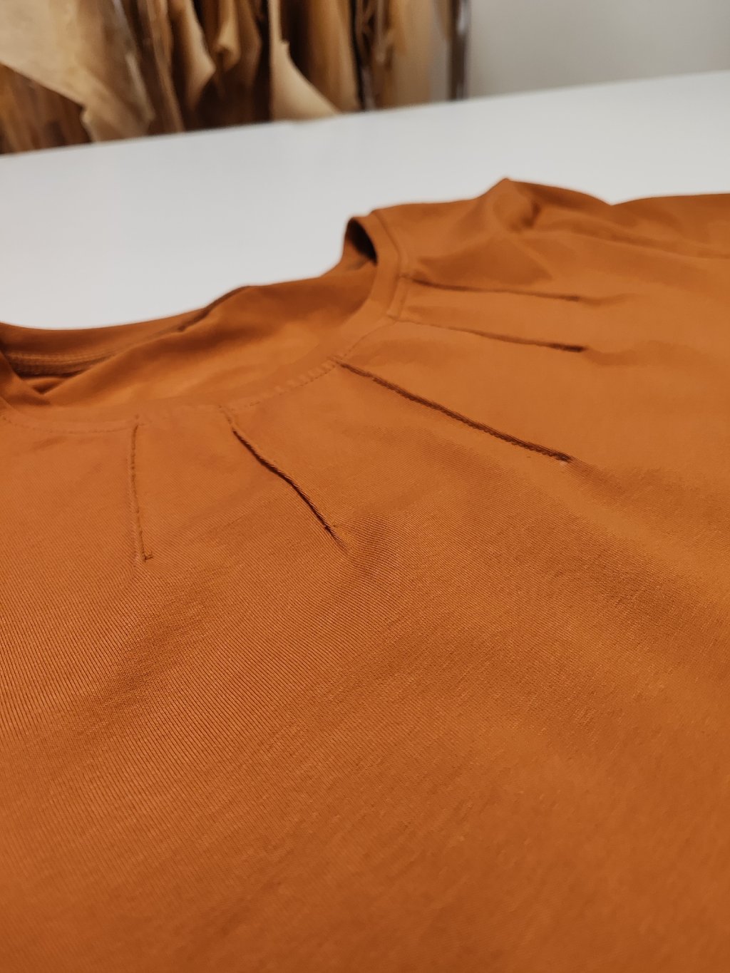 Šaty mají lichotivý střih, který opticky prodlužuje postavu a zvýrazňuje ženské linie. U krku jsou zdobené jemnými sámky, které působí elegantně a dodávají šatům jedinečný detail. Střih působí subtilně a žensky, je dostatečně volný, aby poskytl pohodlí při pohybu. Materiál se lehce vlní a při chůzi vytváří měkký, elegantní pohyb.