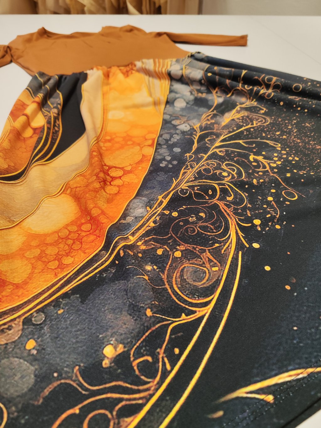 Černá s motivem zlatých vln a ornamentů. Živůtek skořicový.