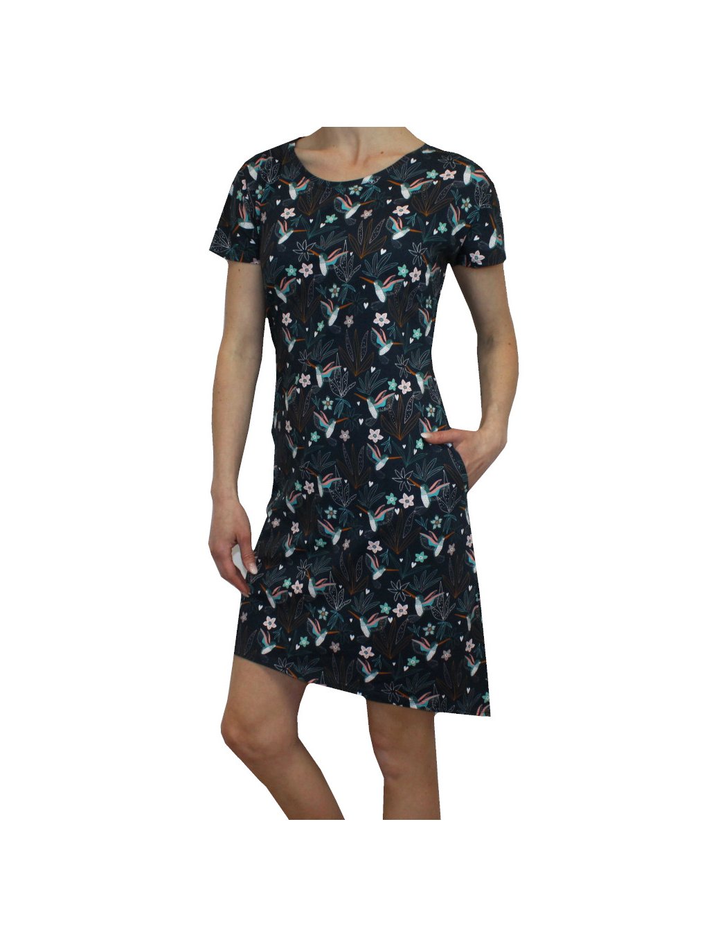 Dámské šaty volnějšího střihu HANAH, delší zadní díl, ptáčci
