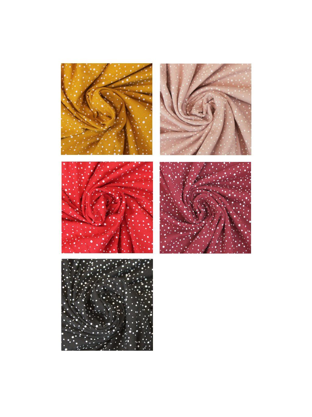 Látka na tričko má bílé drobné puntíky.