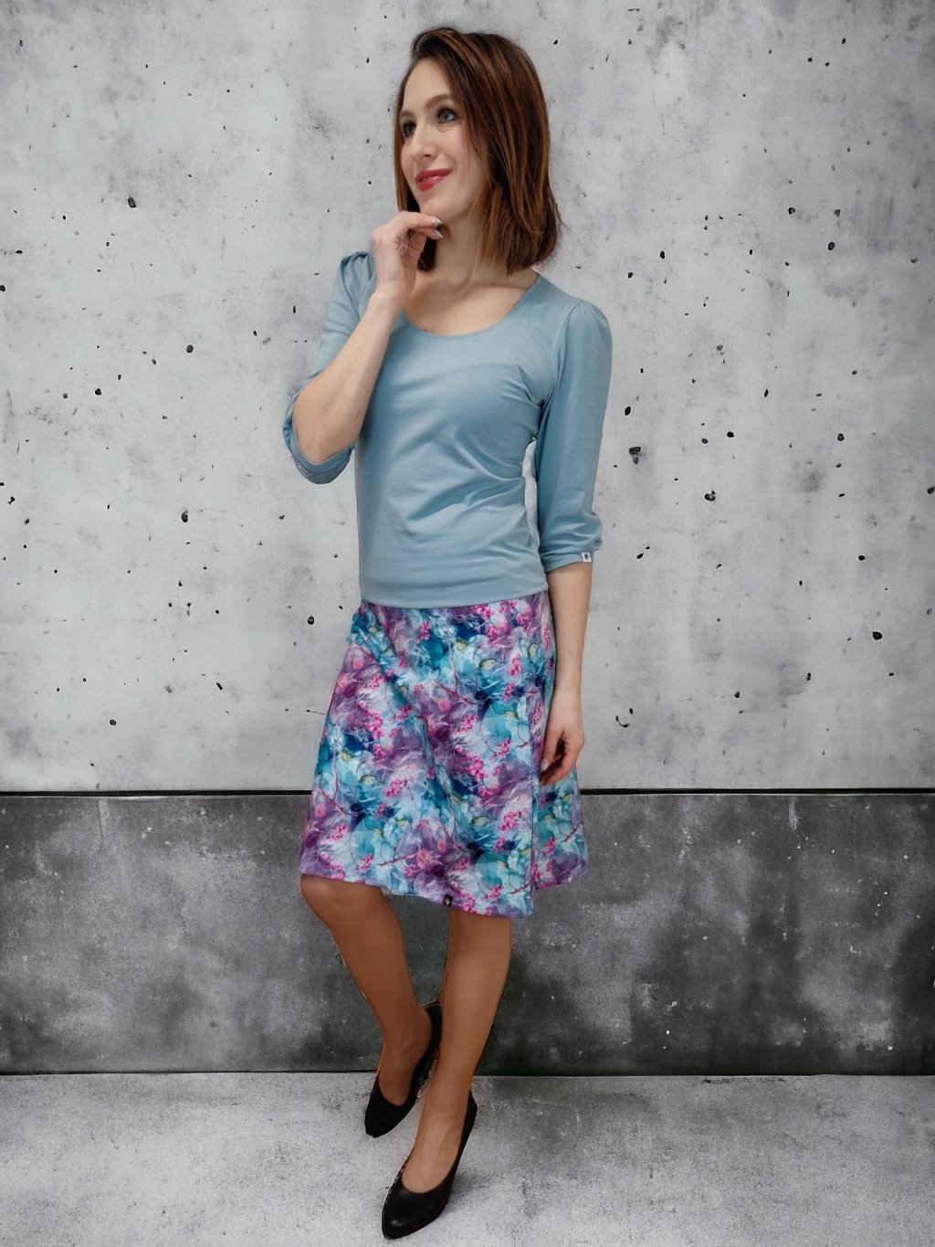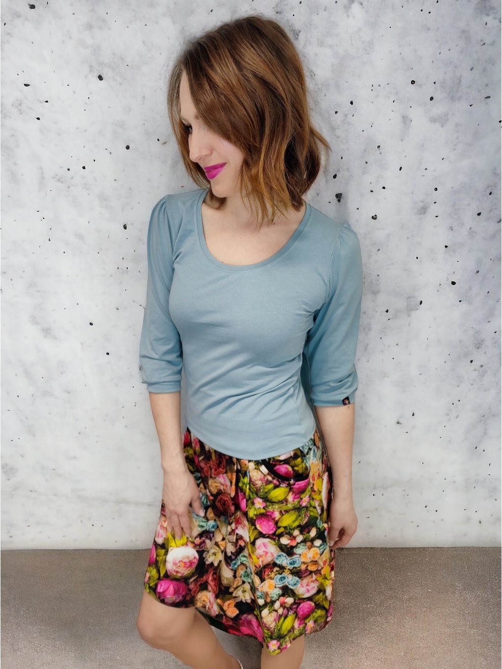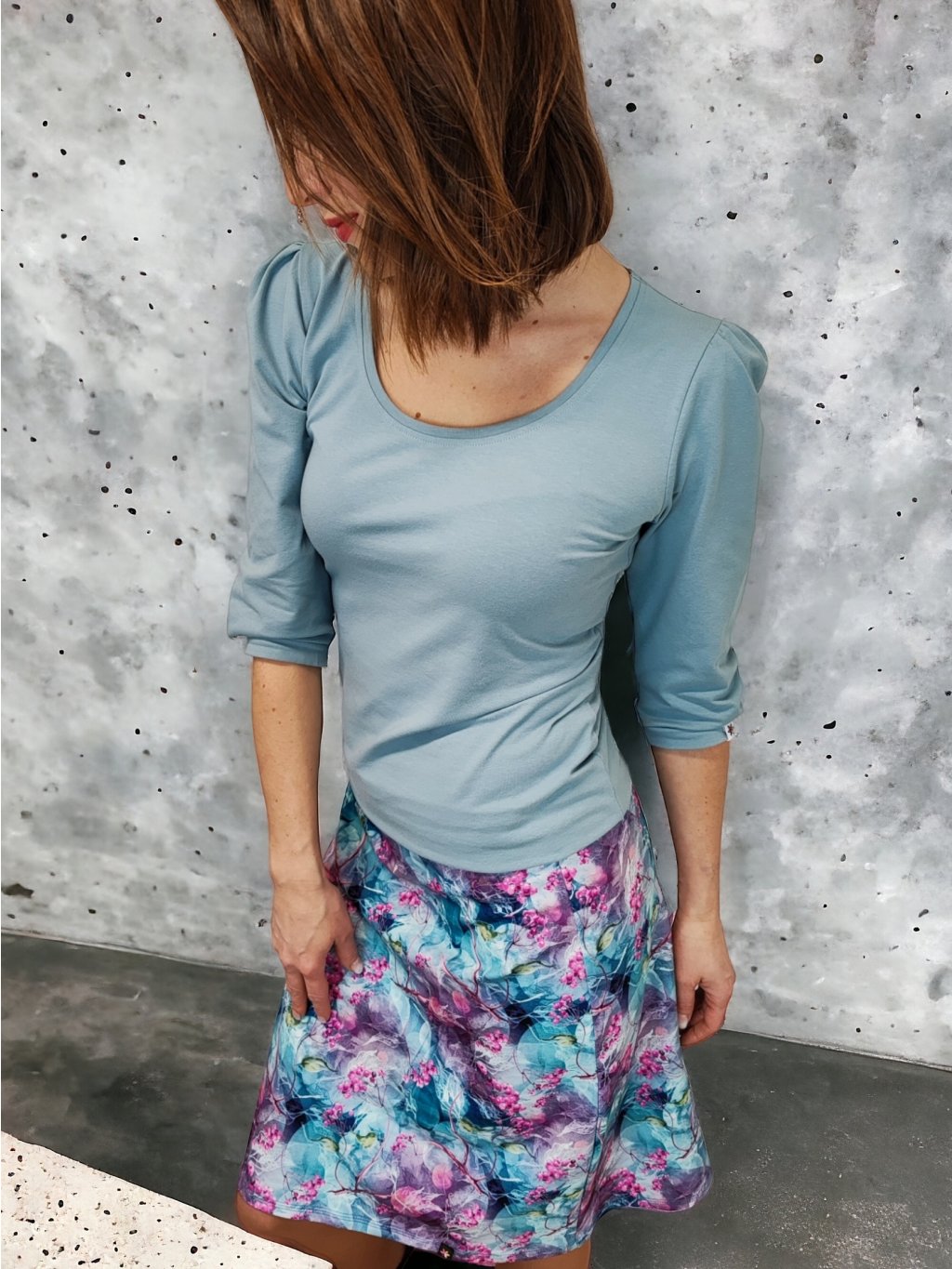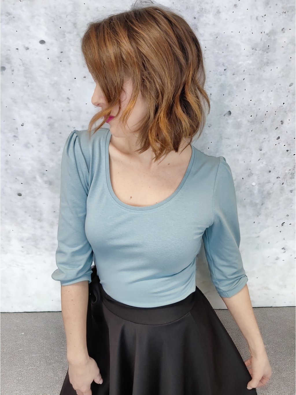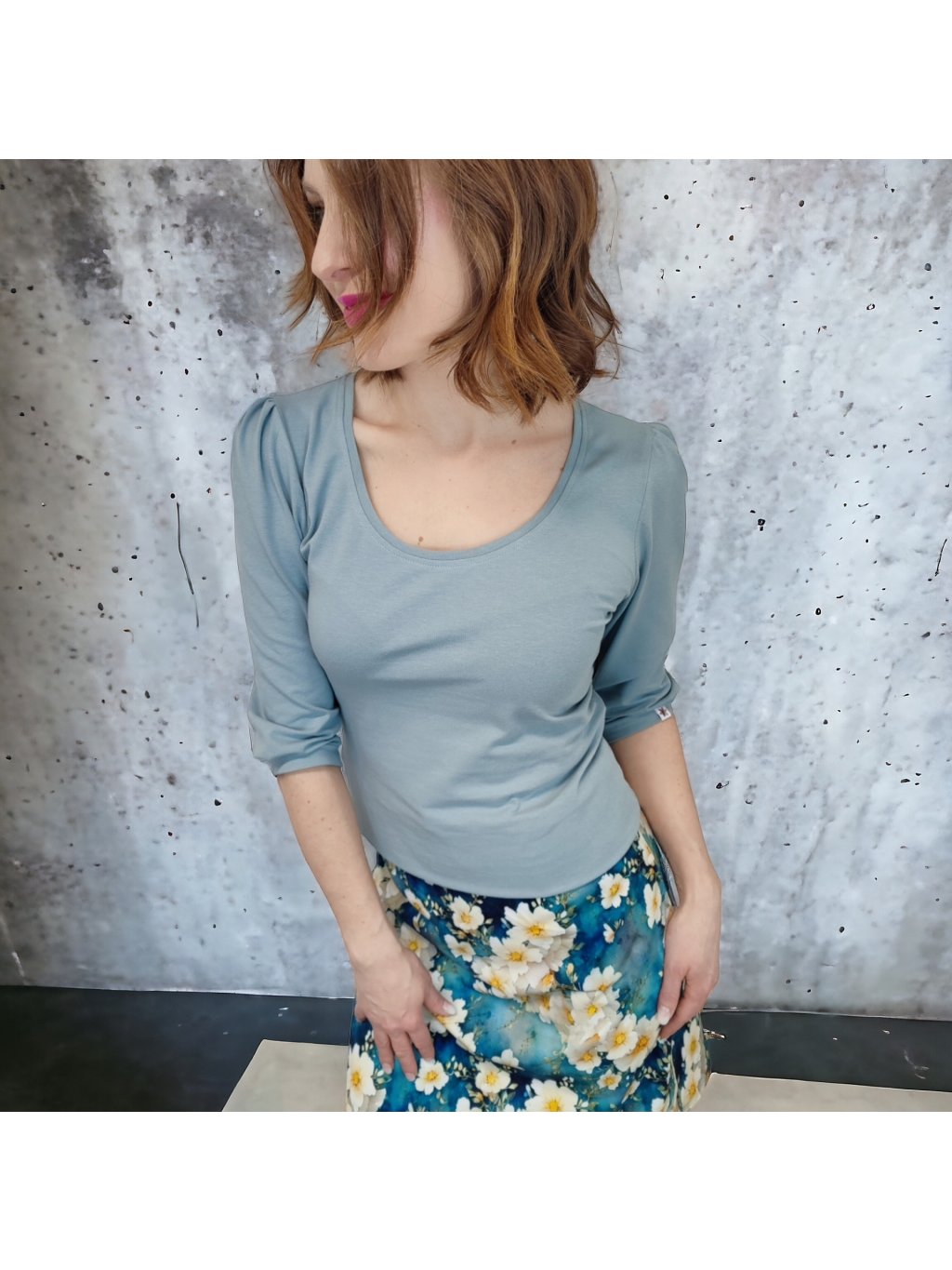 Tričko je ušito v české dílně z kvalitního bavlněného úpletu (95 % bavlna, 5 % elastan), který dobře drží tvar a nabídne pohodlí v běžném nošení. Má 3/4 rukávy s lehkým nařasením, které dodává jemný ženský detail. Střih je přiléhavý a lichotivý, výstřih kulatý. Délku trička si můžete při objednávce zvolit podle svého – měřeno od ramene k dolnímu lemu.