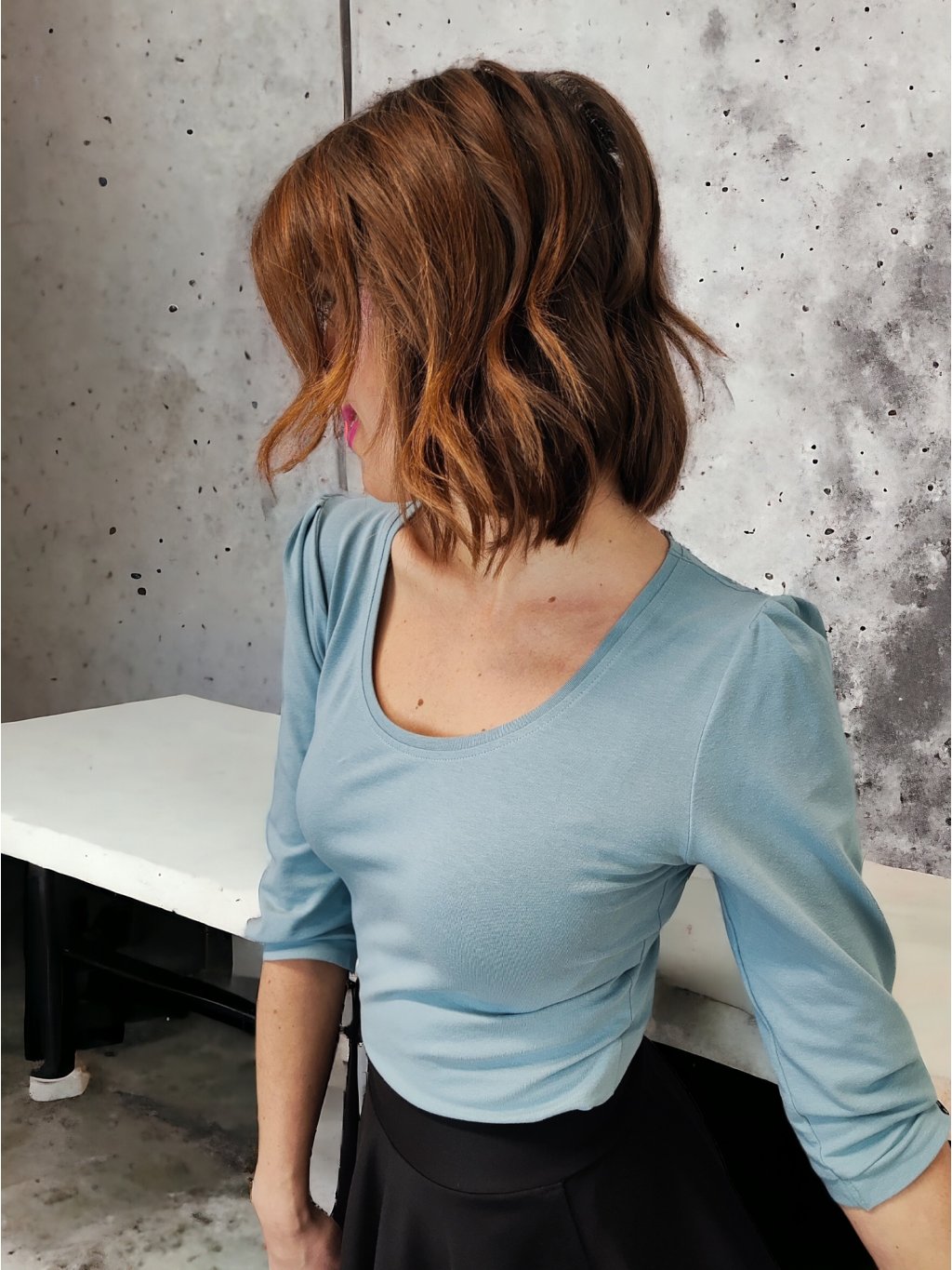 Tričko má nabírané rukávky, které sahají pod loket. Tričko je přiléhavého střihu.