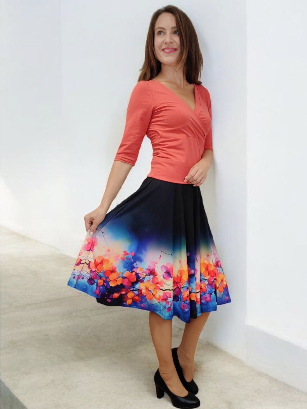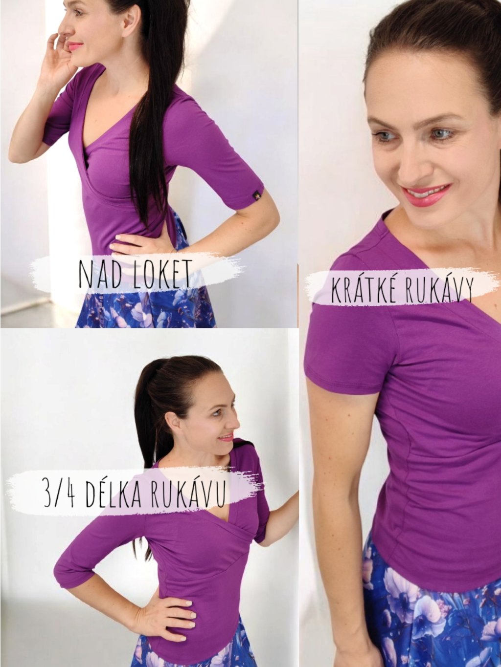 Tričko má výstřih do V, který opticky prodlužuje krk a lichotí dekoltu. Tričko má 3/4 rukávy. Tričko je jemně projmuté a pěkně sedí na postavě. Pokud si přejete úpravu na míru, napište nám – rády vám vyhovíme.