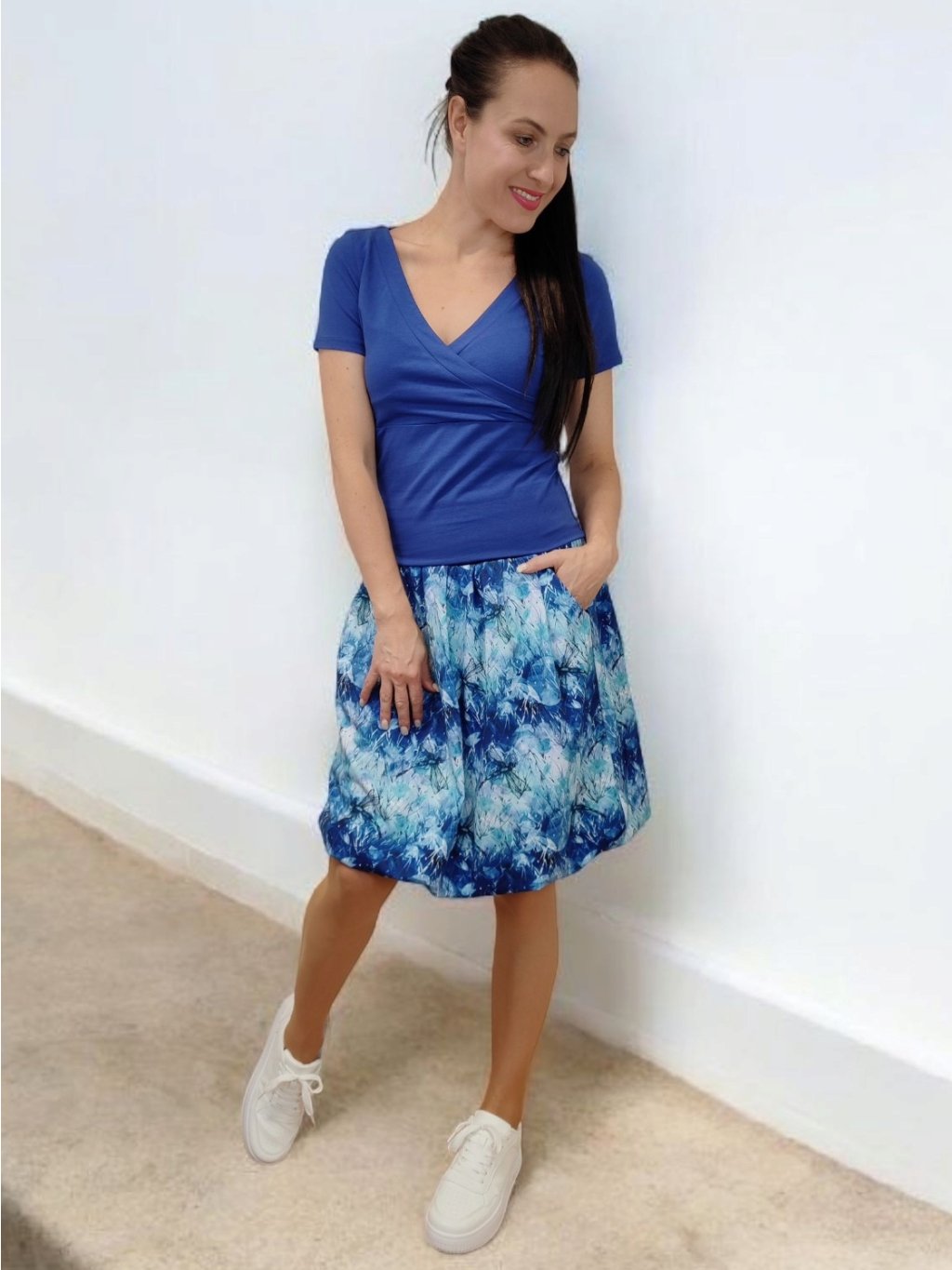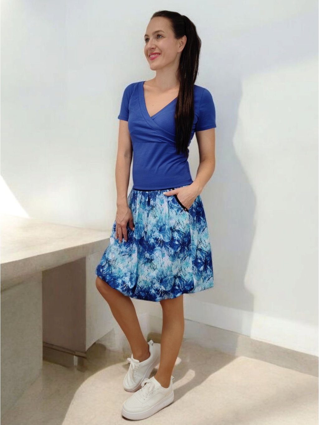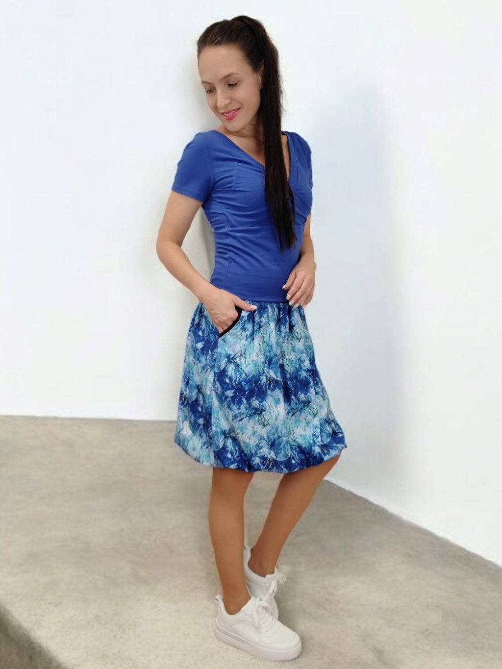 Tričko má výstřih do V, který opticky prodlužuje krk a lichotí dekoltu. Tričko má krátké rukávy. Tričko je jemně projmuté a pěkně sedí na postavě. Pokud si přejete úpravu na míru, napište nám – rády vám vyhovíme.