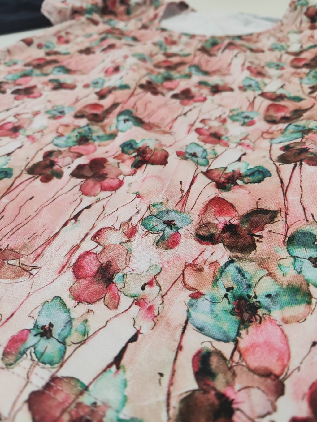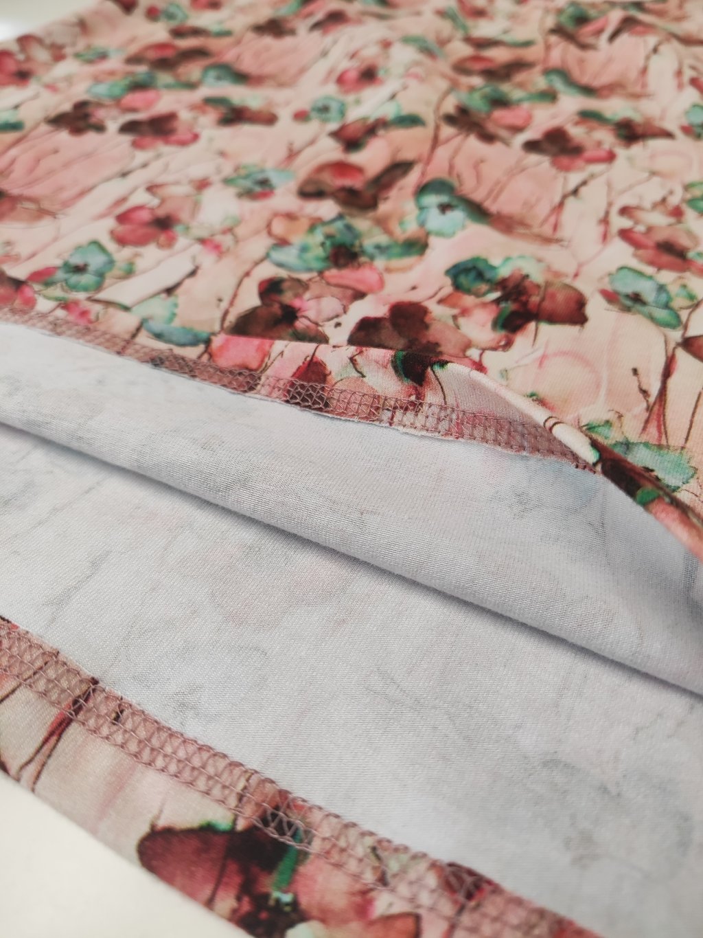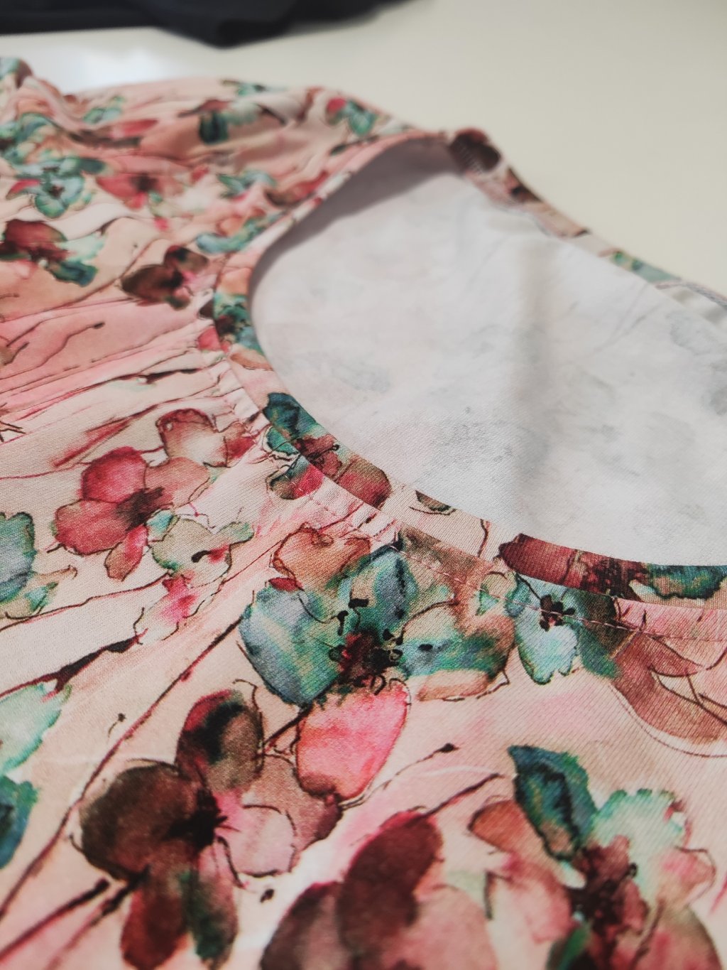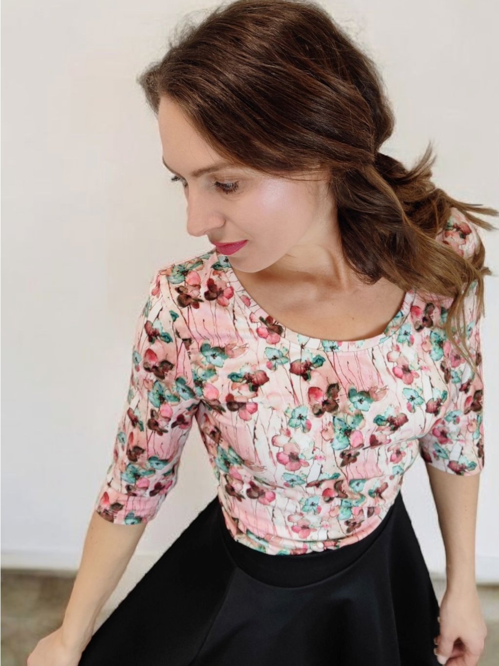 Tričko je ušité z květované látky v růžových odstínech.