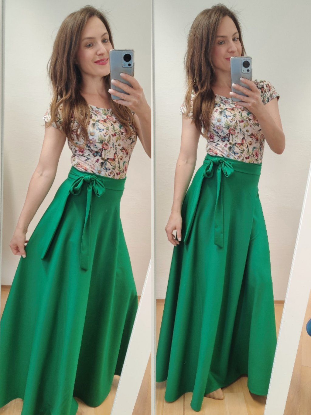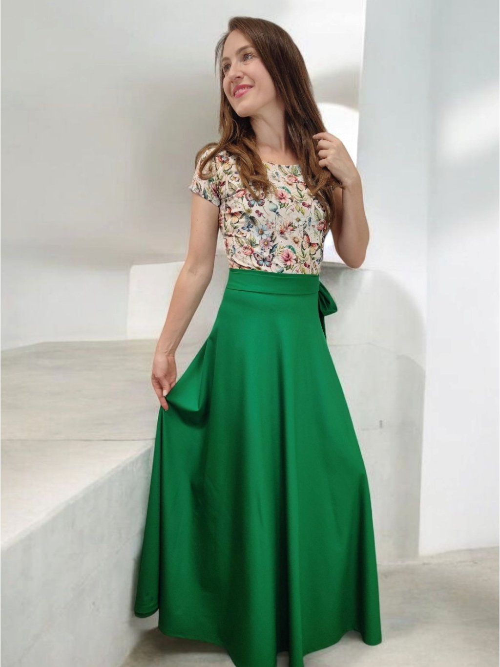 Zavinovací řešení umožňuje snadné přizpůsobení postavě – sukni si uvážete přesně tak, jak potřebujete.
