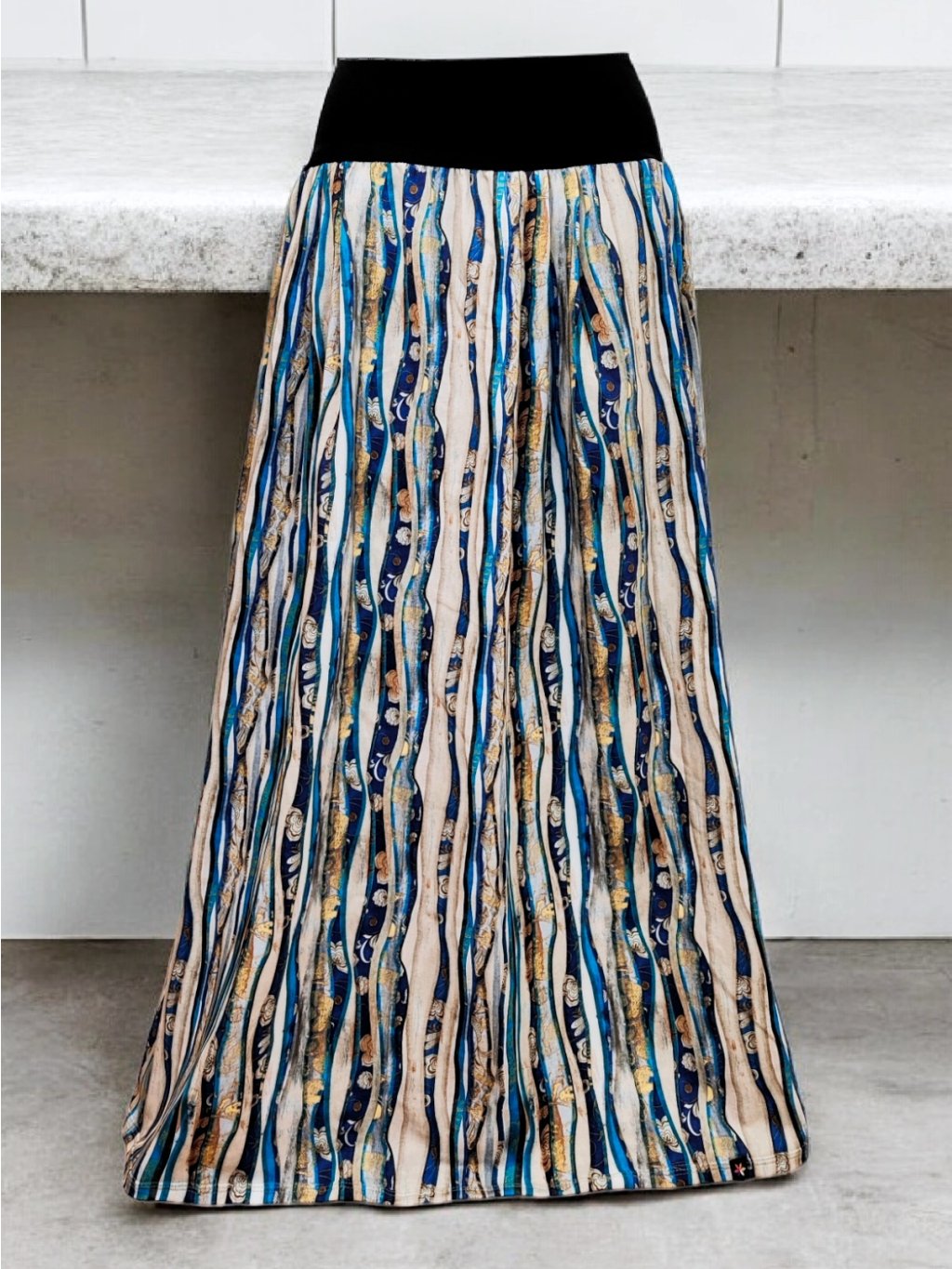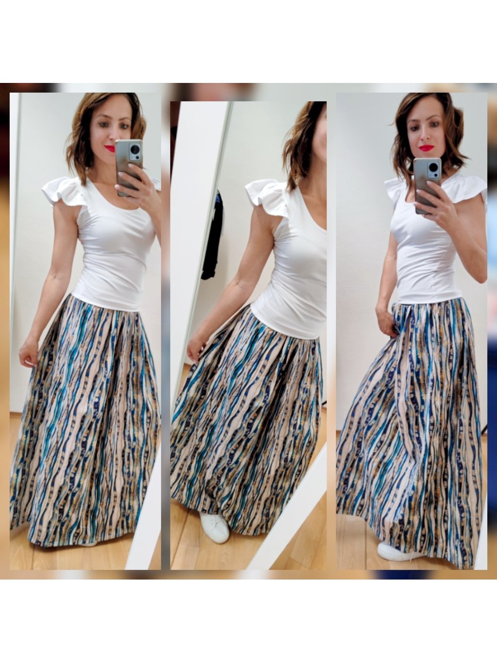 Sukně je ušitá ze středně silného jednolícního úpletu se vzorem nepravidelných proužků v modro béžových odstínech. Připomíná nám vůni řeckých pláží.