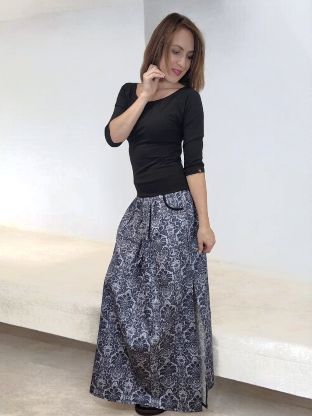 Dlouhá sukně HELENE s rozparky, kapsy, bavlněné plátno s ornamenty