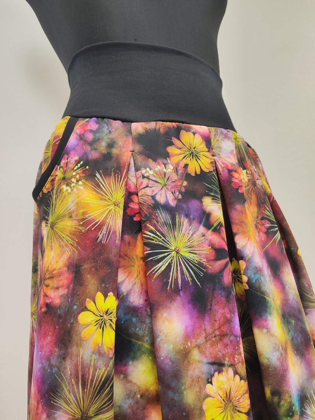 Sukně má v bocích praktického kapsy a zajímavě řešené protisklady na předním i zadním díle.