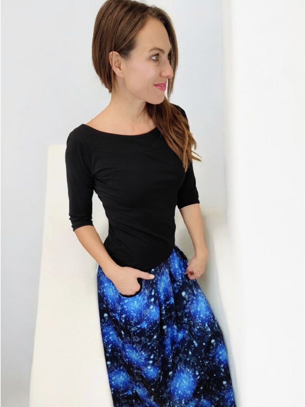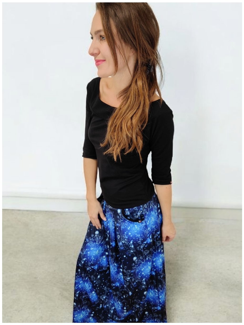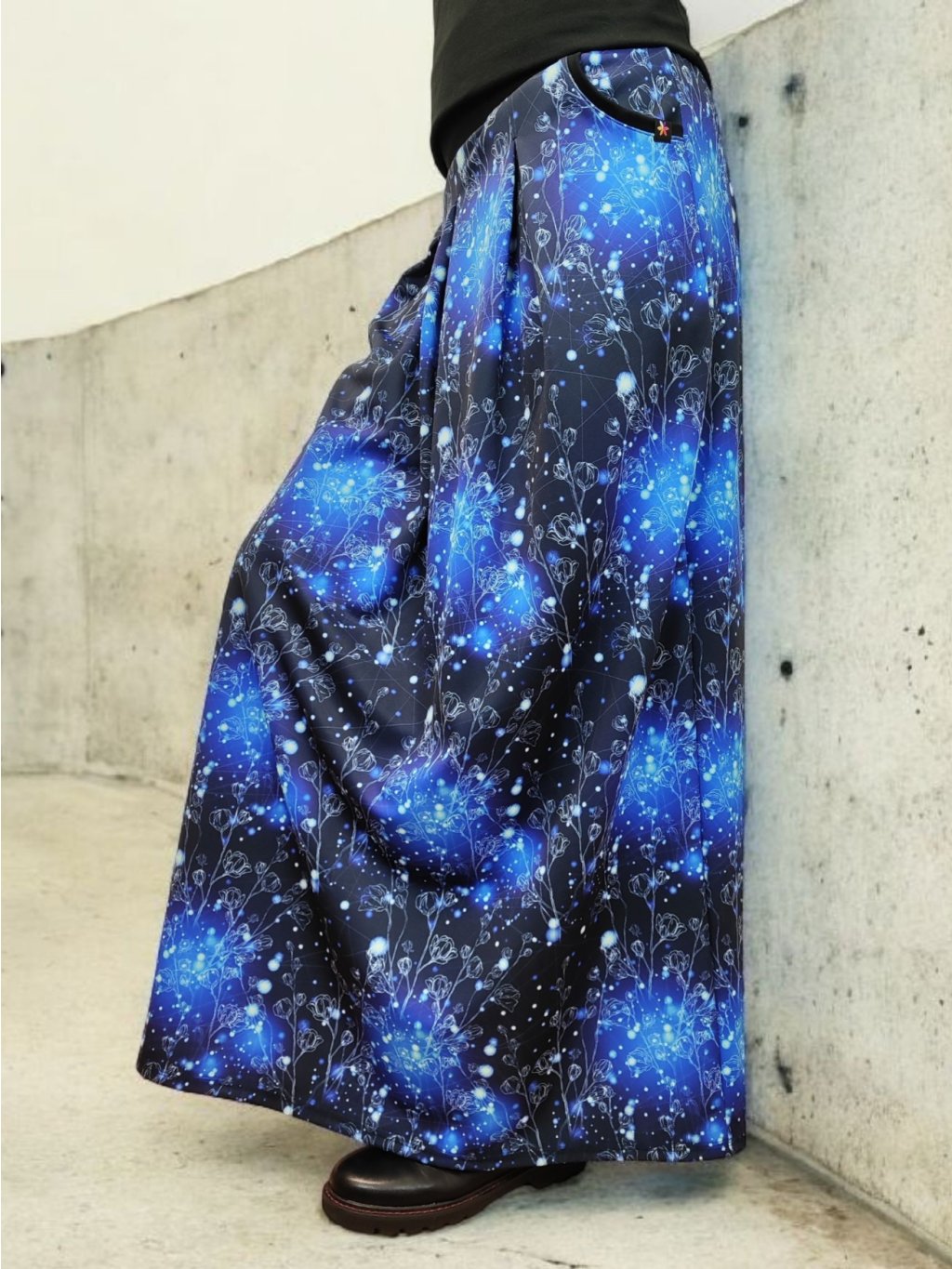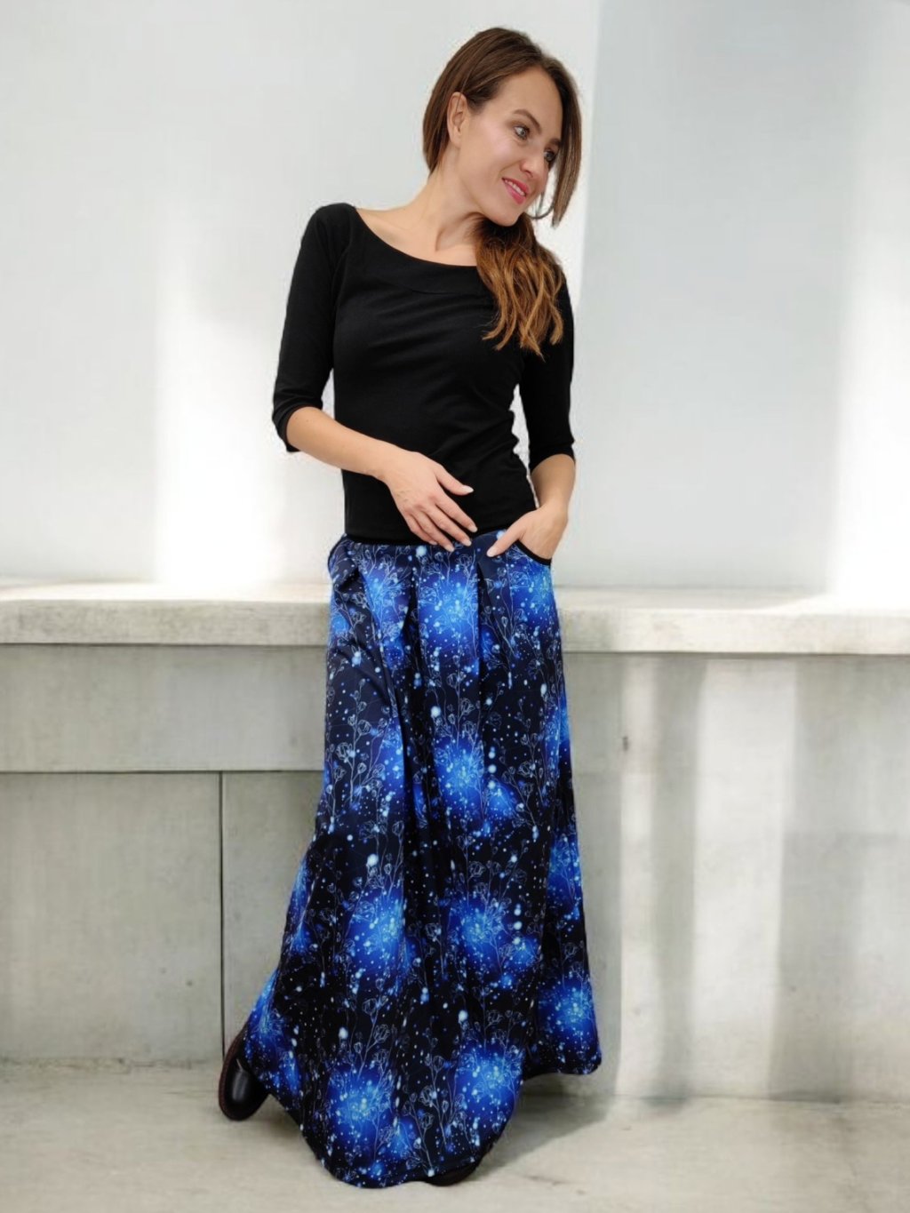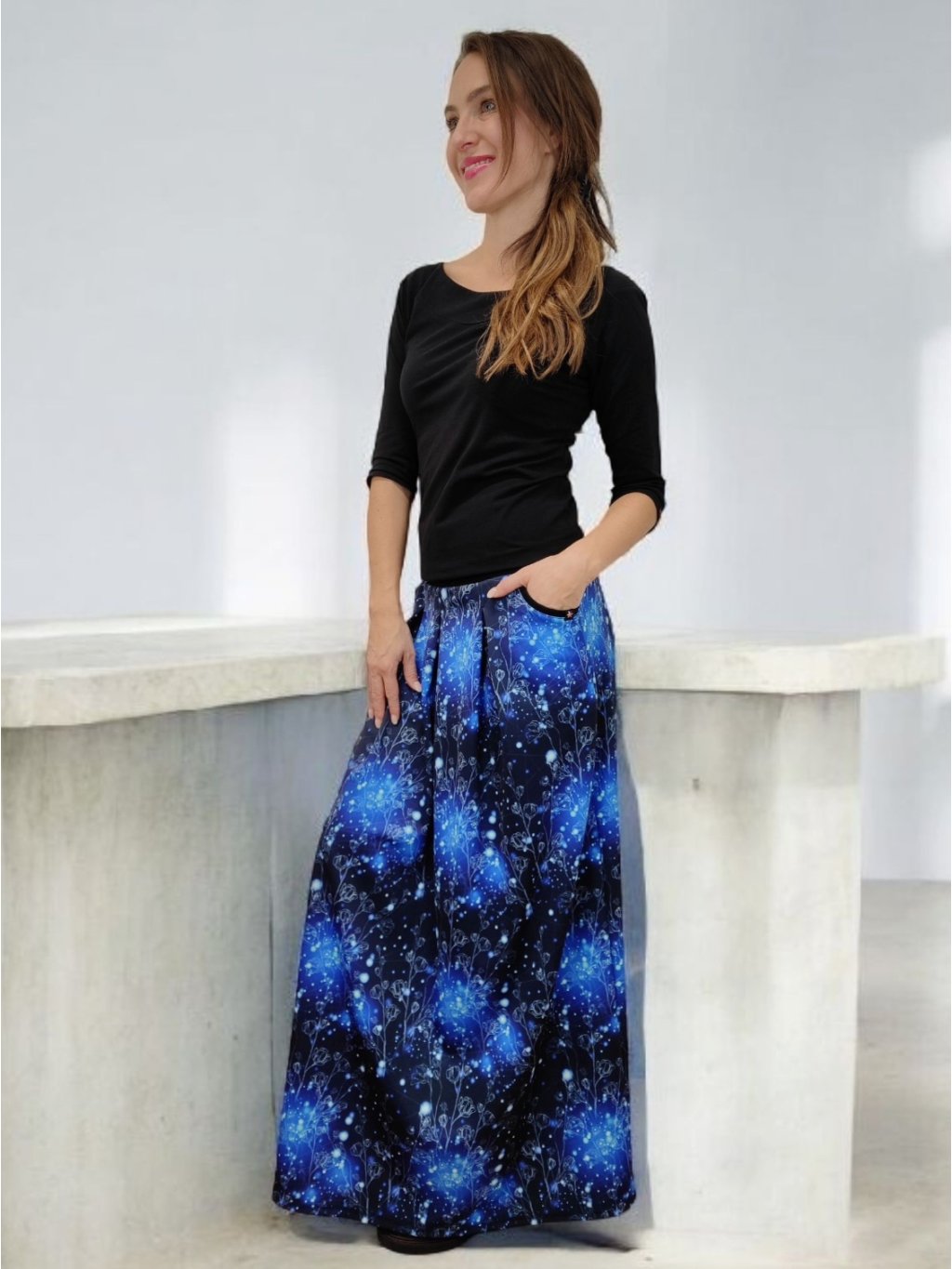 Stylová dlouhá sukně Lewen s akvarelovým vzorem "Modrá záře". Vyrobena z hřejivého polyesterového úpletu, ideální pro podzimní a zimní období. Praktické kapsy a česká výroba.