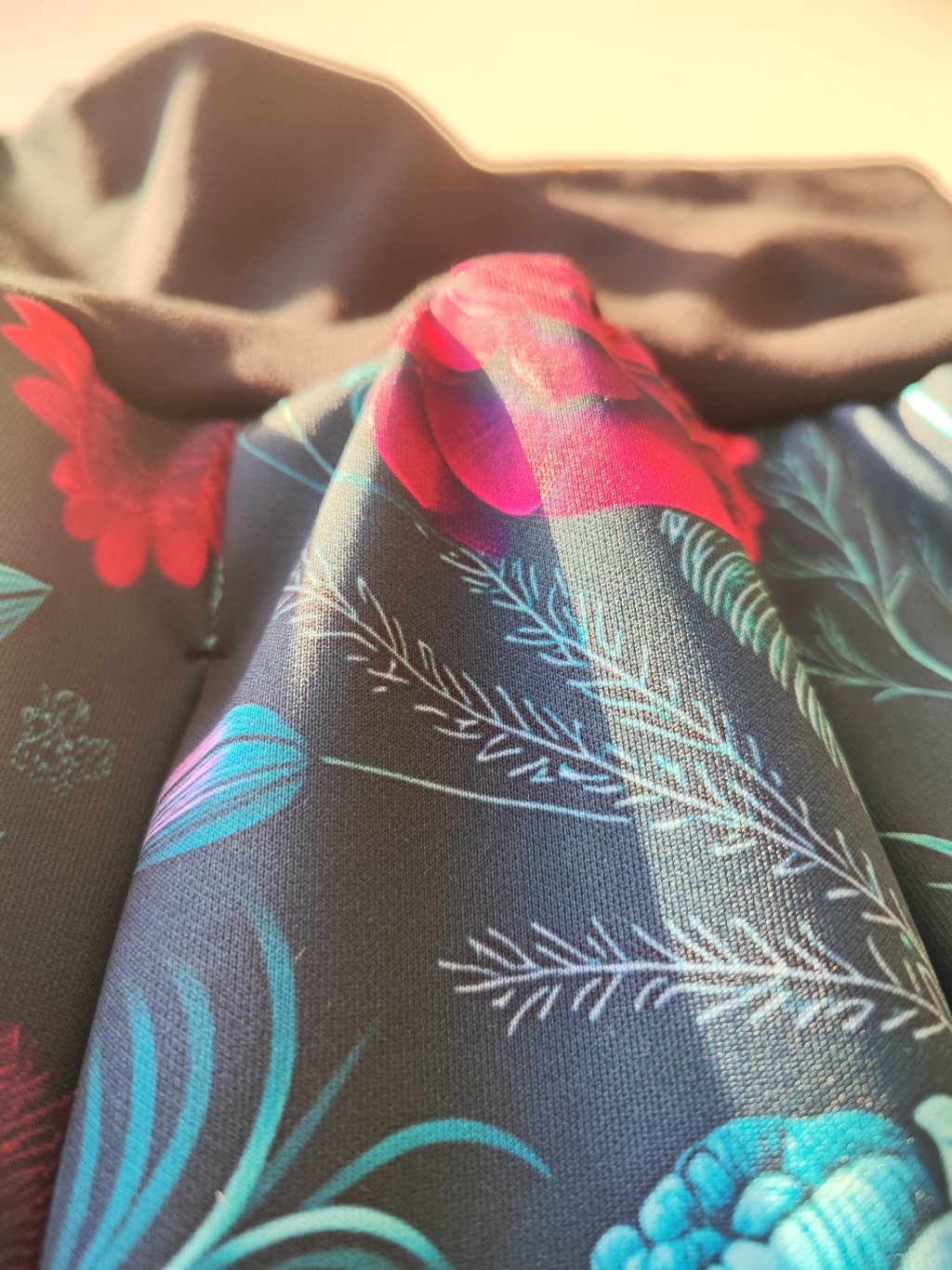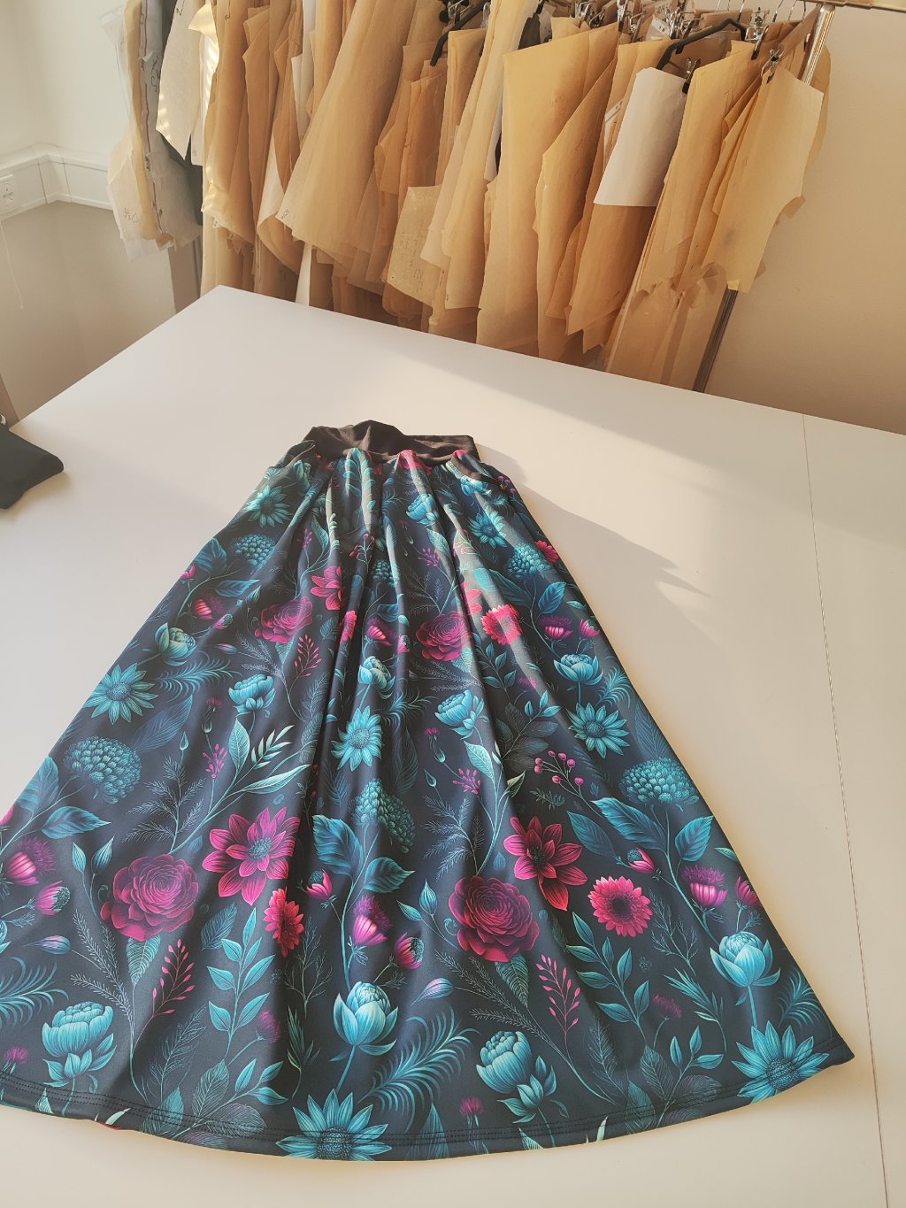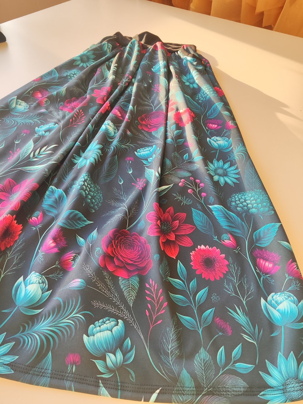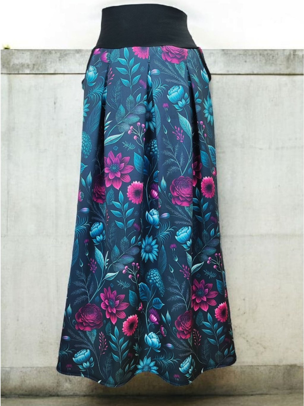 „Petrolejové a fuchsiové květy“ znamenají bohatý petrolejový základ, na němž vynikají květy v syté fuchsii. Tento kontrastní vzor připomíná podzimní zahradu, kde květy vynikají na tmavém pozadí — elegantní, výrazný a zároveň ženský. Každý pohyb sukně odhalí rozdíl mezi tóny, čímž vytváří účinek živého ornamentu.