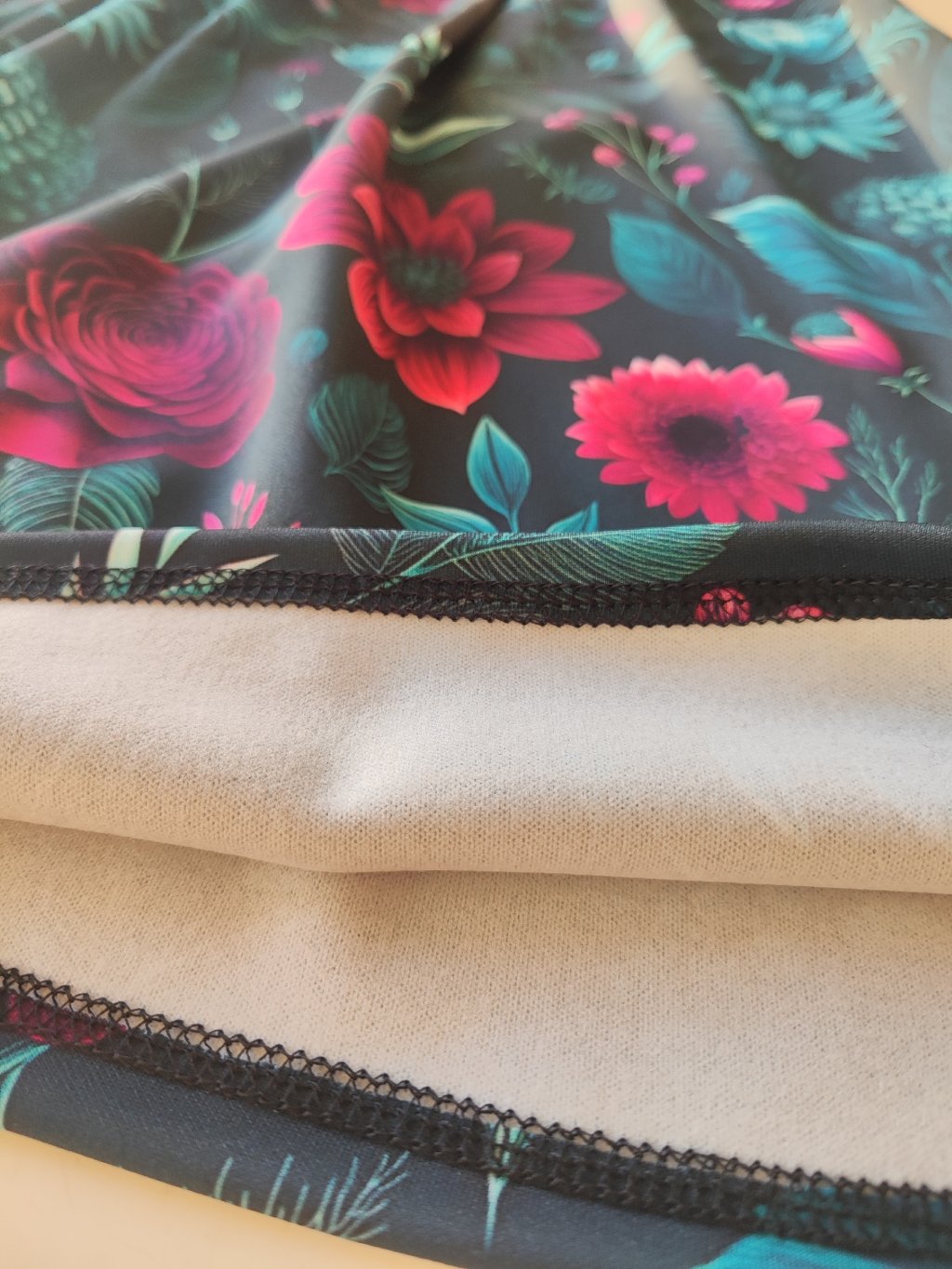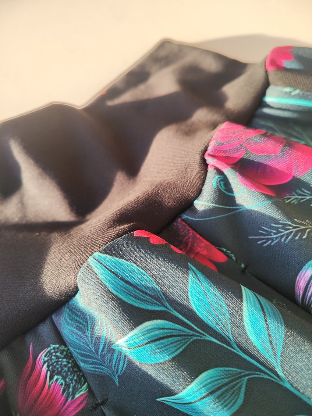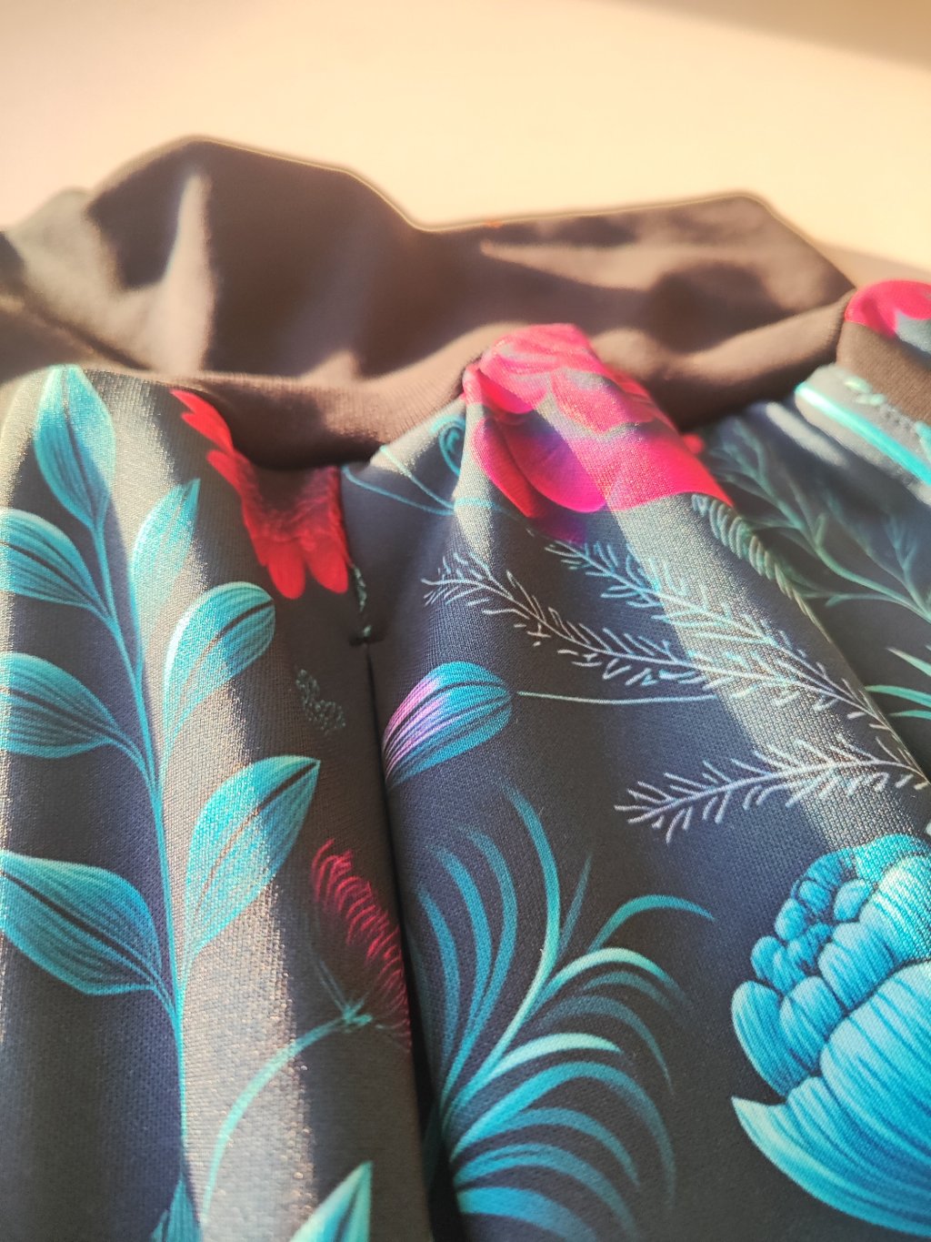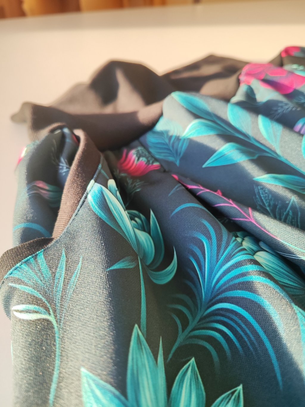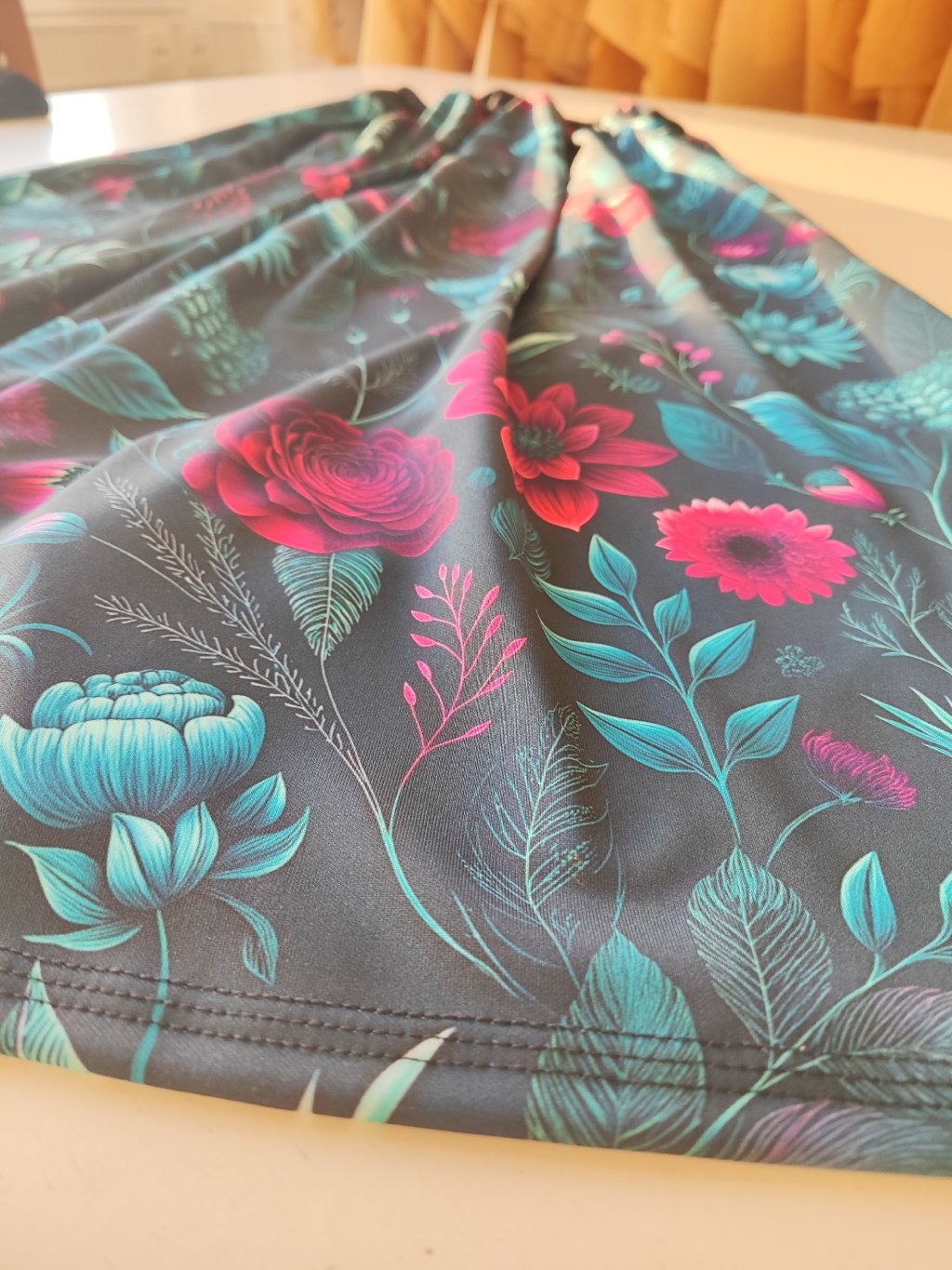 „Petrolejové a fuchsiové květy“ znamenají bohatý petrolejový základ, na němž vynikají květy v syté fuchsii. Tento kontrastní vzor připomíná podzimní zahradu, kde květy vynikají na tmavém pozadí — elegantní, výrazný a zároveň ženský. Každý pohyb sukně odhalí rozdíl mezi tóny, čímž vytváří účinek živého ornamentu.