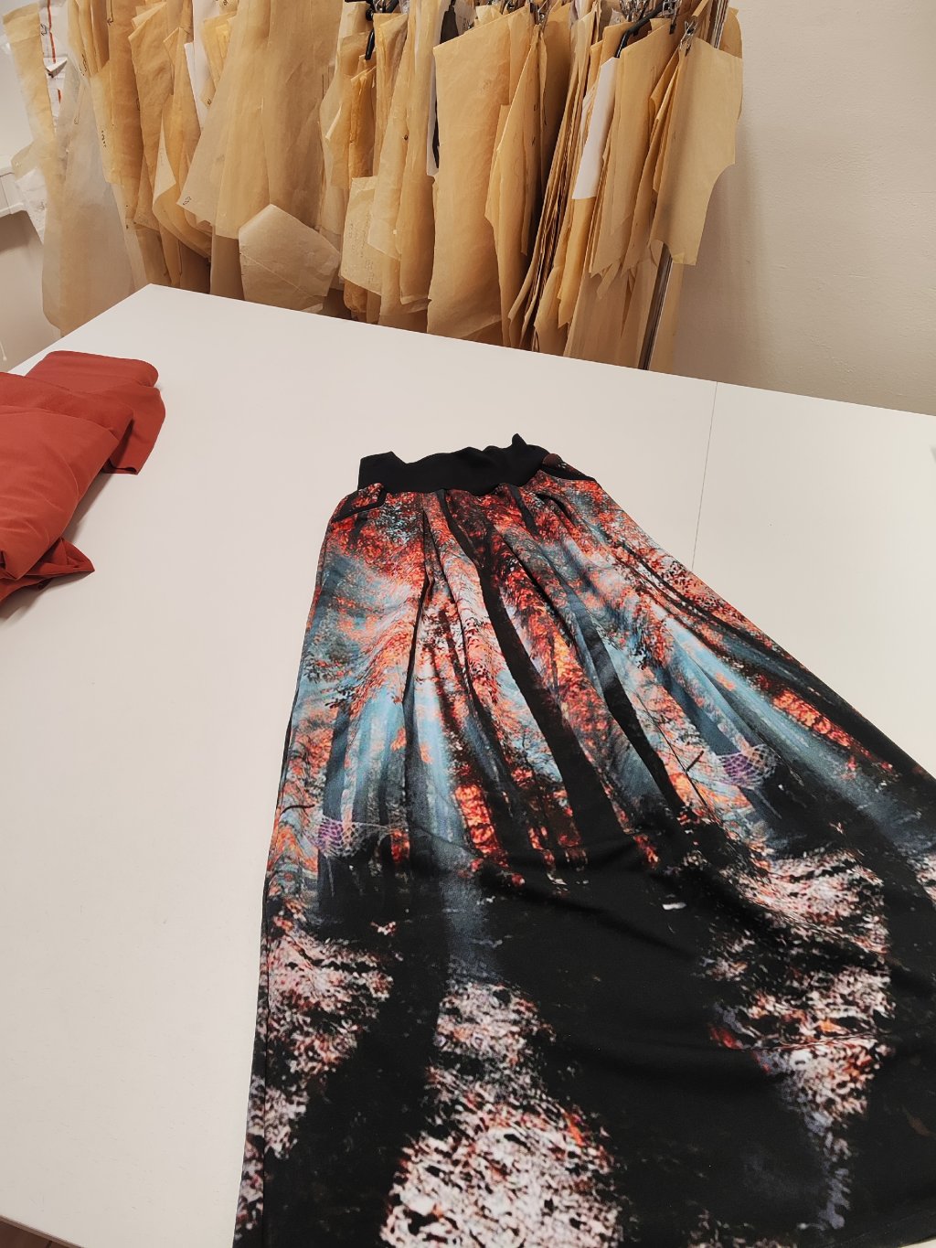 Dlouhá sukně je rovného střihu, v pase s několika protisklady, k dolnímu kraji se rozšiřuje.