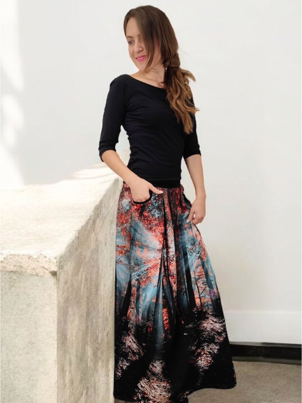 Dlouhá sukně Lewen s kapsami | Makový motiv, přírodní elegance | Šijeme v ČR