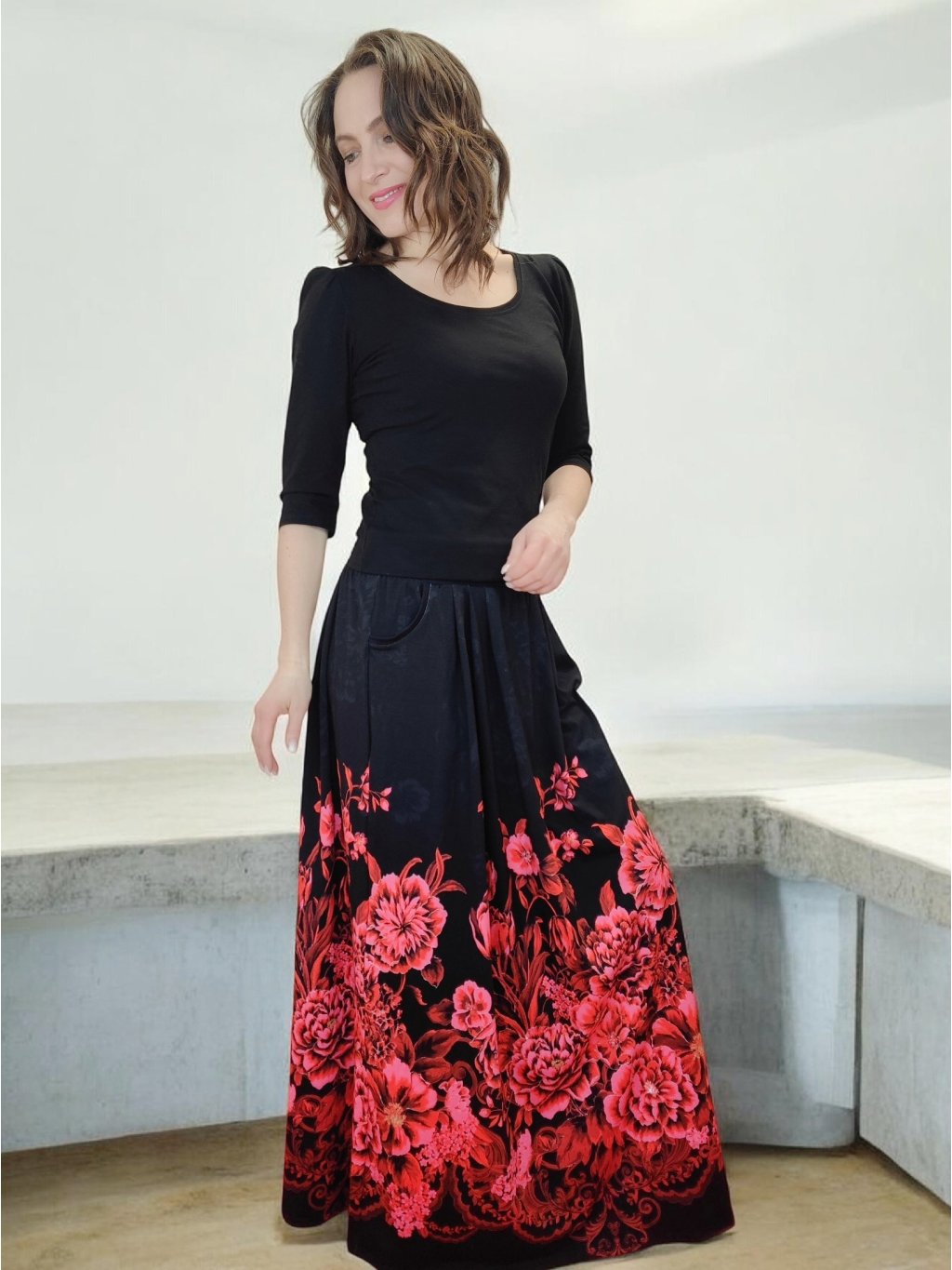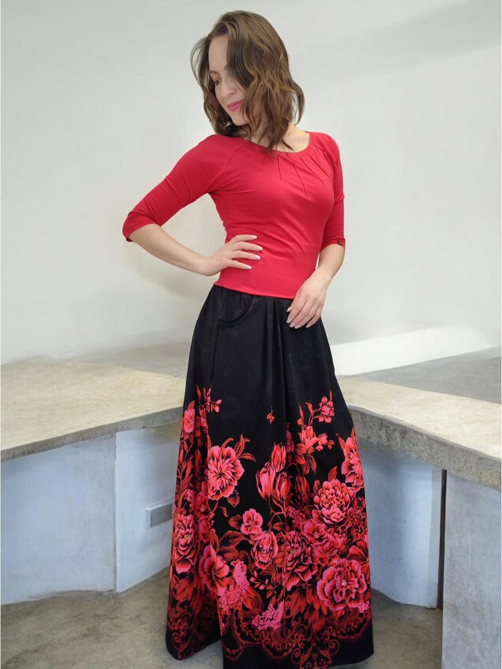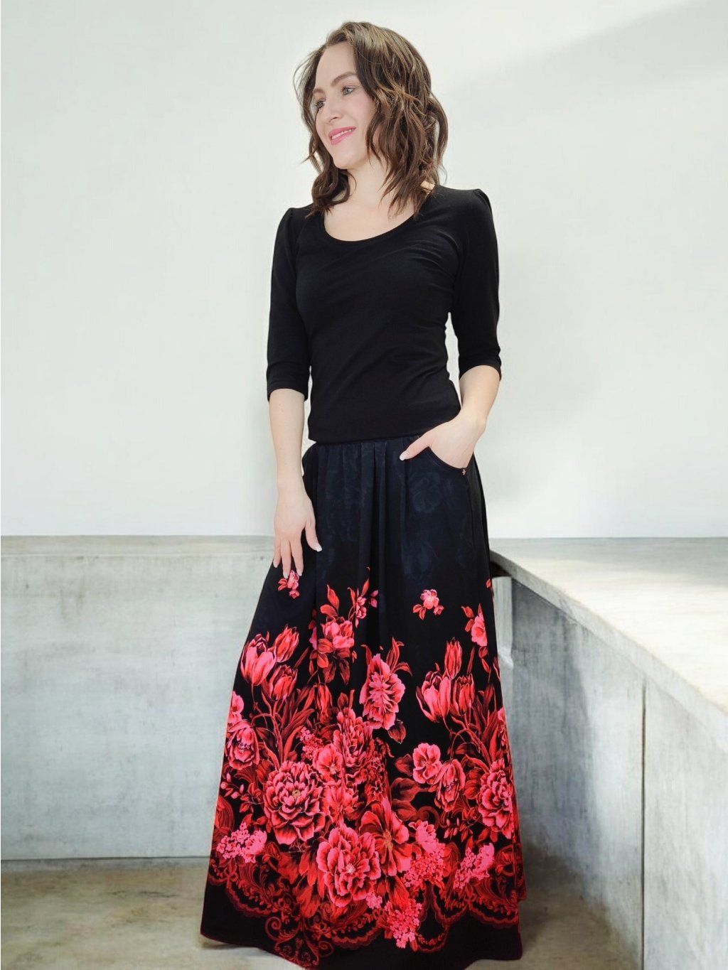 Dlouhá sukně s kapsami HELENE s motivem karmínových květů