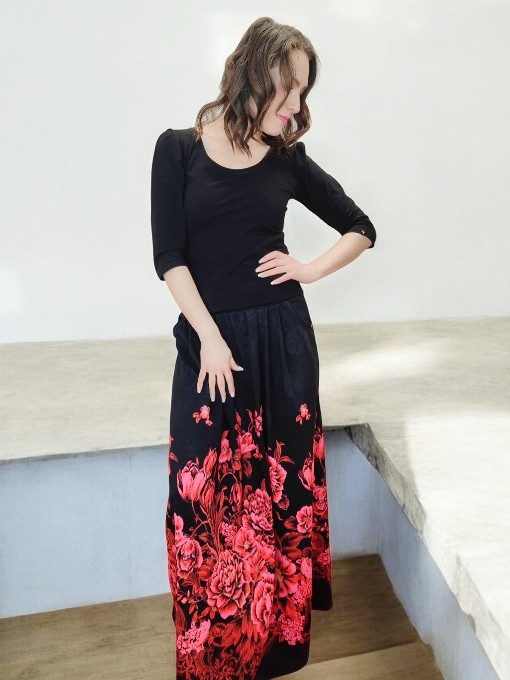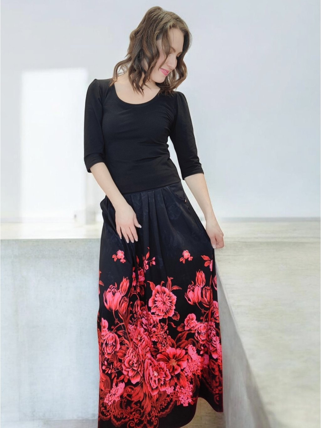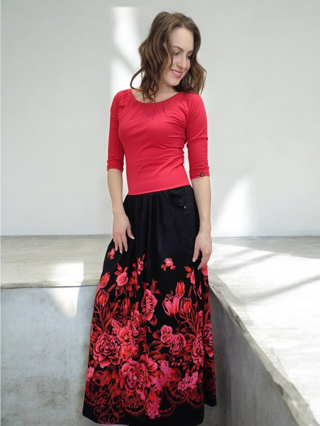 Dlouhá sukně s kapsami HELENE s motivem karmínových květů