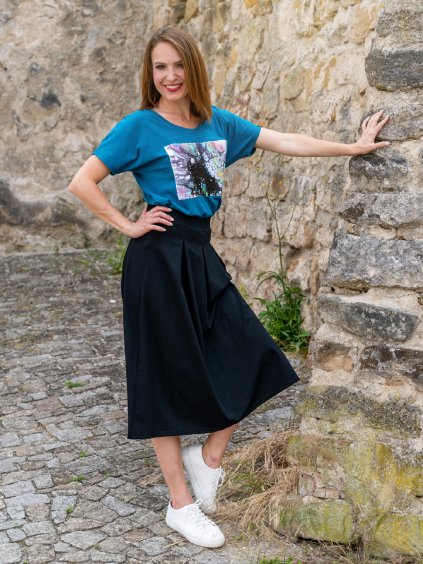 Sukně k dolnímu kraji volně splývá a vytváří áčkový vzhled.