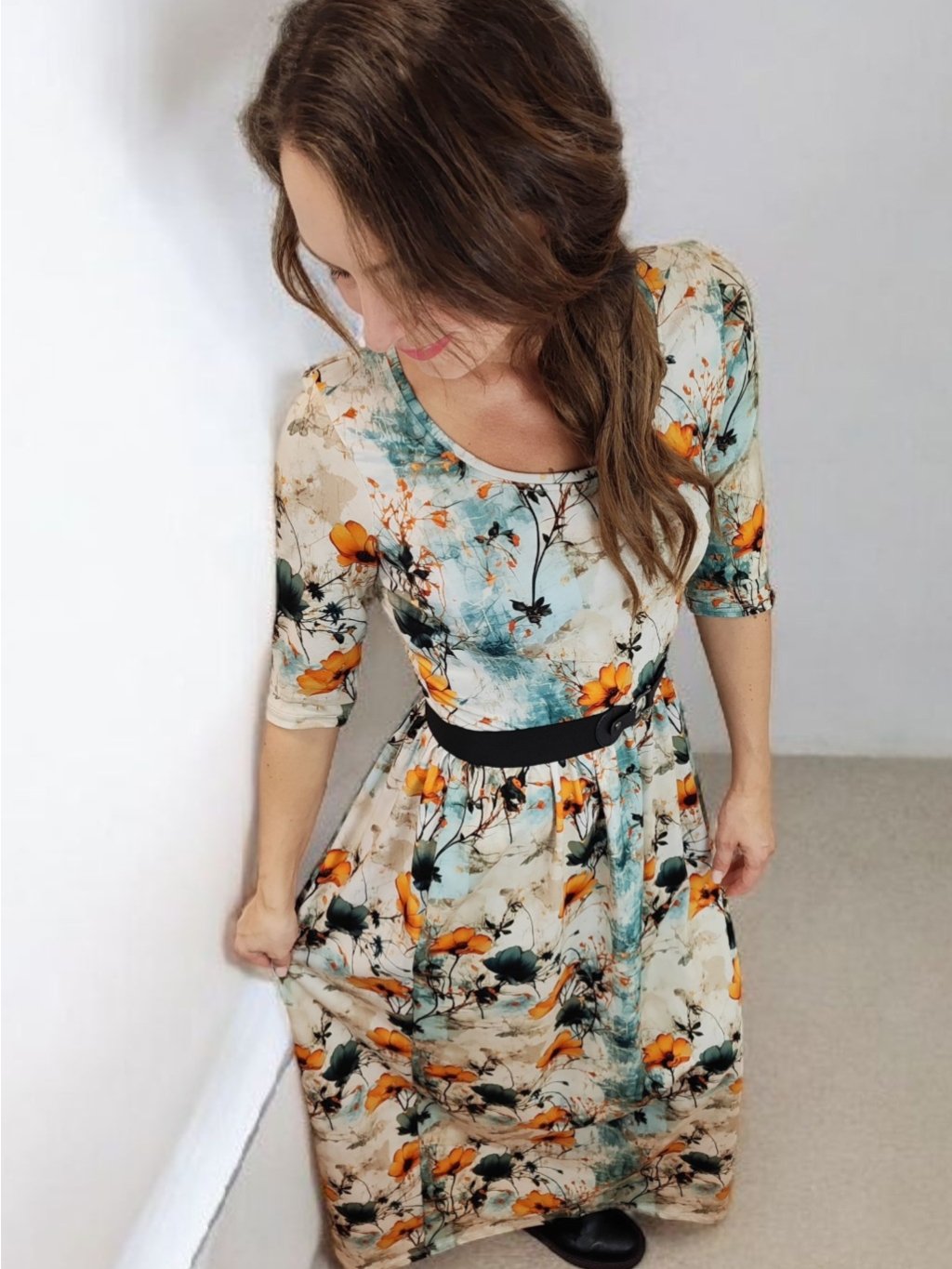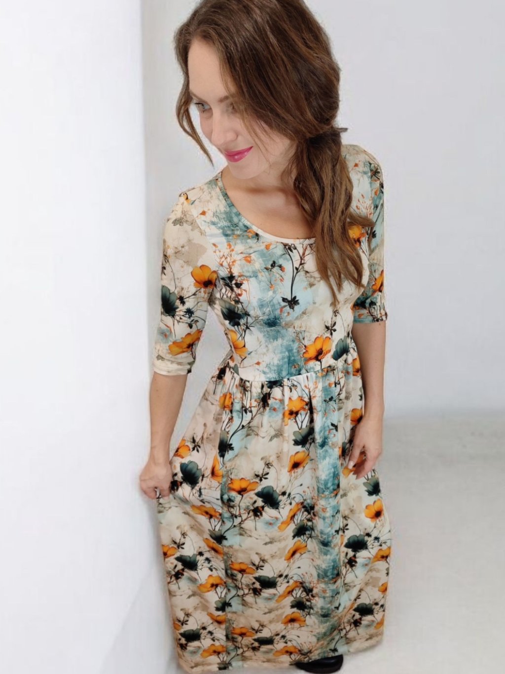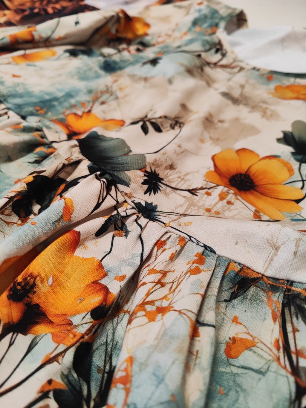 Podzimní motiv Podzimní něha v jemných tónech připomíná padající listí a kouzlo klidného podzimního dne. Barvy působí romanticky a jemně, a přitom zůstávají nadčasové. Kombinace vzoru a bavlněného materiálu vytváří pocit lehkosti a pohodlí při každém pohybu. Tyto šaty jsou ideální pro podzimní dny, kdy chcete vypadat elegantně a cítit se přitom pohodlně.