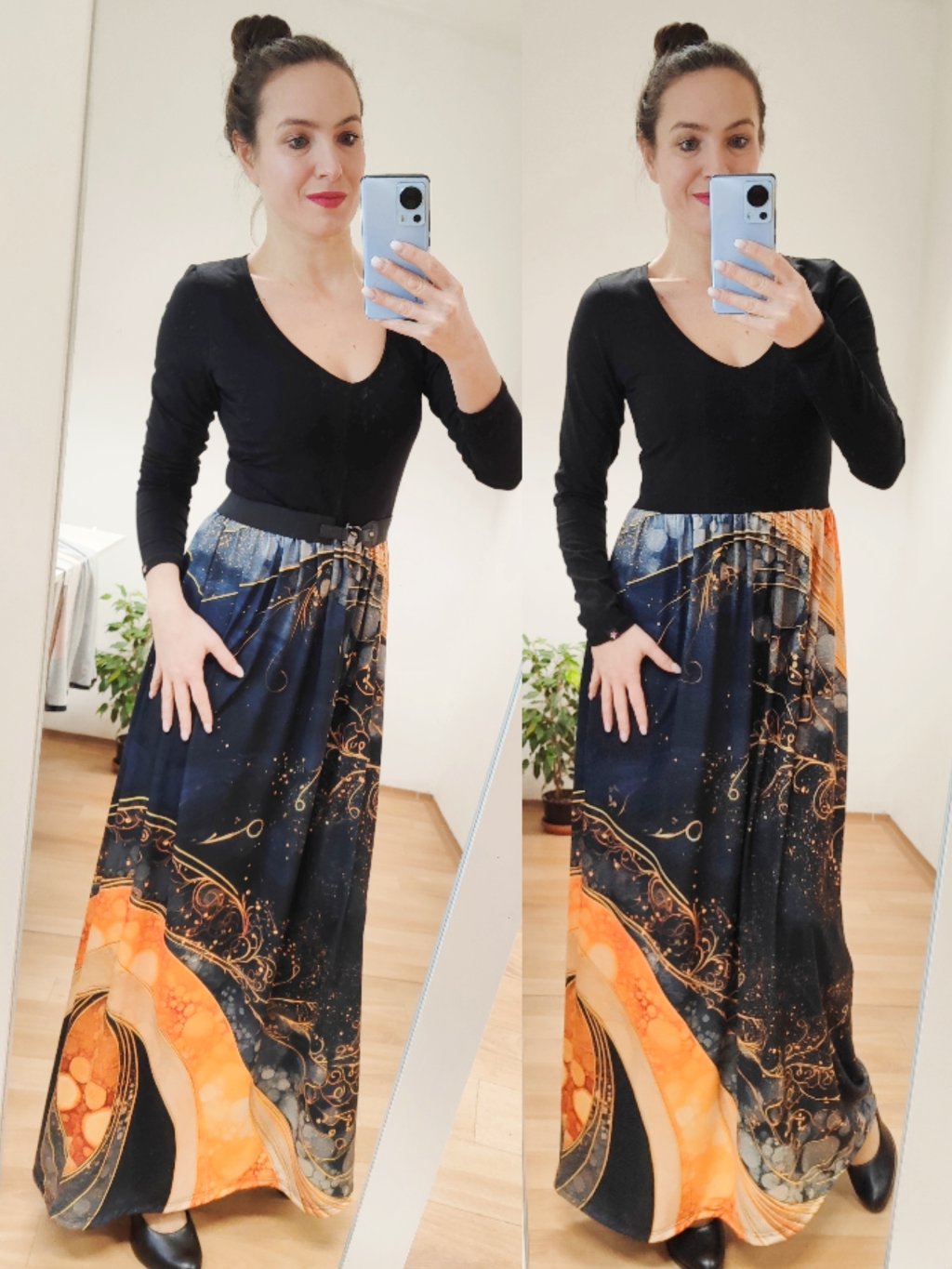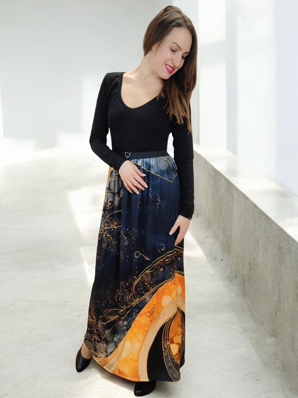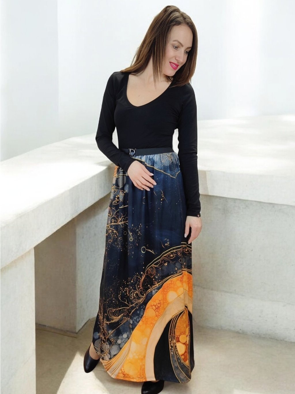 Šaty jsou střižené do délky ke kotníkům, s jemným splývavým efektem, který při pohybu ladně vlní. Díky střihu lichotí postavě — zvýrazní pas a zároveň poskytují pohodlí při každodenním nošení. Materiál umožňuje volnost pohybu, a zároveň dobře drží tvar. Šaty můžete nosit samostatně nebo kombinovat s páskem. Doplňte je kabátem či kardiganem.