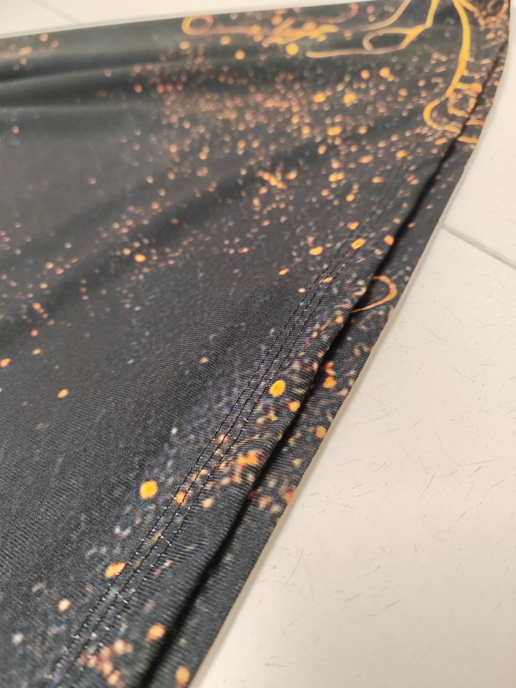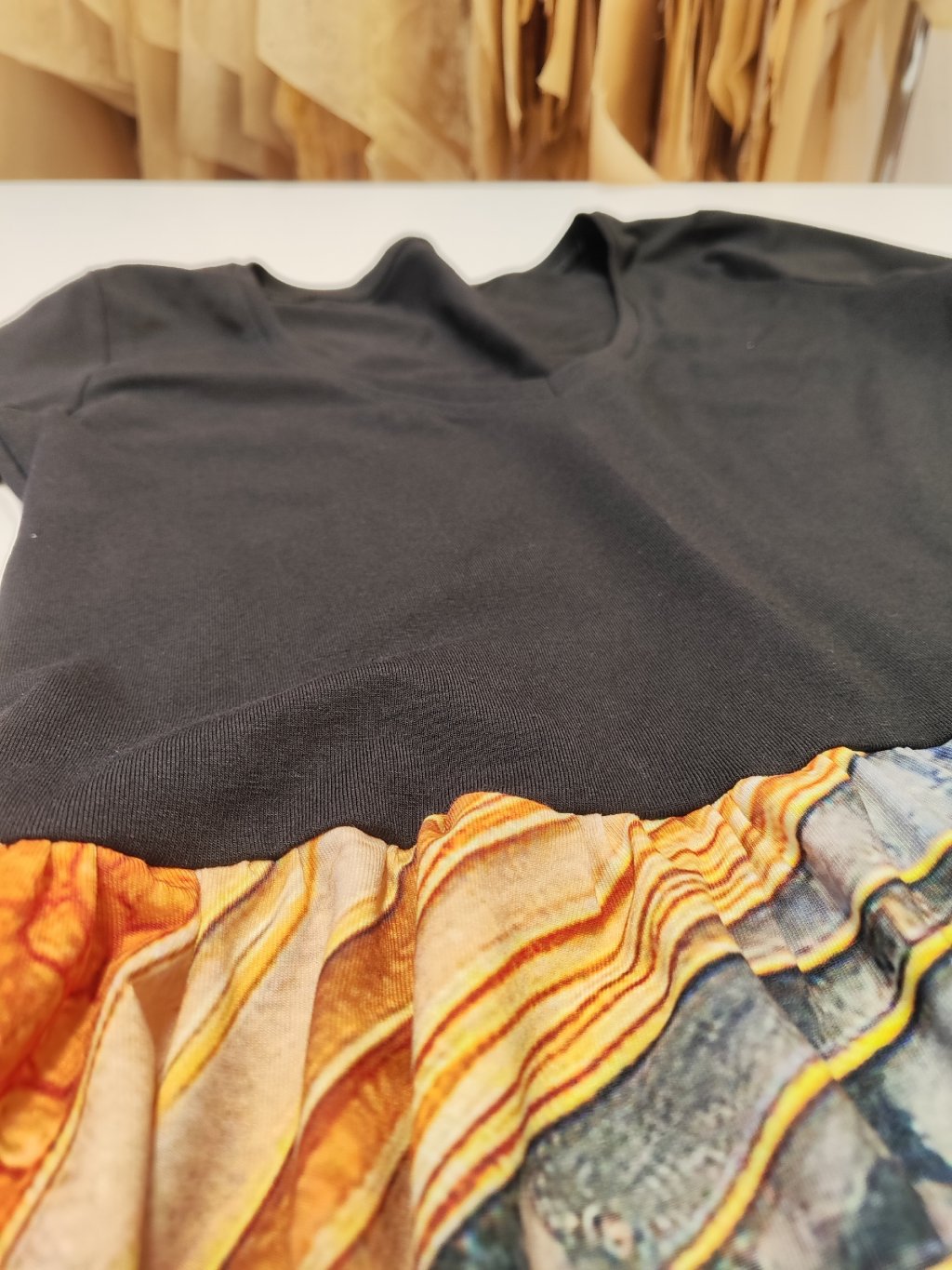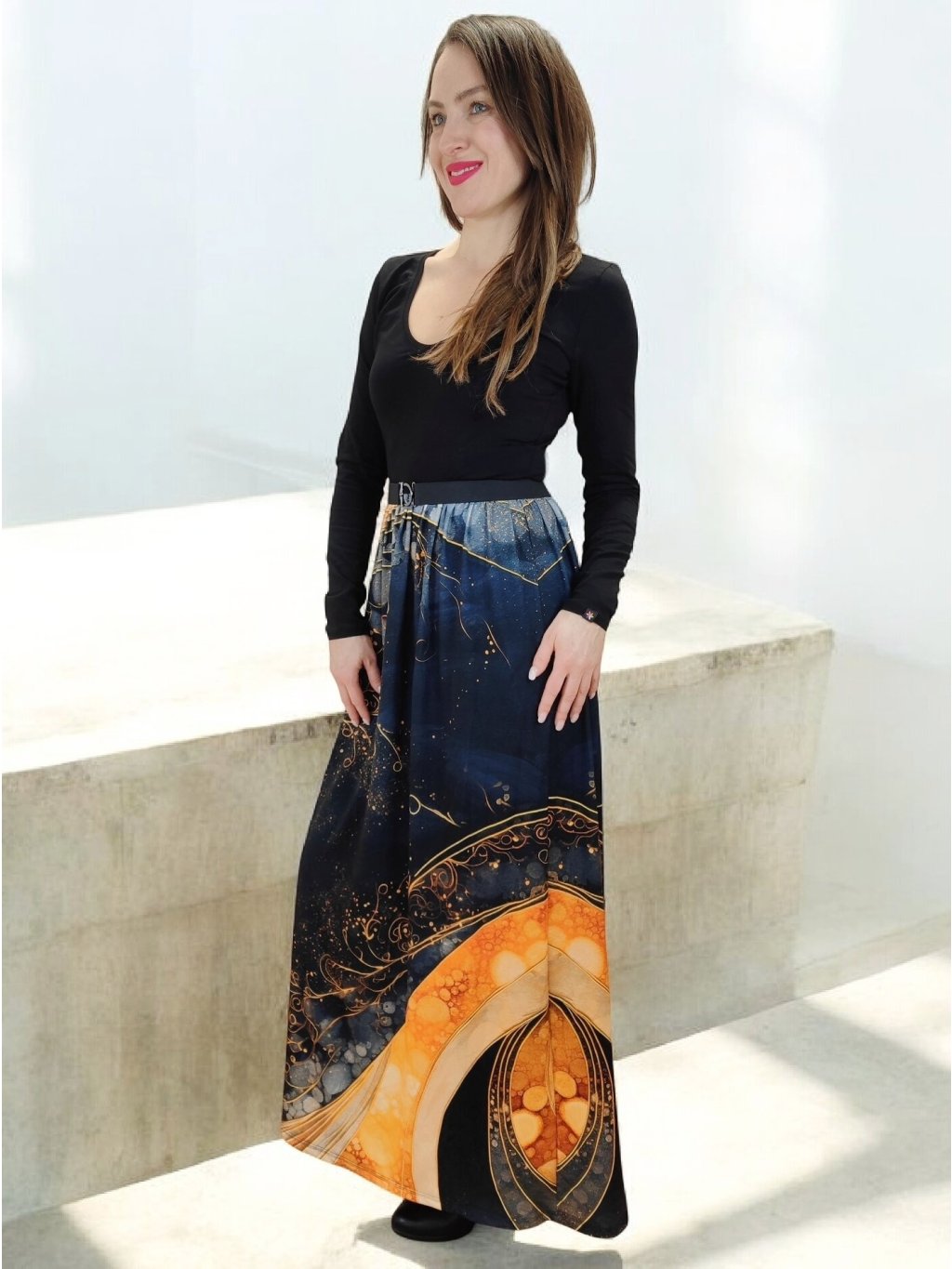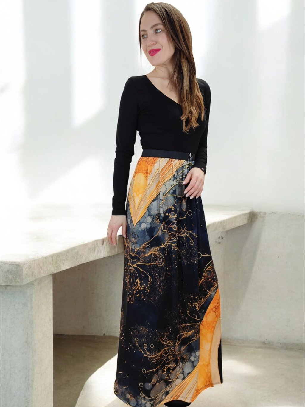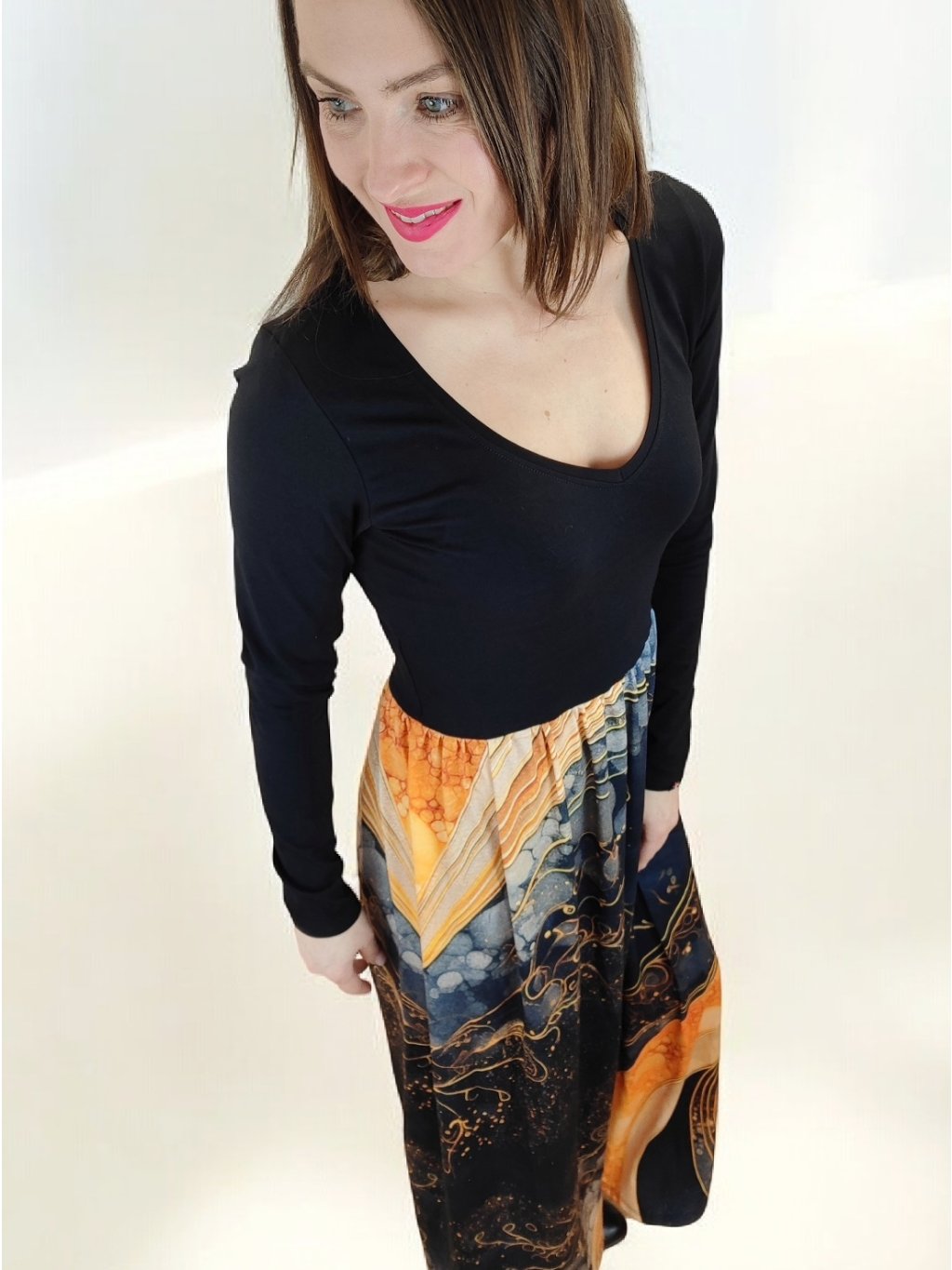 Zlatý vzor „vlny“ na látce dodává šatům nádech lehkosti a elegance — připomíná jemný lesk světla ve vlnách. Barva a vzor jsou něžné, ale zároveň výrazné — přitáhnou pozornost a dodají outfitu sofistikovaný nádech. Zlaté tóny působí teple a uhrančivě, ideální pro ženy, které chtějí jemně vyniknout.