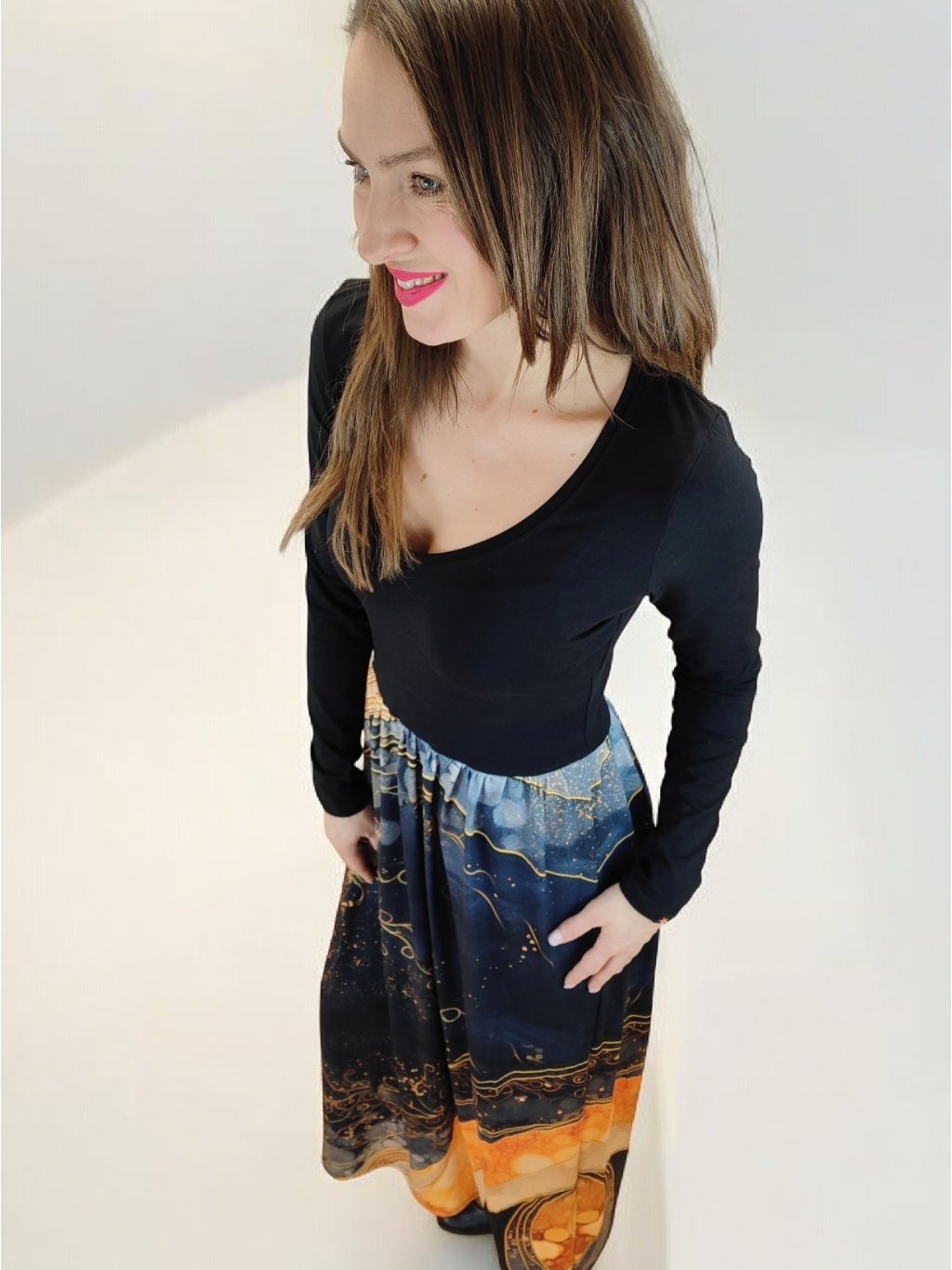 Na fotce jsou šaty v délce 150 cm na postavě 172 cm vysoké.