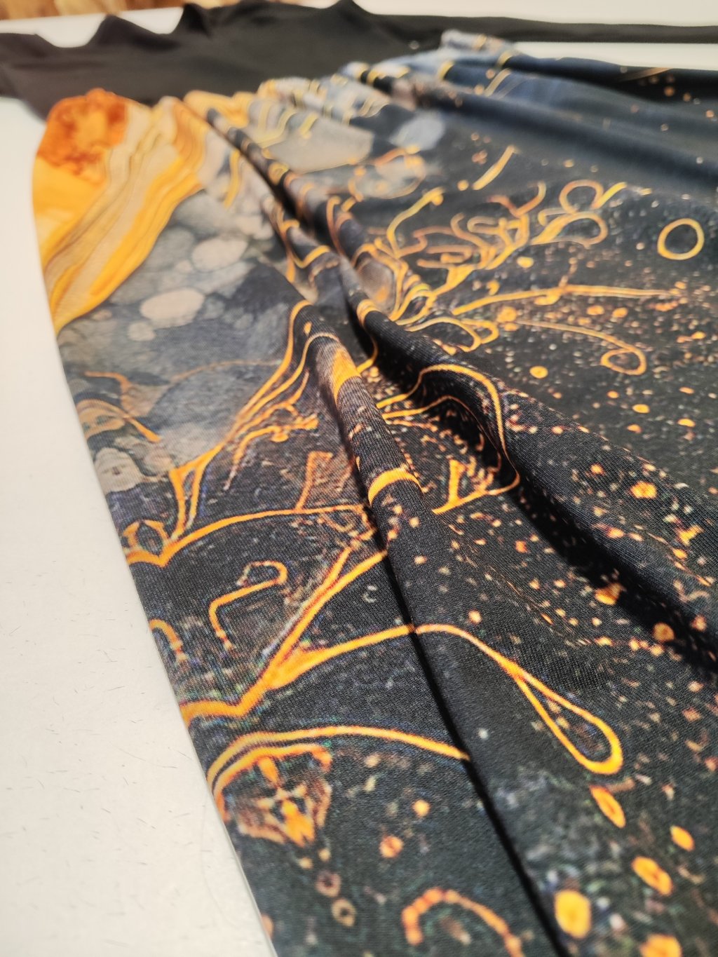 Černá s motivem zlatých vln a ornamentů.