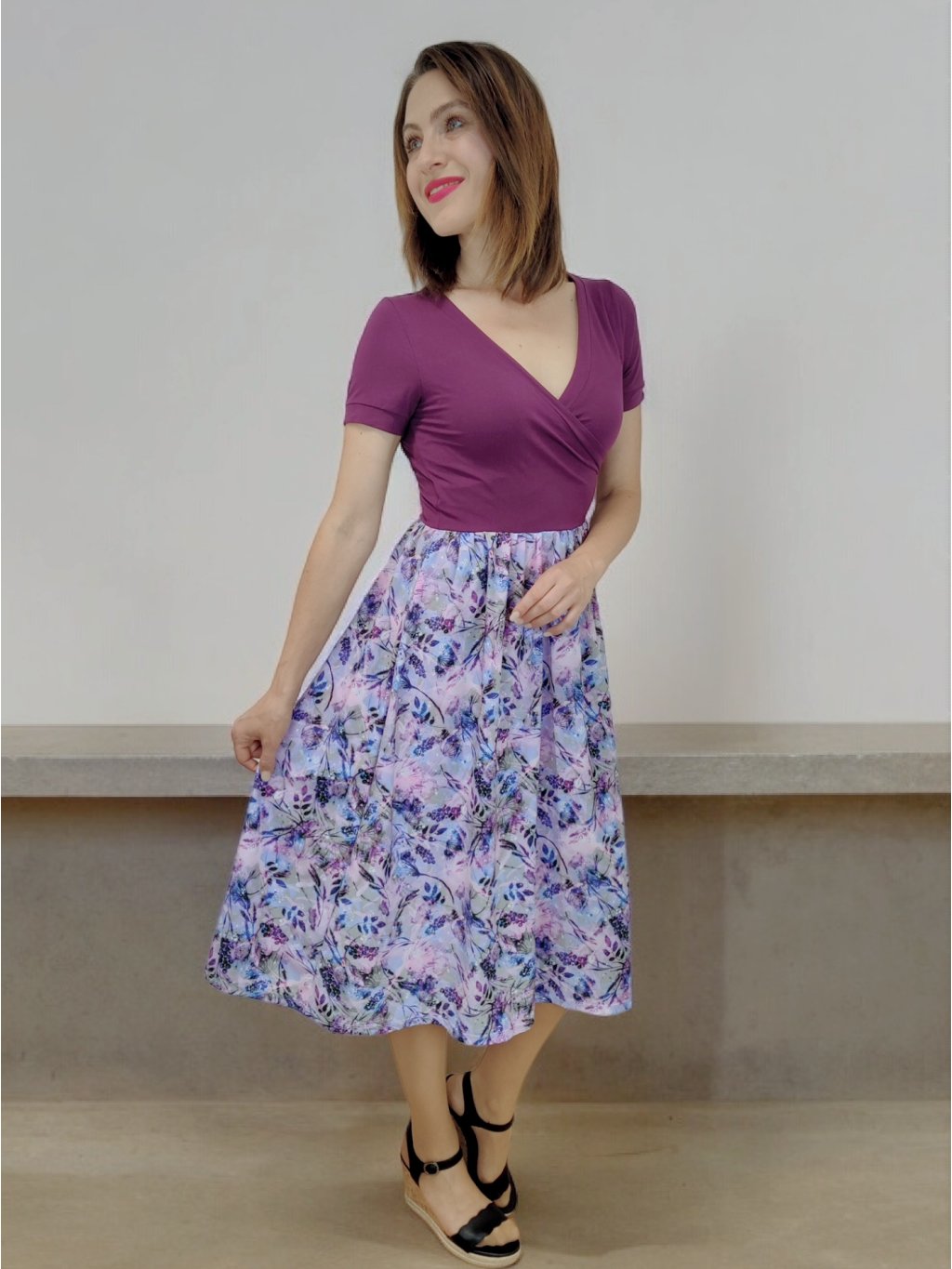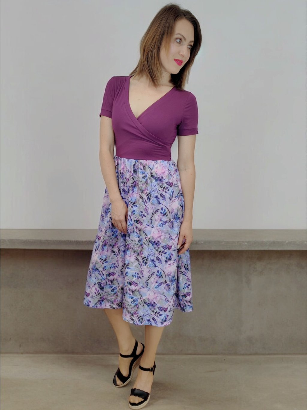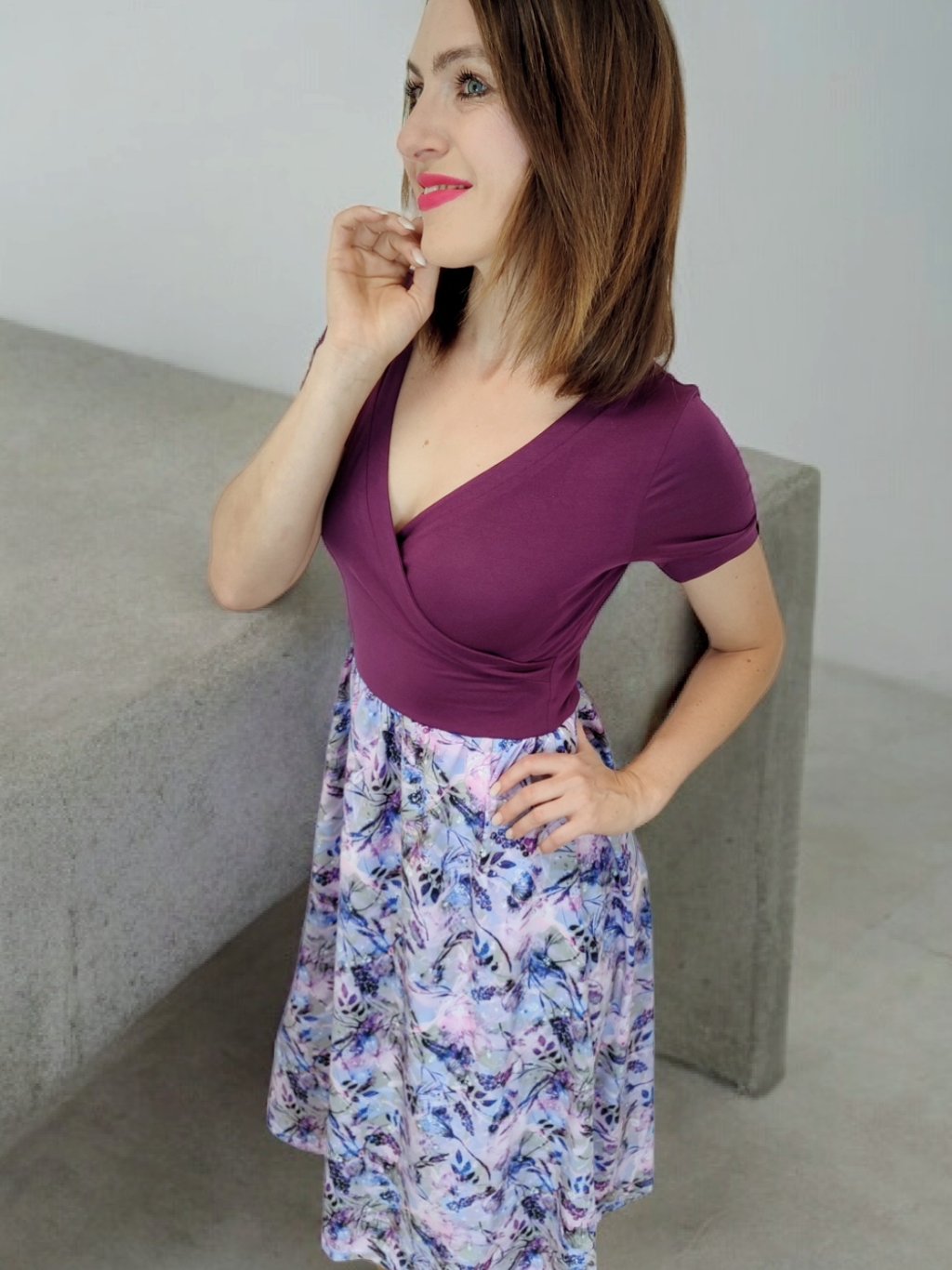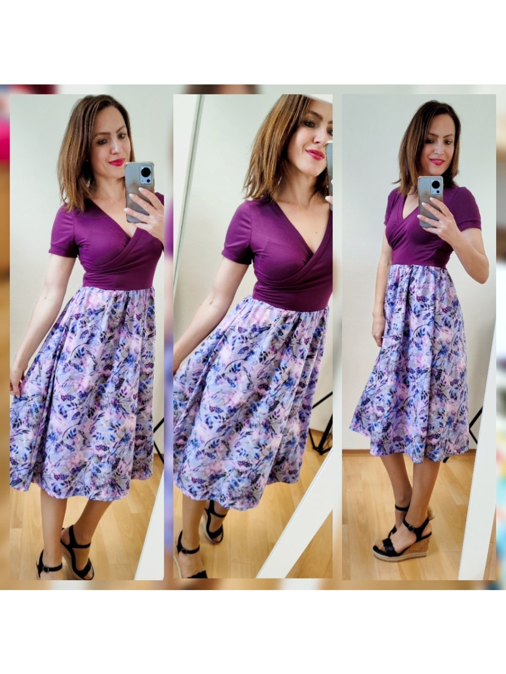 Vrchní část šatů je z materiálu Modal - fialová barva. Modal (Tencel) vyniká řadou svých vlastností - je prodyšný, příjemný na nošení, stálobarevný.