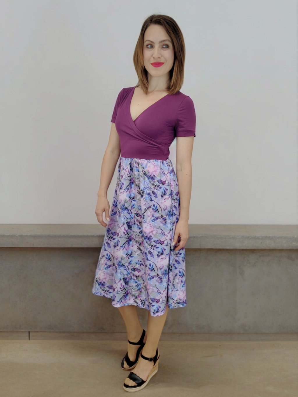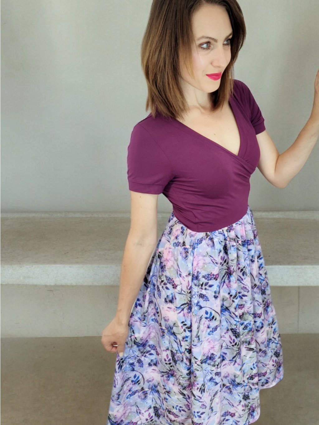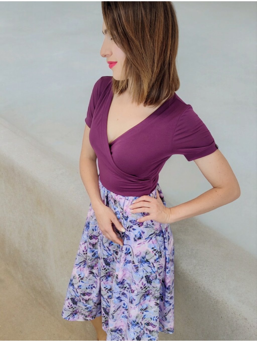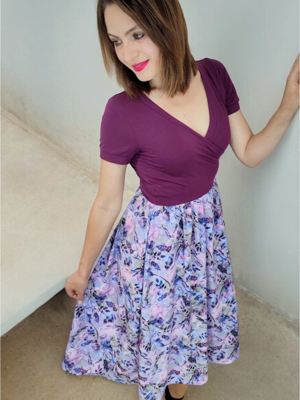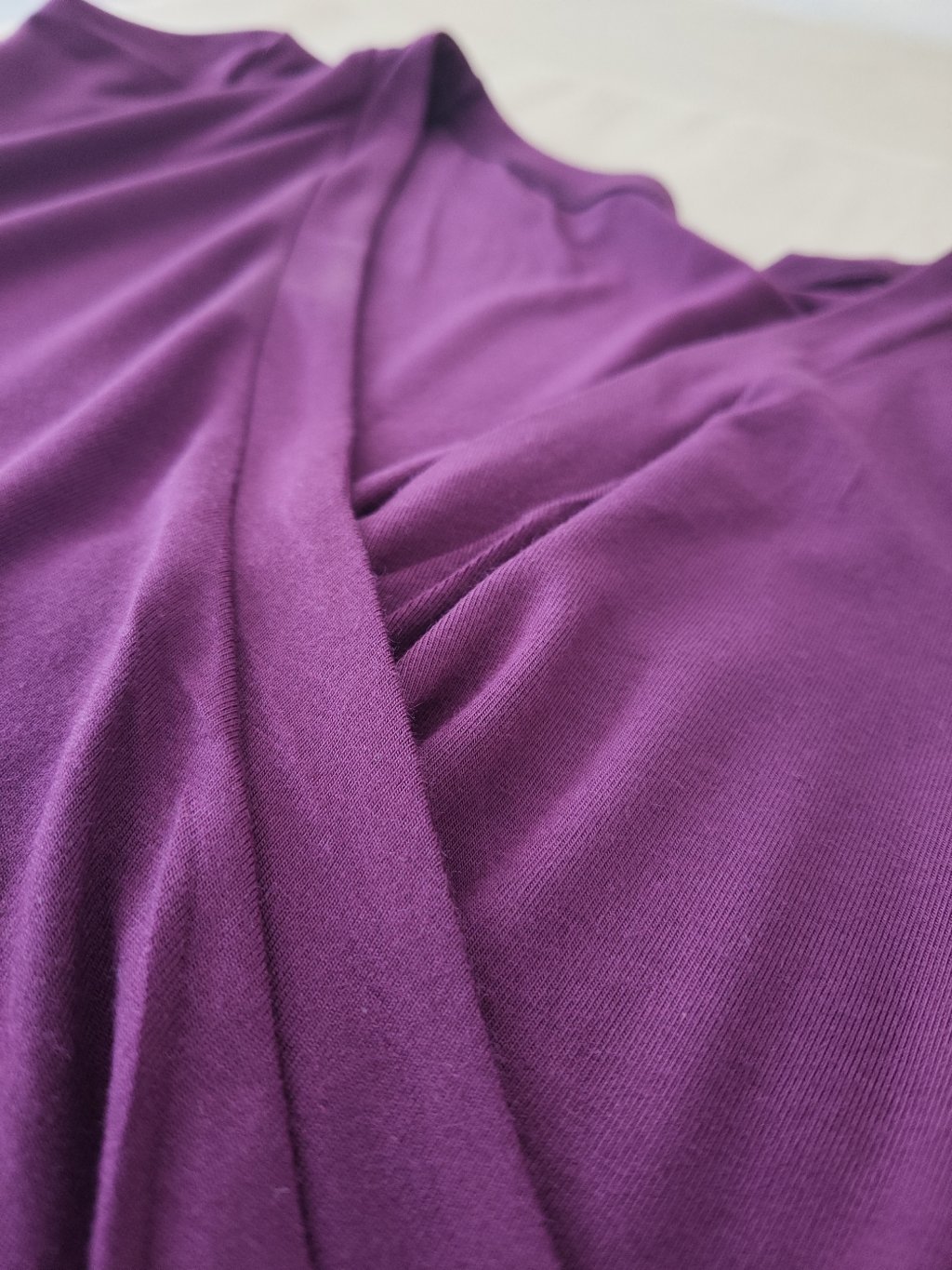 Vrchní část šatů je z materiálu Modal - fialová barva. Modal (Tencel) vyniká řadou svých vlastností - je prodyšný, příjemný na nošení, stálobarevný.