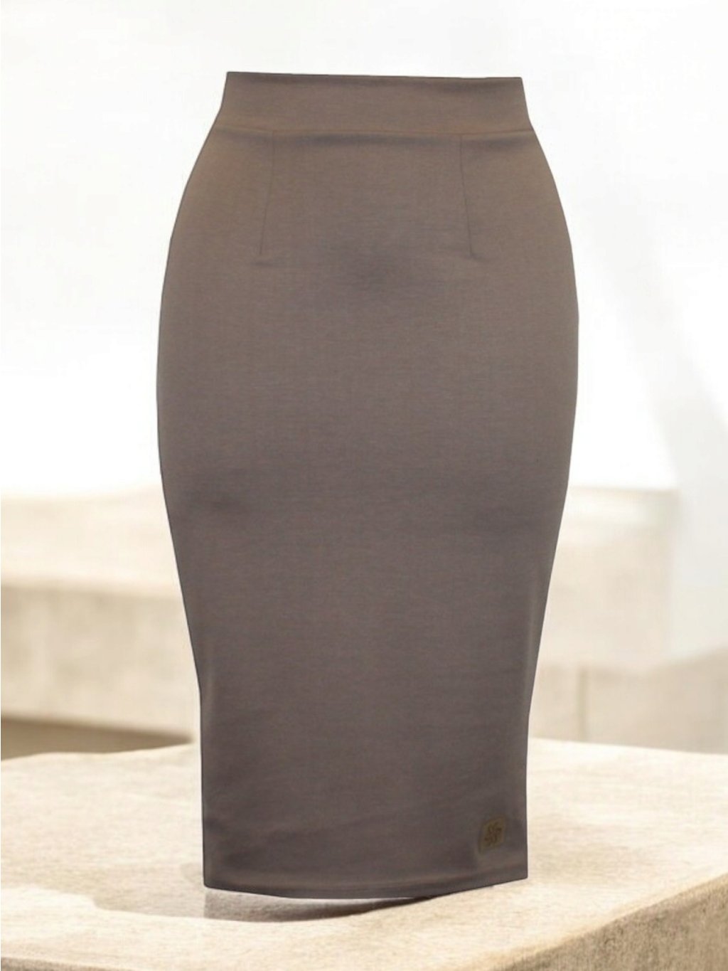 Hnědá pouzdrová sukně do pasu má vypasovaný střih.