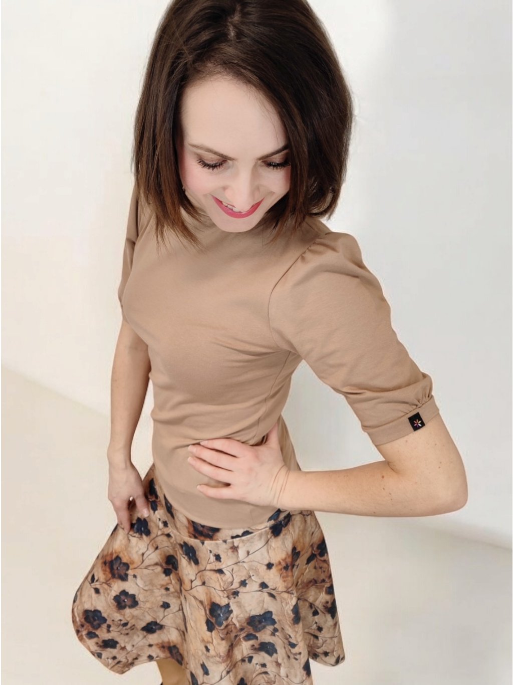 Hnědá barva působí přirozeně a elegantně. Tričko se dobře kombinuje s kolovými sukněmi, sukněmi do pasu i jednoduchými kalhotami. Vytvoří tak outfit, který je stylový a zároveň pohodlný.
