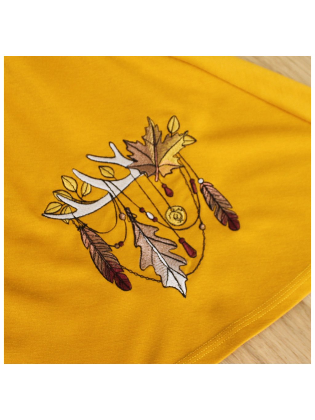 Na boku sukně je vyšitý obrázek - podzimní lapač.