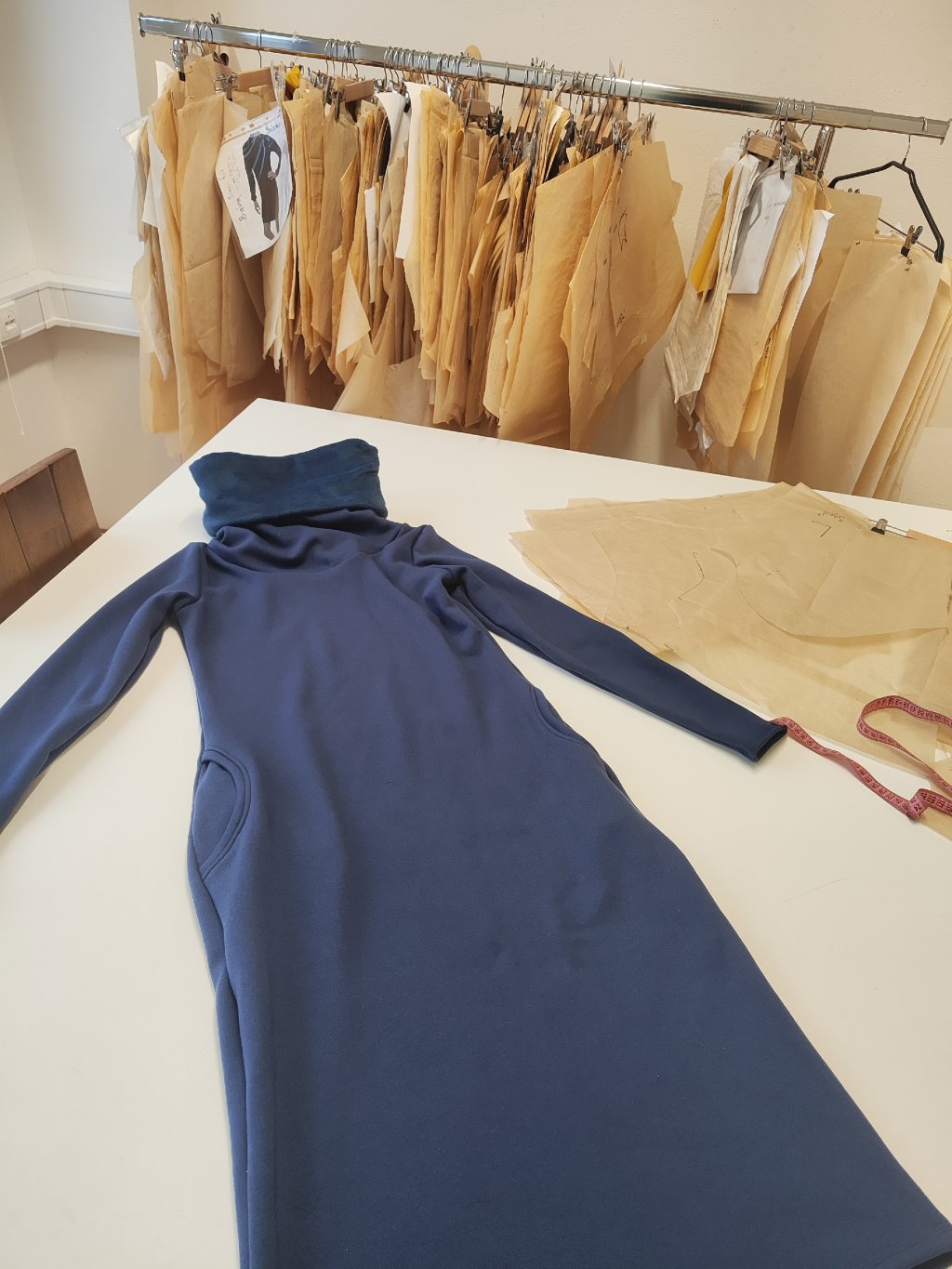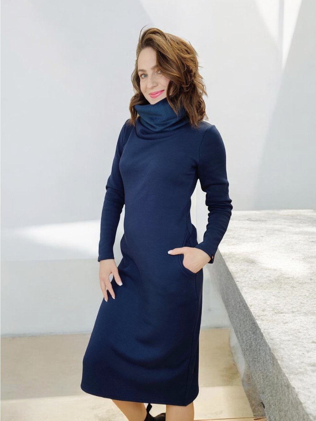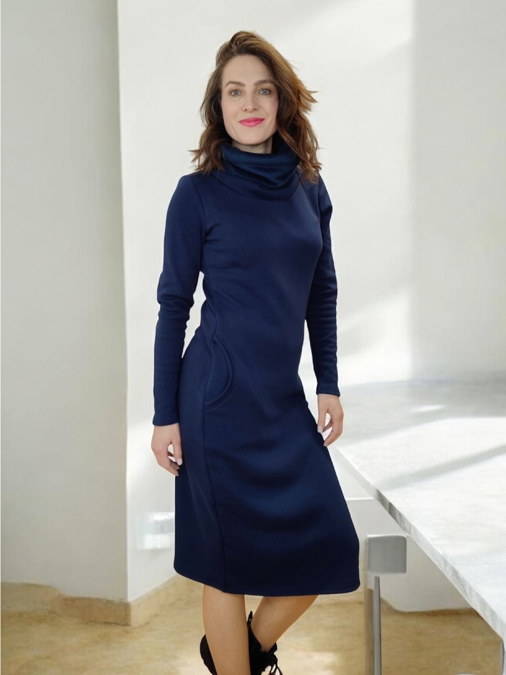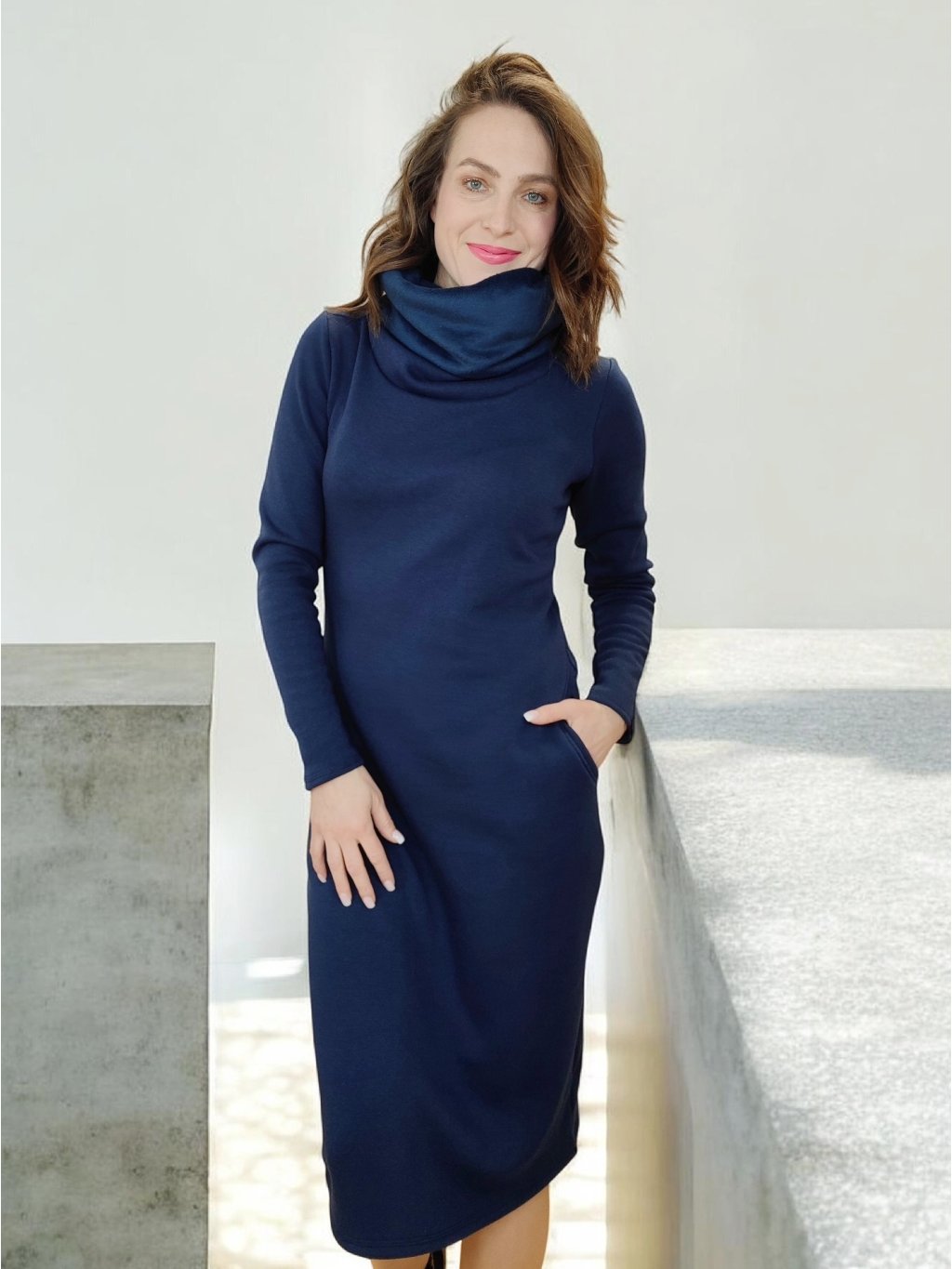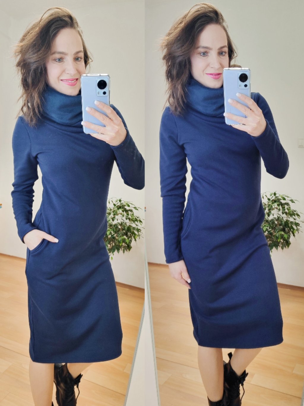 Střih šatů je navržen tak, že příjemně přiléhá přes trup, čímž krásně modeluje postavu, a zároveň dbá na volnost přes boky, aby se v nich dalo pohodlně sedět i chodit. Bohatý rolák je hřejivým detailem, který zároveň působí elegantně a přináší pocit komfortu během chladných dnů. Spodní část šatů je zakončena hladce, což podtrhuje jejich nadčasový charakter a dodává šatům univerzální styl. Šaty se snadno kombinují s vysokými kozačkami, teplými punčochami i zimní bundou.