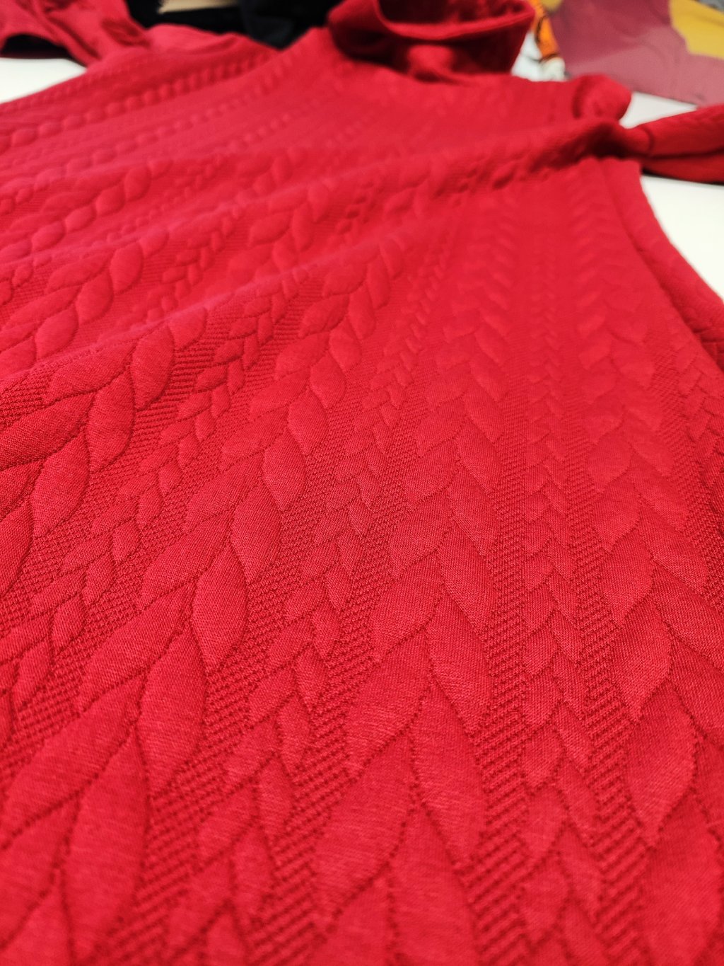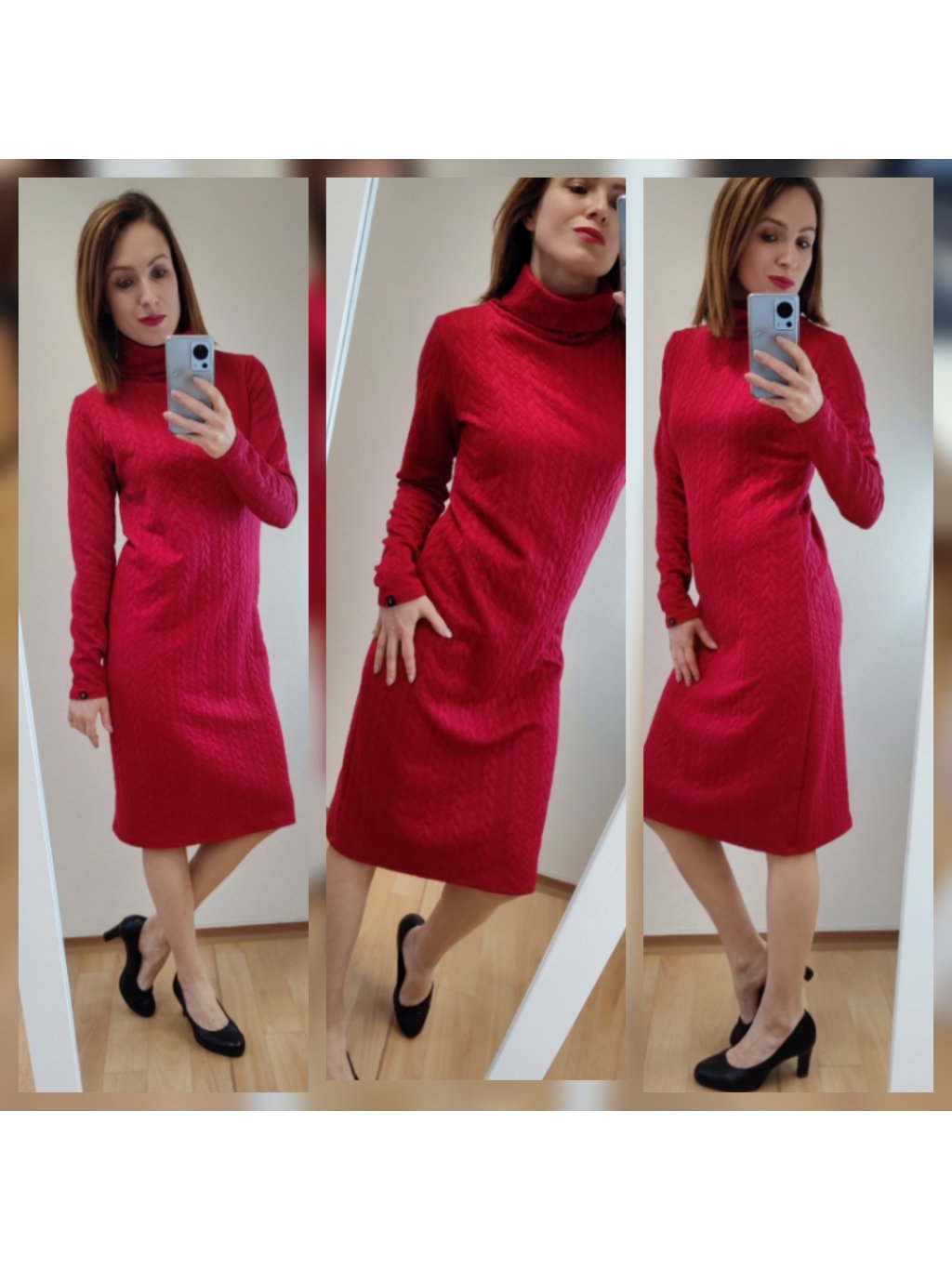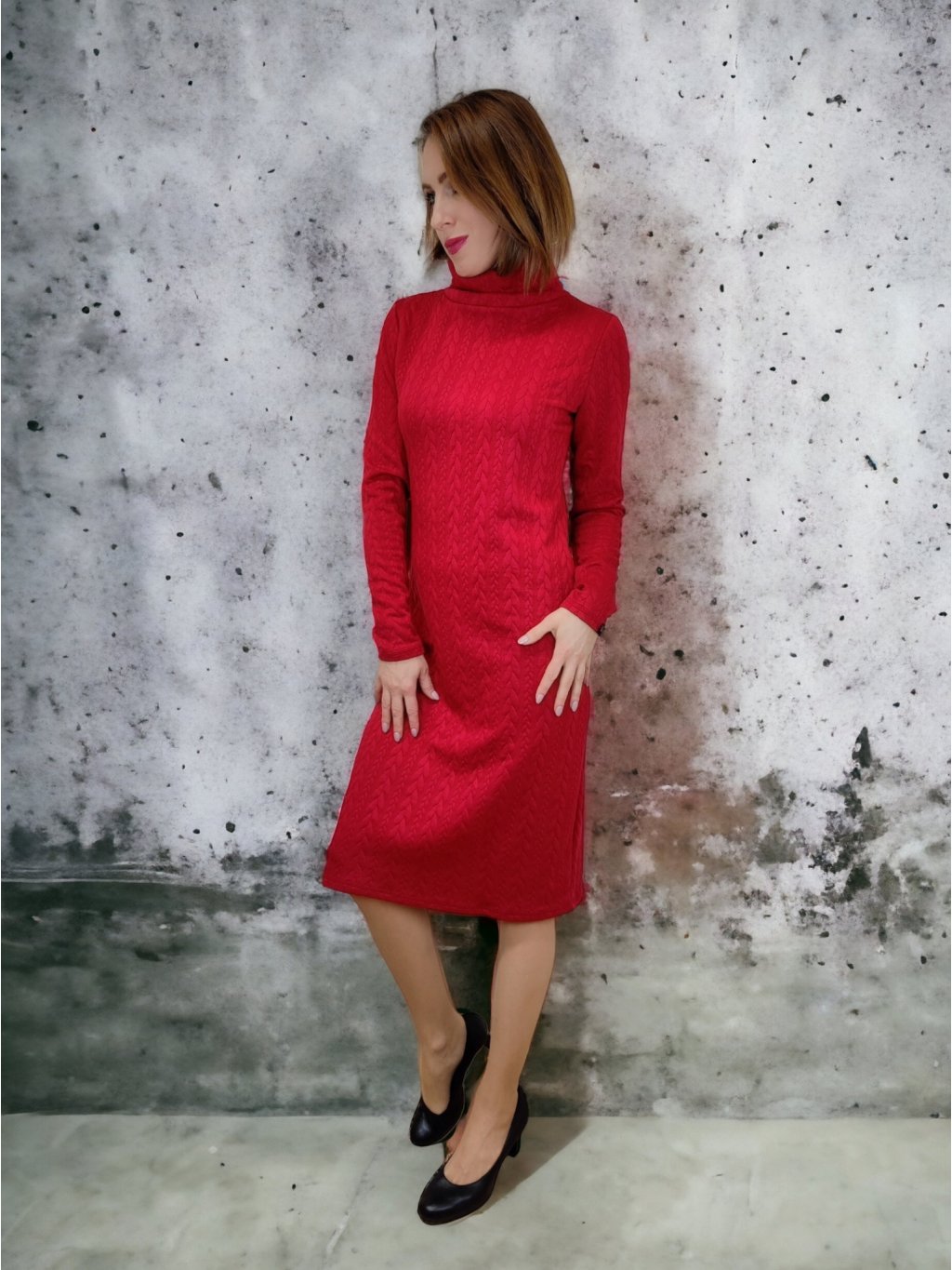 Červené dámské šaty jsou ušité ze silnějšího materiálu s plastickým vzorem copánků.