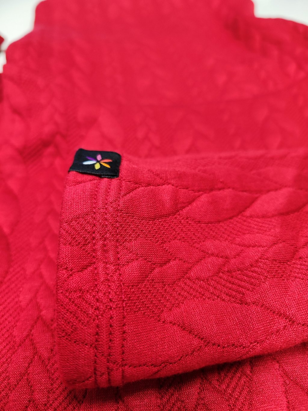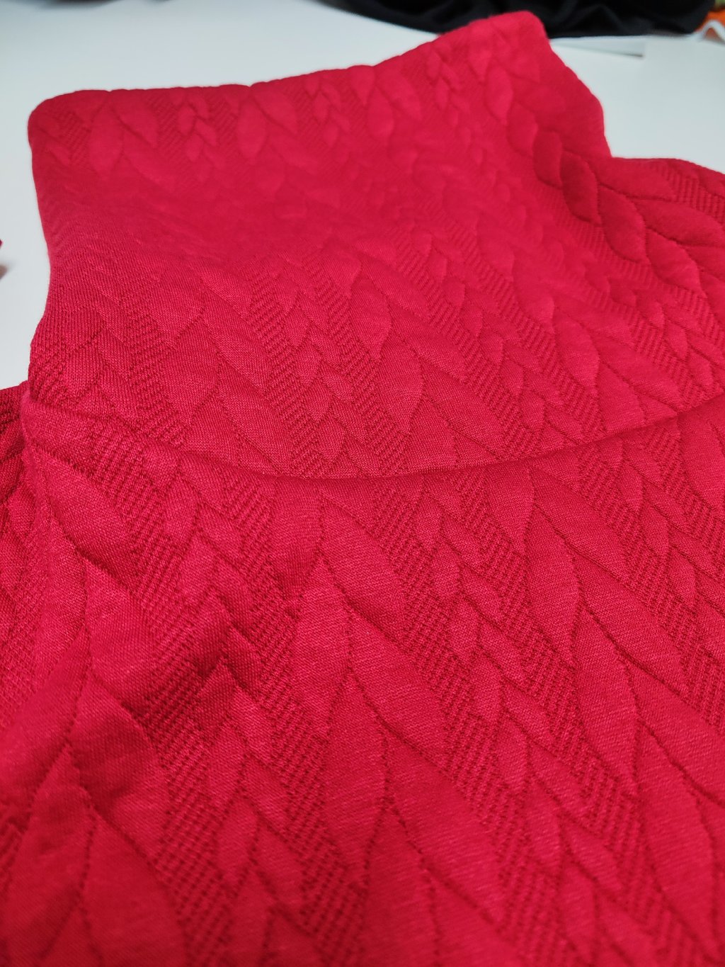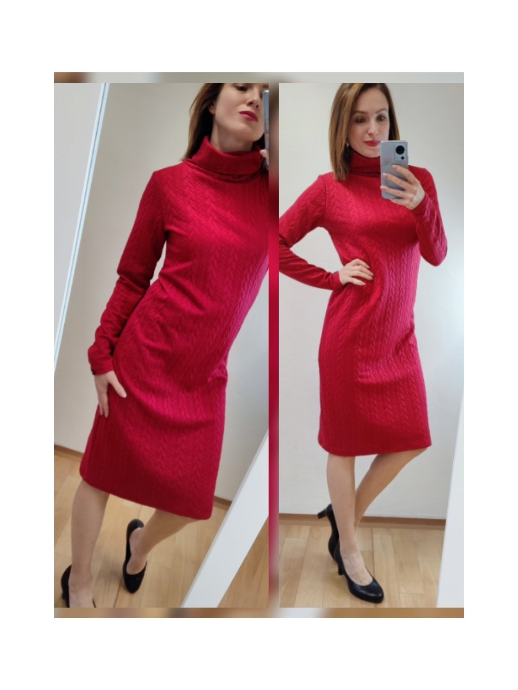 Červené dámské šaty jsou ušité ze silnějšího materiálu s plastickým vzorem copánků.