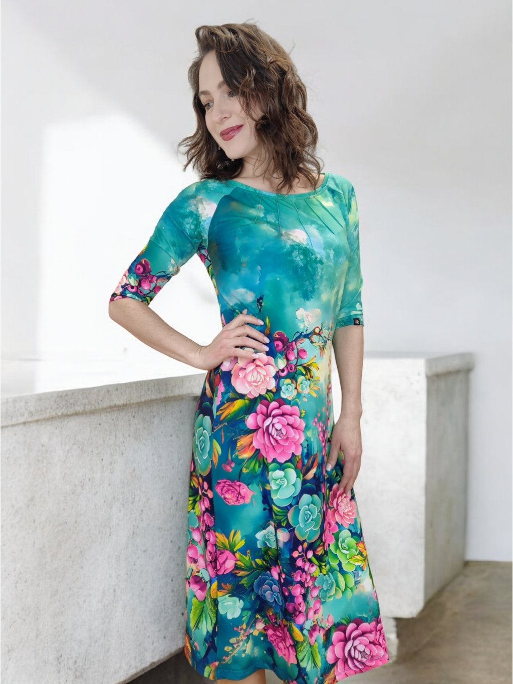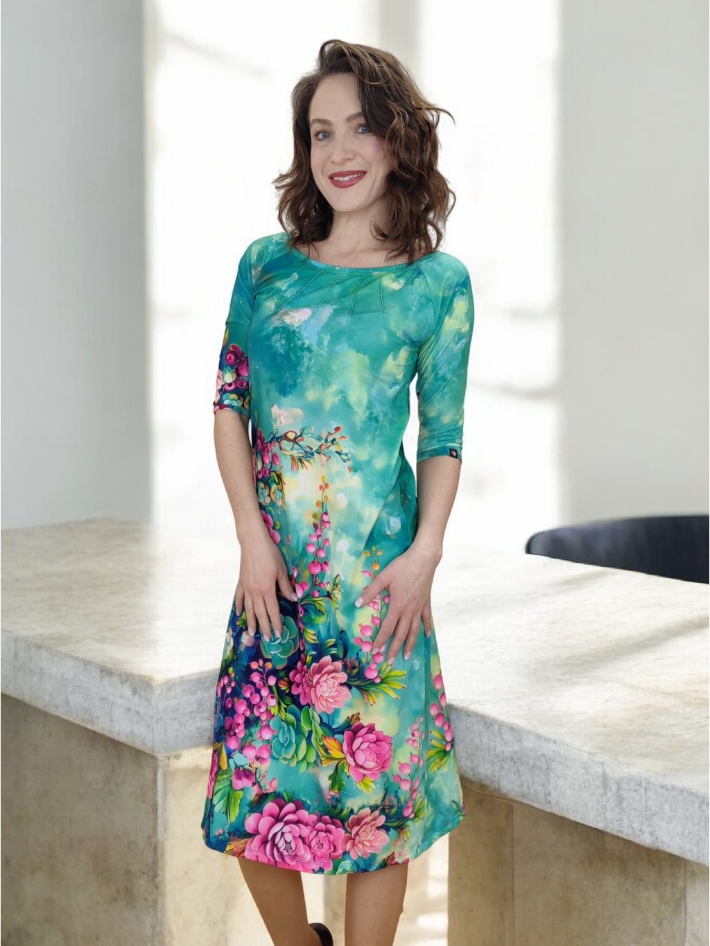 Jarní šaty mají polopřiléhavý střih, který se směrem dolů jemně rozšiřuje do áčka. Poskytují volnost v oblasti boků i bříška a lichotí různým typům postav. Širší výstřih jemně odhaluje dekolt a 3/4 rukávy jsou ideální pro jarní období. Tyto jarní šaty můžete nosit volně nebo s páskem pro zvýraznění pasu.