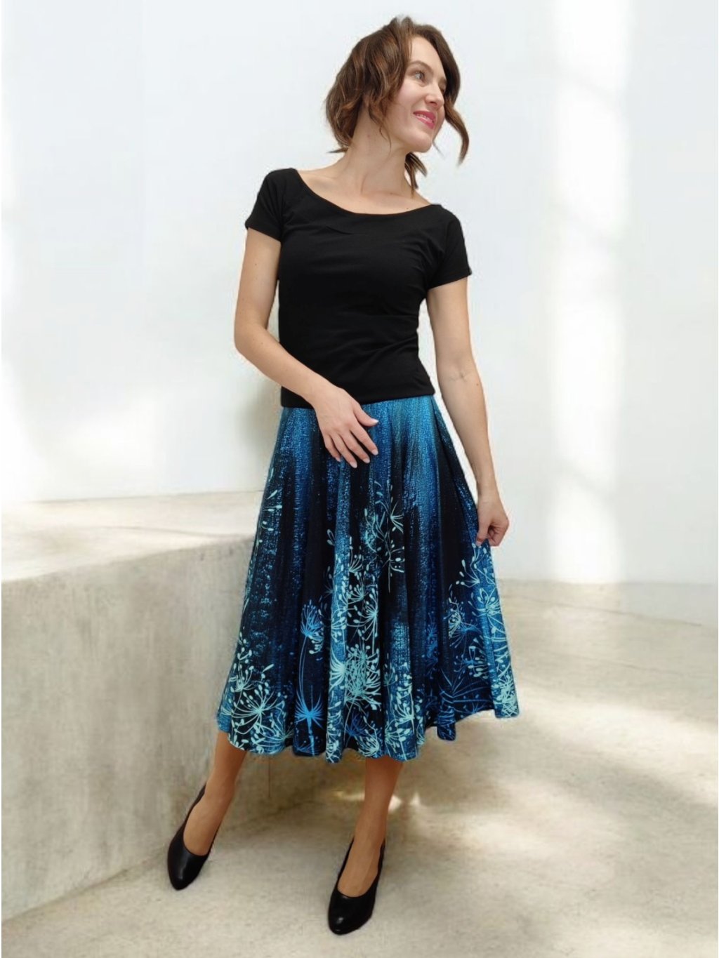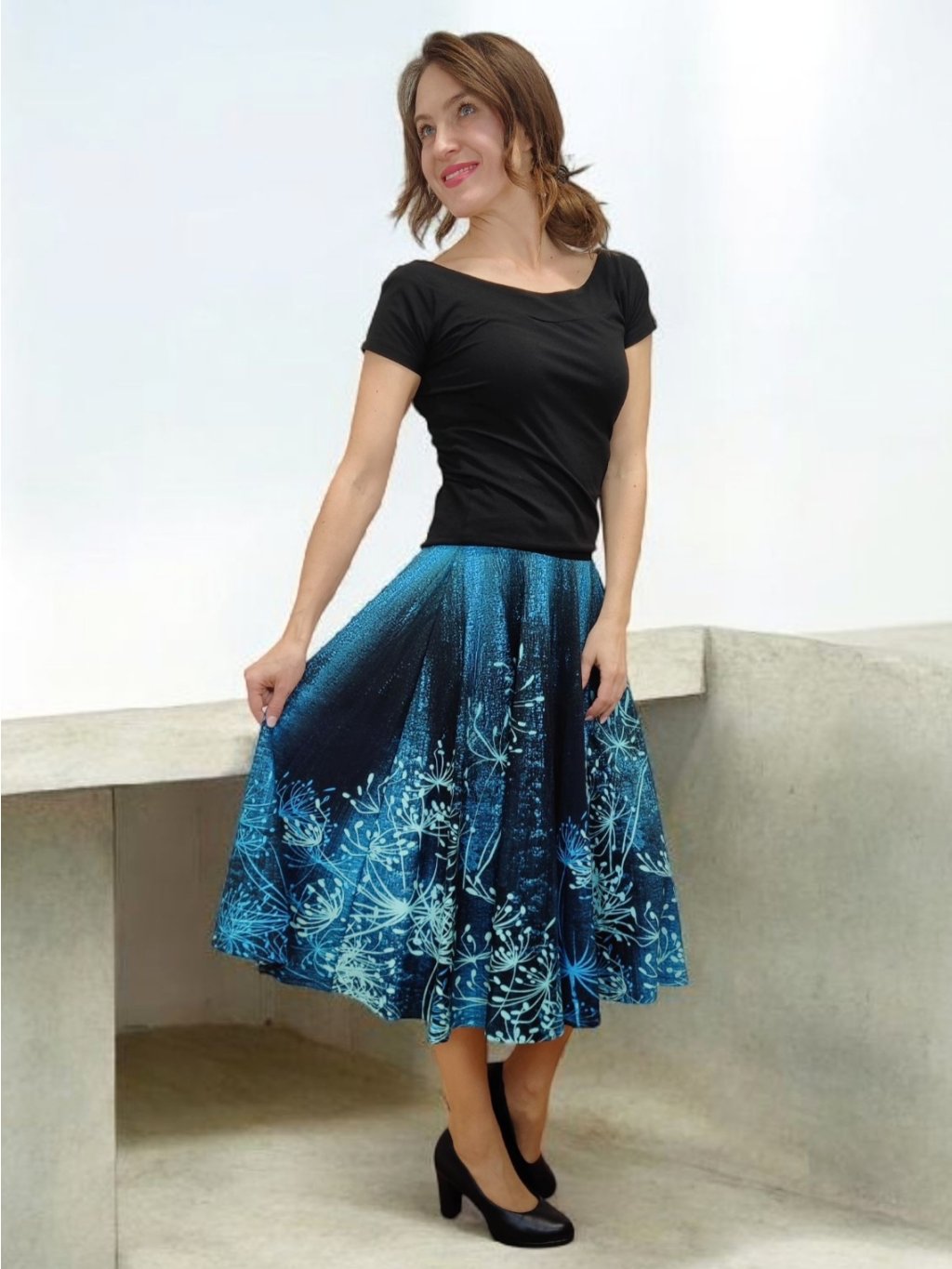Sukně je kolová, bohatě se vlní. Sukně se nosí v pase nebo na bocích. V pase je pohodlný černý úplet.