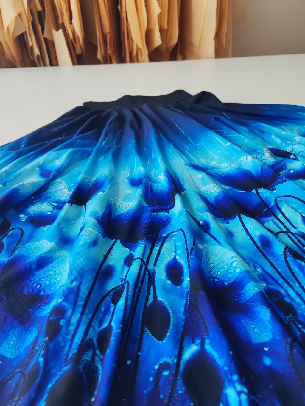 Tato kolová sukně je snem v modré barvě, která přináší pocit klidu i elegance. Bohatě točivý střih dokáže rozzářit každý pohyb a zároveň nabízí komfort díky pohodlnému úpletovému pásu. Hodí se jak pro denní nošení s tričkem, tak pro večerní výjimečné chvíle s halenkou. Vyrobená v České republice z kvalitních materiálů, je to sukně pro ženy, které hledají výrazný a přitom nositelný kousek.